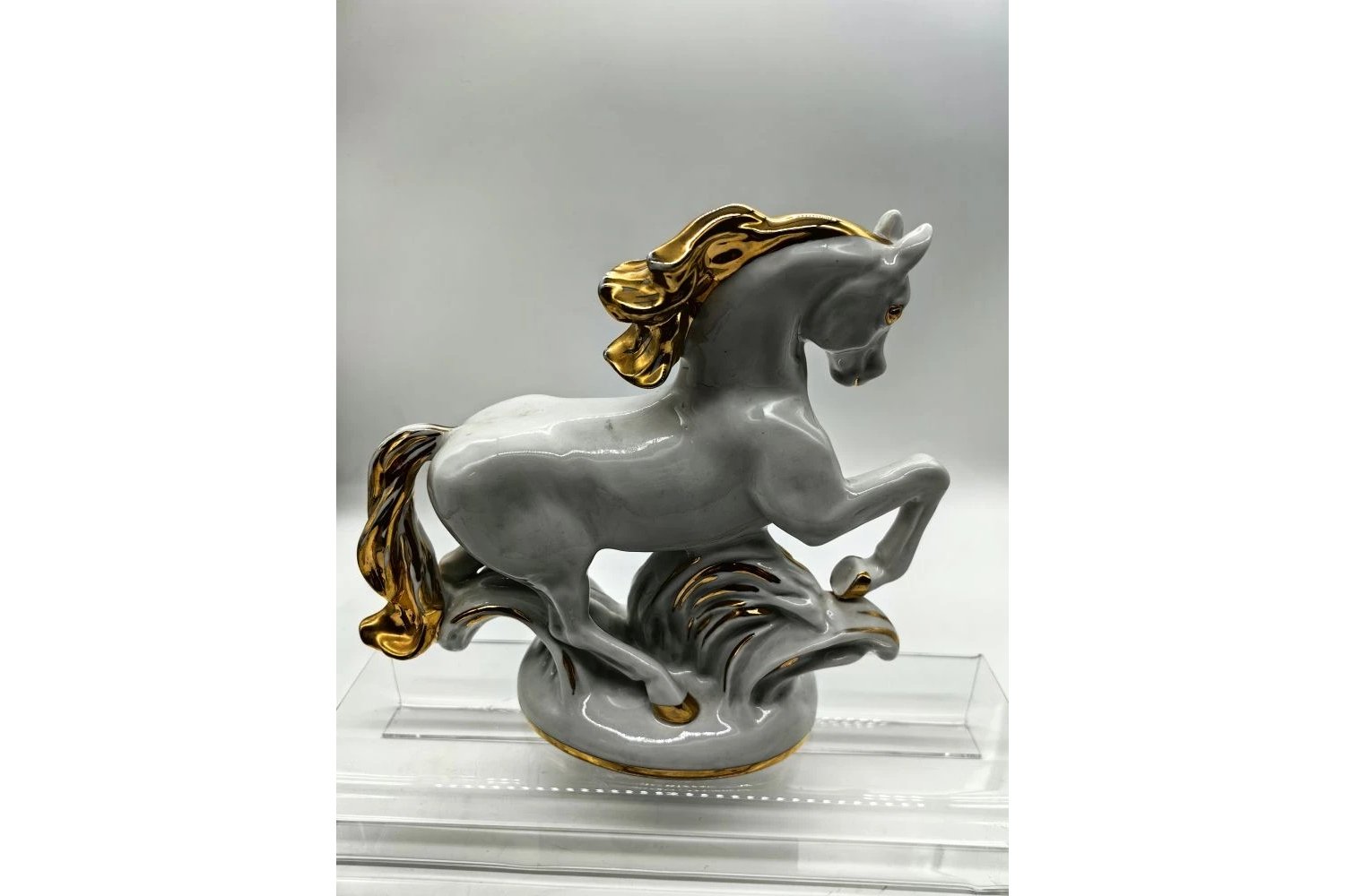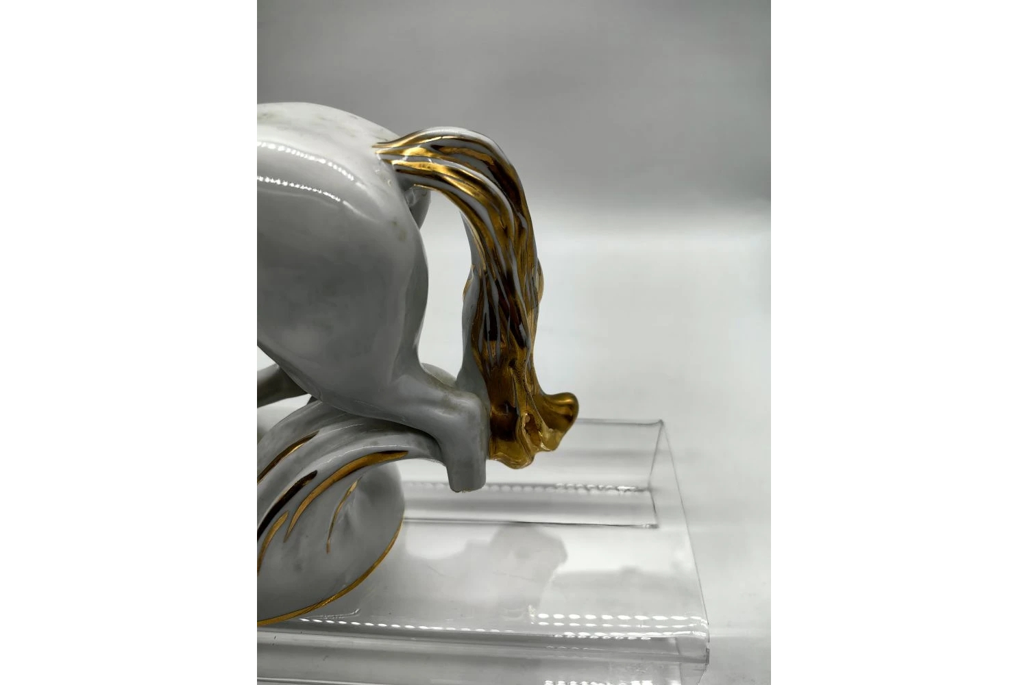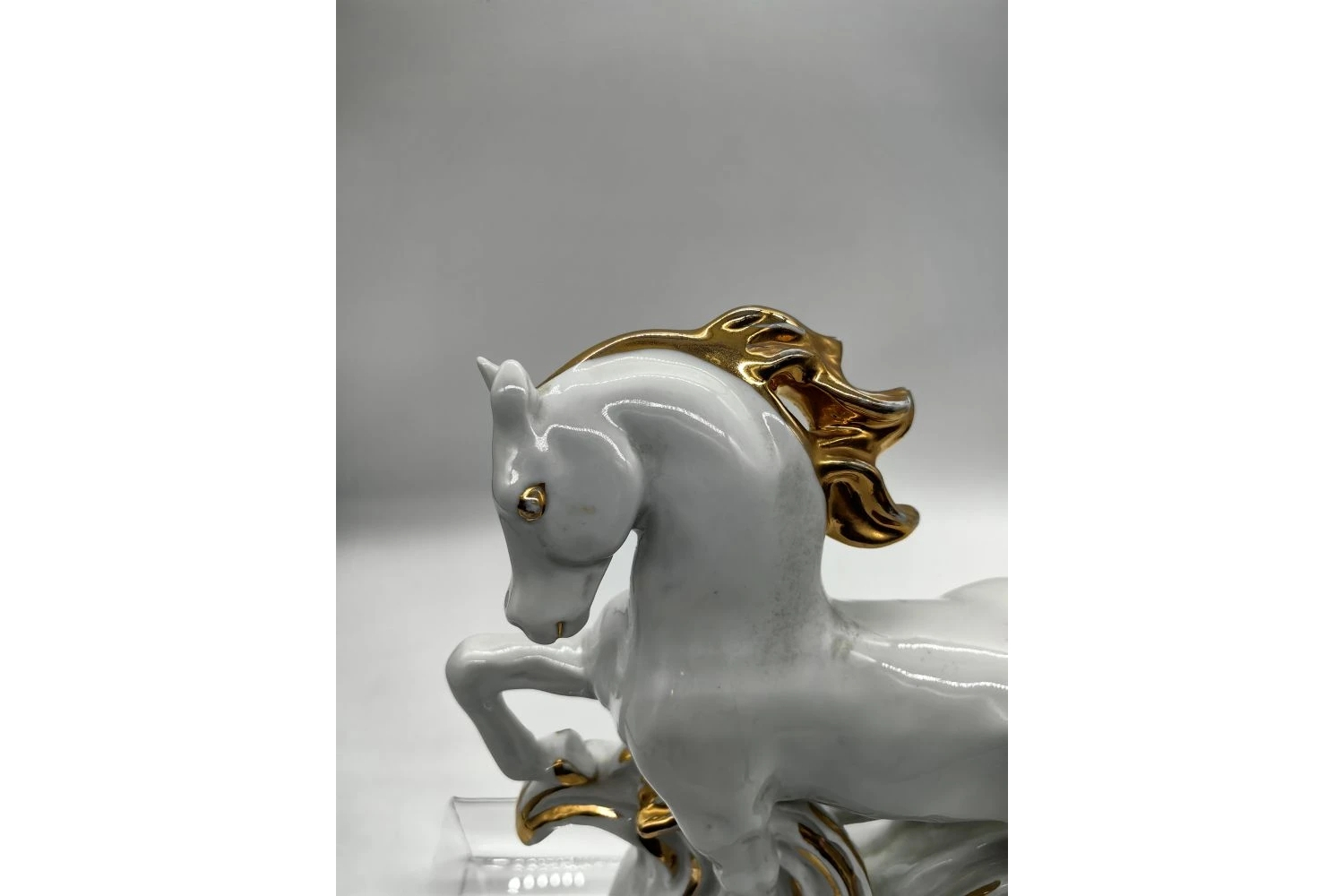 Изделие выполнено из фарфора с художественной росписью и элементами позолоты, что придаёт ему нарядный и торжественный вид. Поверхность тщательно проработана: видны детализированные текстуры — шерсть, грива, копыта.