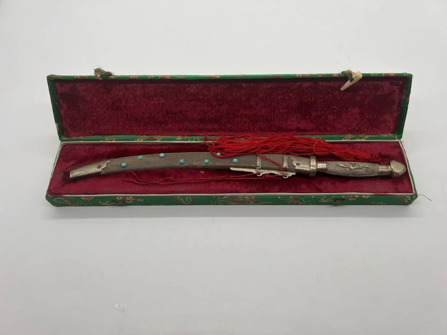 Нож для писем с вставками бирюзы, произведённый в Китае в 1950-х годах, представляет собой сочетание утилитарного предмета и художественного изделия. Такие ножи часто изготавливались в форме традиционной китайской сабли дао, что придавало им особый колорит.