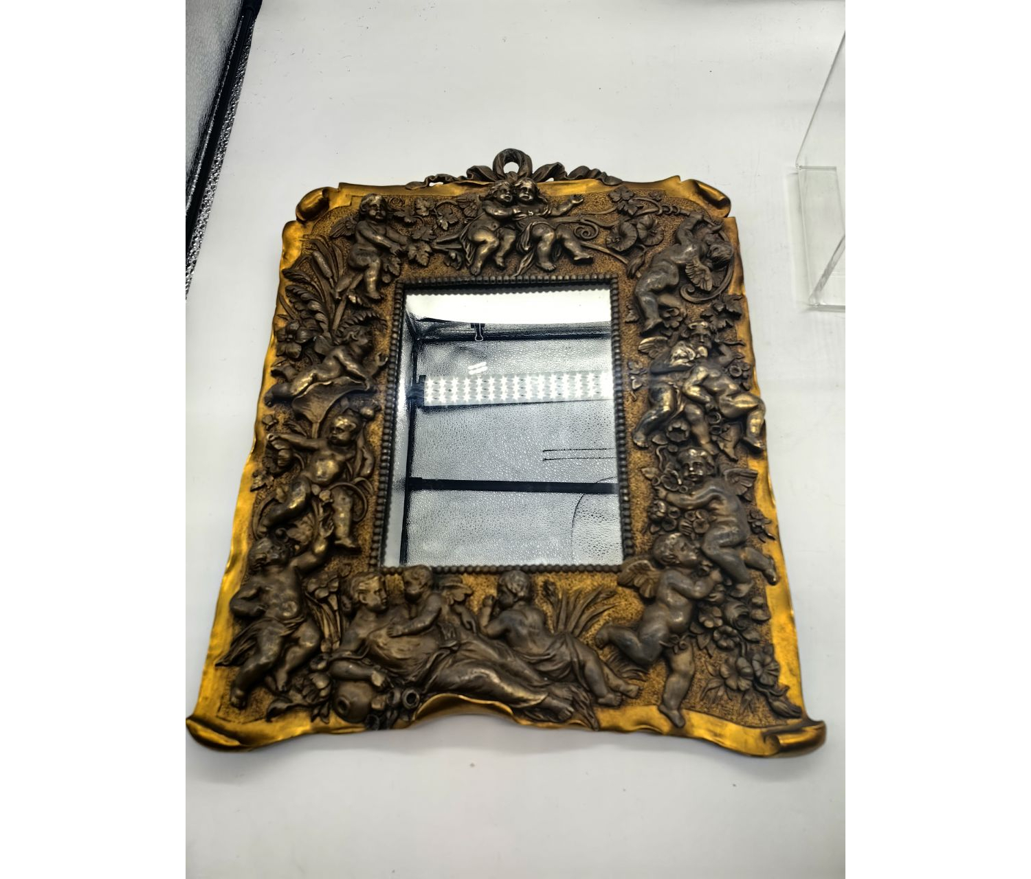 Антикварные бронзовые рамки для фотографий или зеркал с изображением ангелочков — это изысканные предметы интерьера, которые сочетают художественную ценность и историческую значимость. Они часто украшены рельефными фигурами ангелов, путти (маленьких крылатых существ) или херувимов, что характерно для стилей барокко, рококо или модерна . 19 Век.