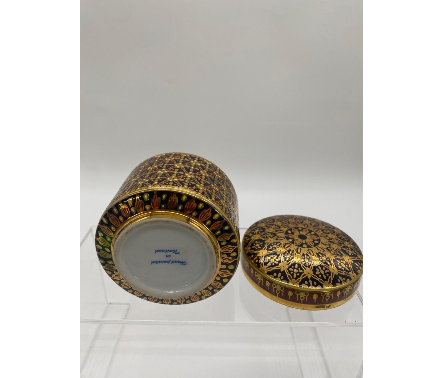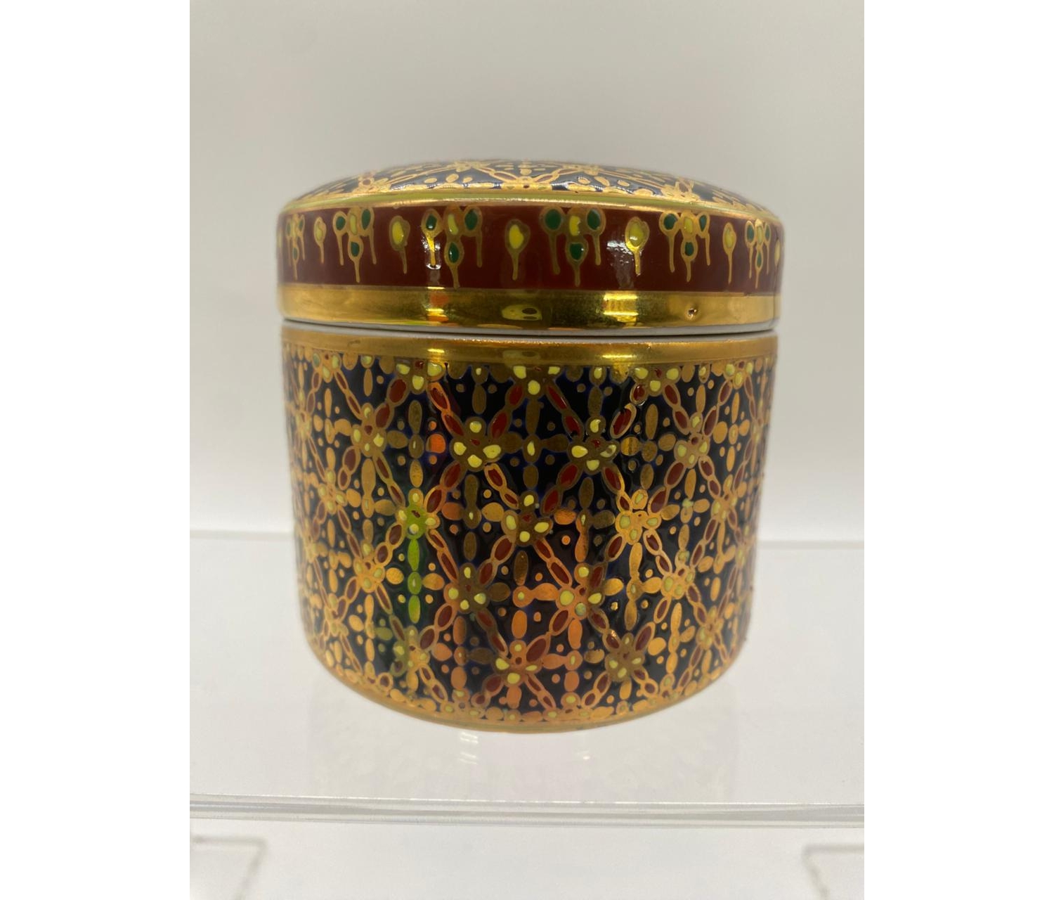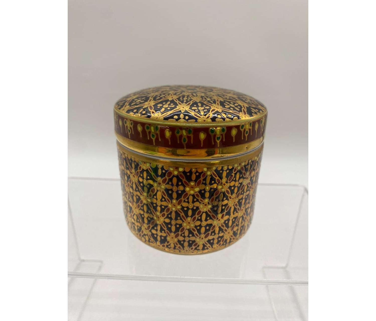 Эта бонбоньерка находится в отличном состоянии, что позволяет ей сохранять свой первоначальный блеск и красоту. Диаметр изделия составляет 6,5 см, а высота — 8 см, что делает ее компактной и изящной.
