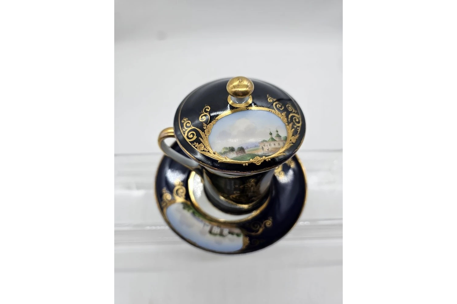 Чайная пара с панорамой Московского Кремля, выпущенная на заводе А. Г. Попова, представляет собой антикварный предмет XIX века, обладающий художественной и коллекционной ценностью.