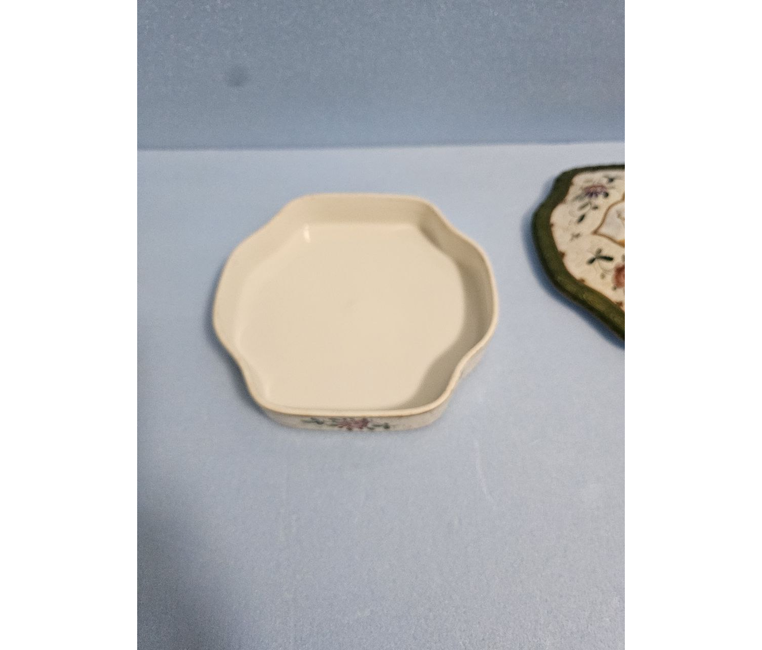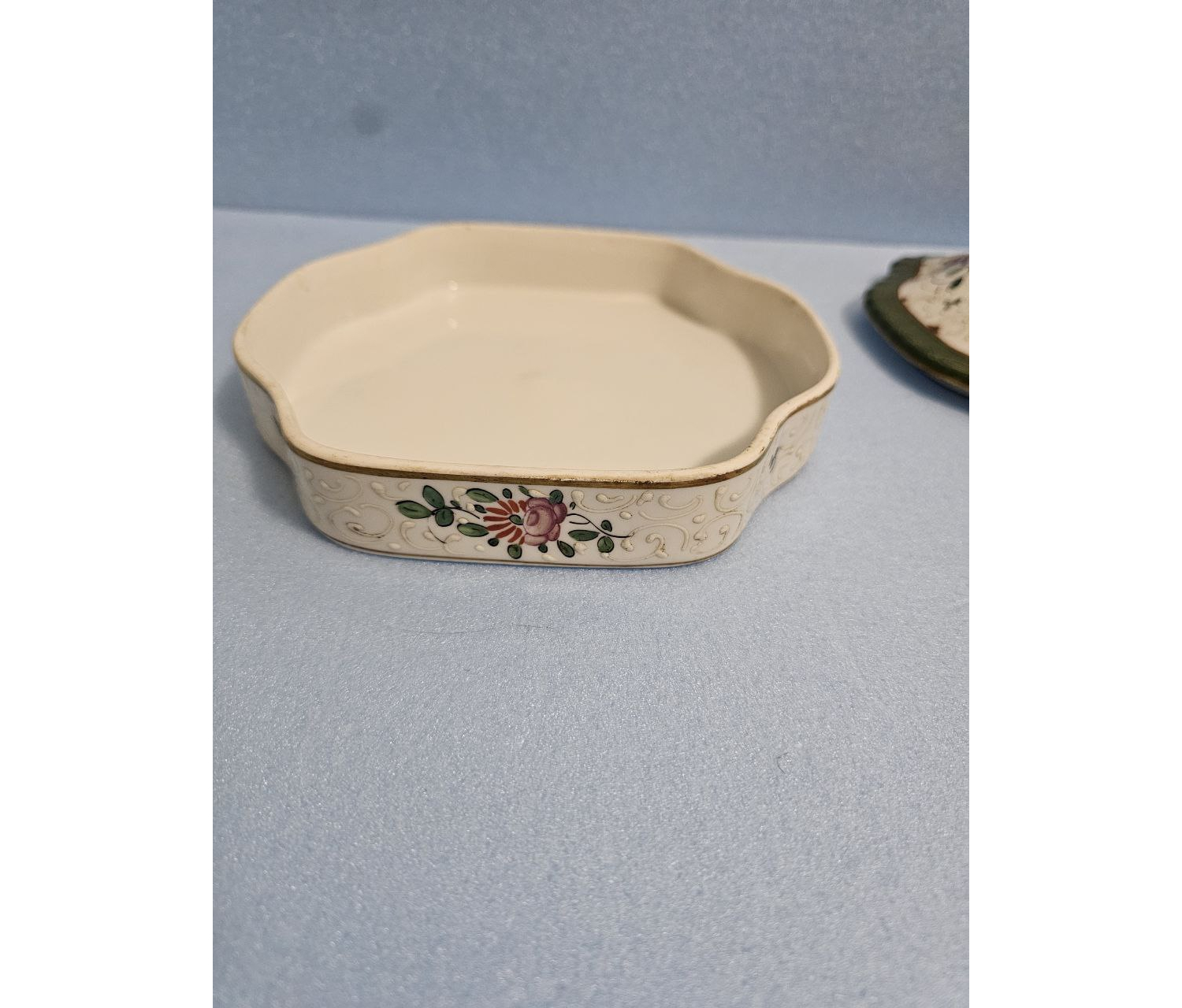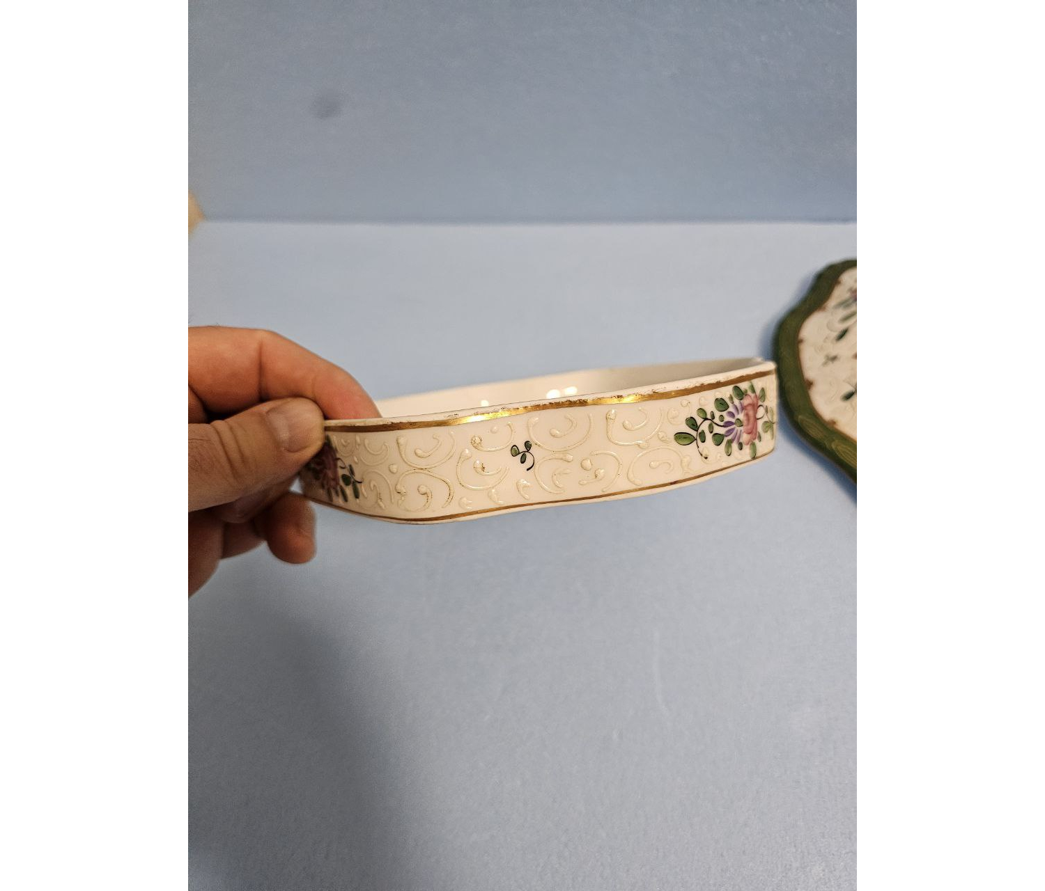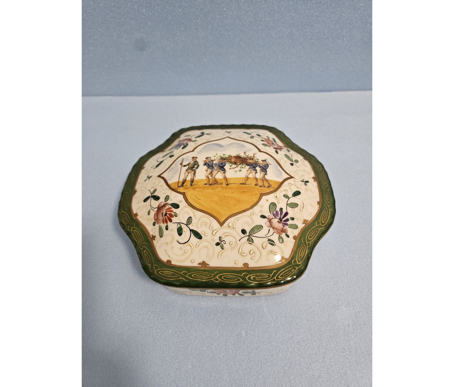 Шкатулка имеет прямоугольную форму с закругленными углами и слегка выпуклой крышкой. Роспись выполнена в нежных тонах, с использованием тонких линий и плавных переходов цветов. На крышке изображен, вероятно, пейзаж или цветочный мотив, характерный для французской декоративной живописи того времени.
