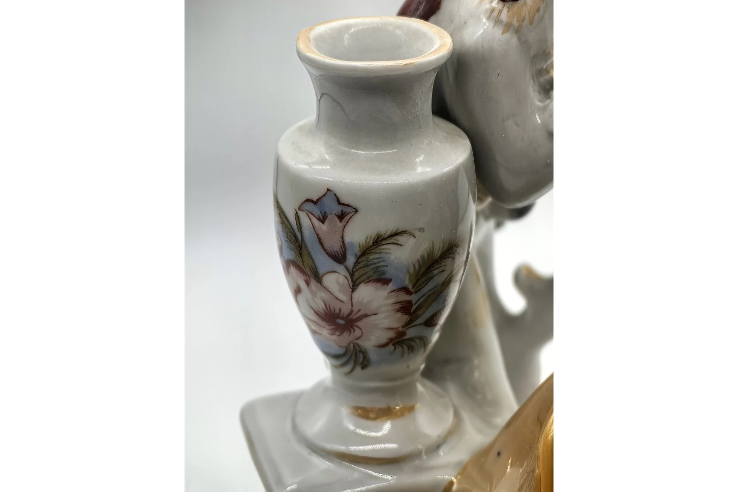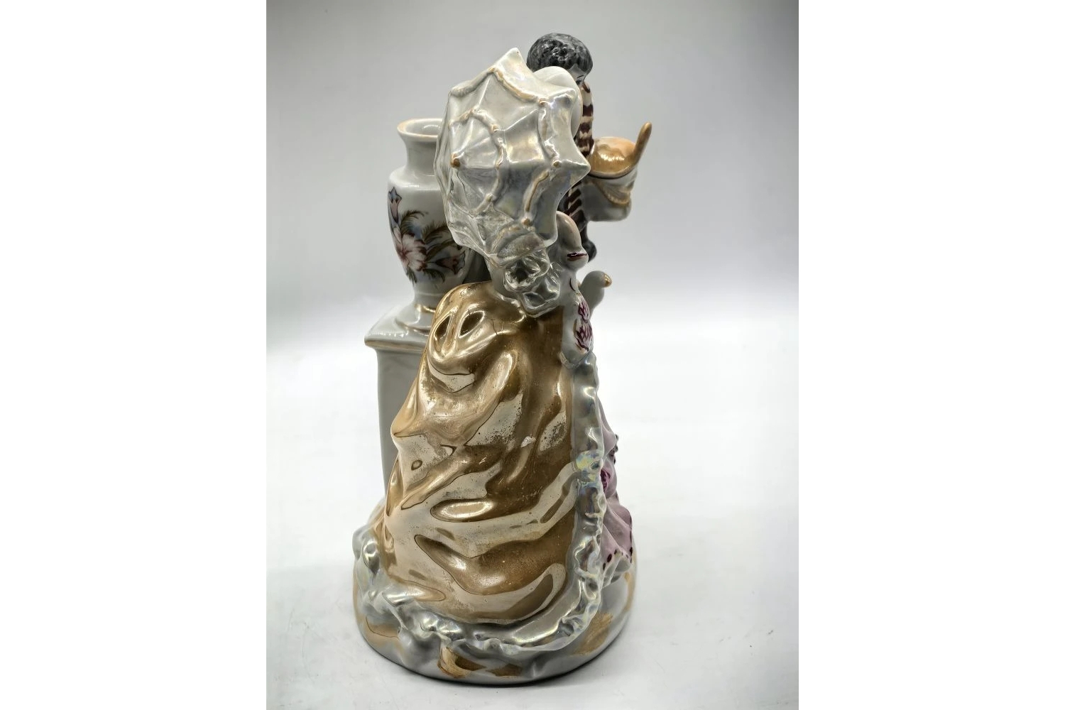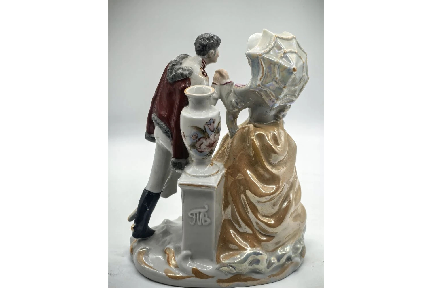 Изящный образец украинского фарфорового искусства эпохи СССР — статуэтка с двойной функцией: эффектный интерьерный элемент и функциональный подсвечник. Романтический сюжет и тонкая работа делают эту вещь желанным экспонатом для коллекционеров и ценителей винтажа.