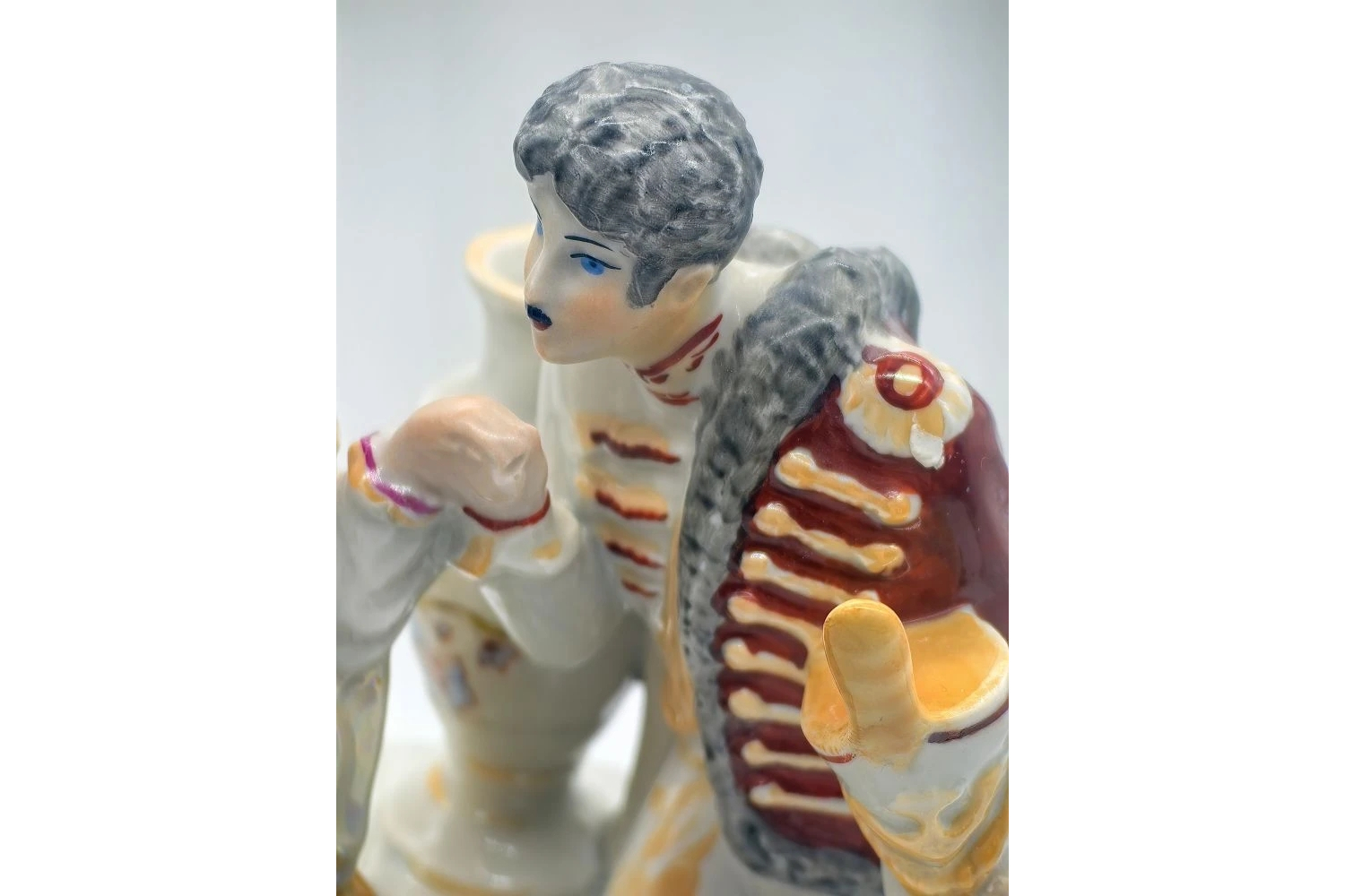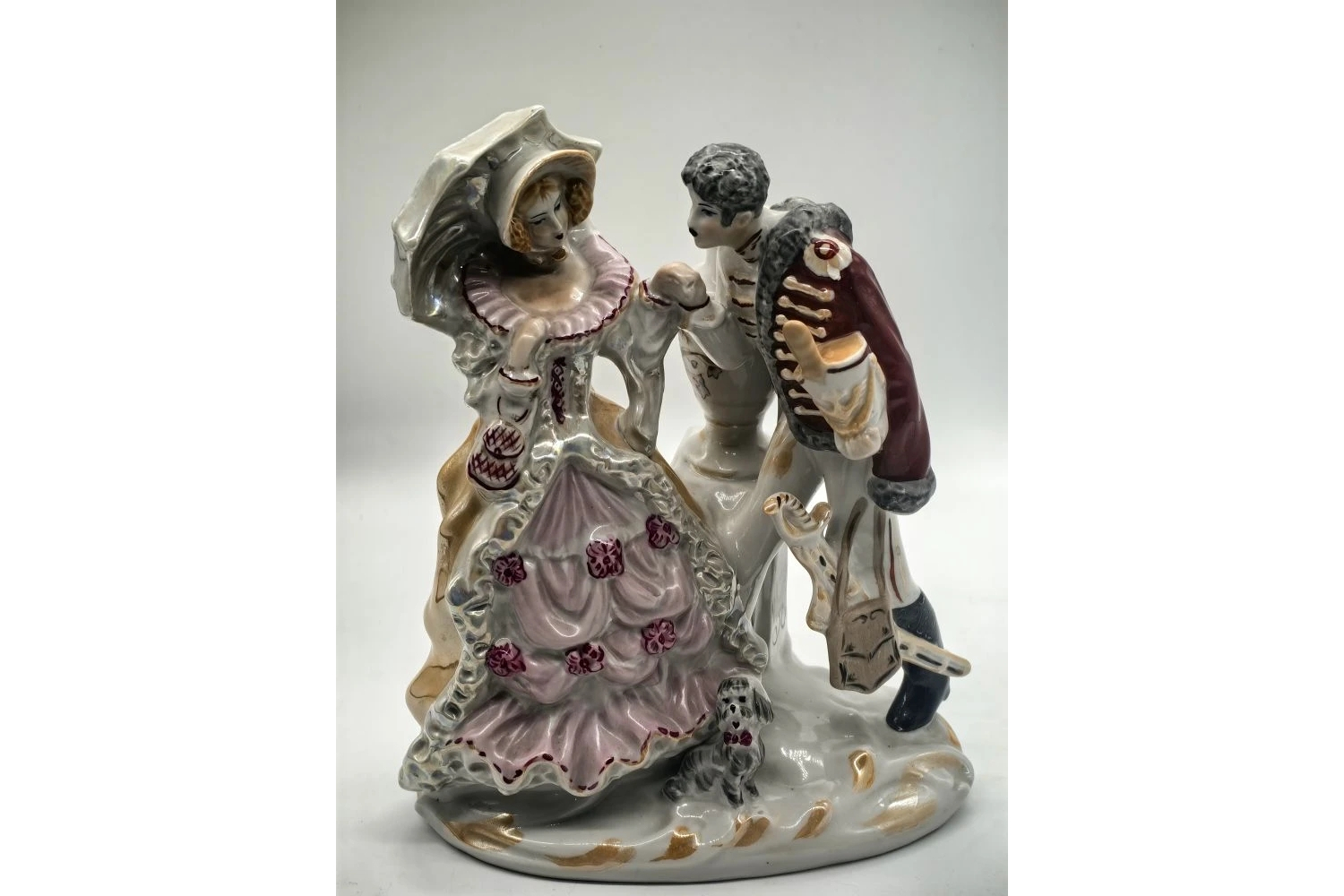 Композиция воплощает романтическую сцену встречи гусара и дамы — популярный сюжет в фарфоровой пластике советского периода. Особенности исполнения: