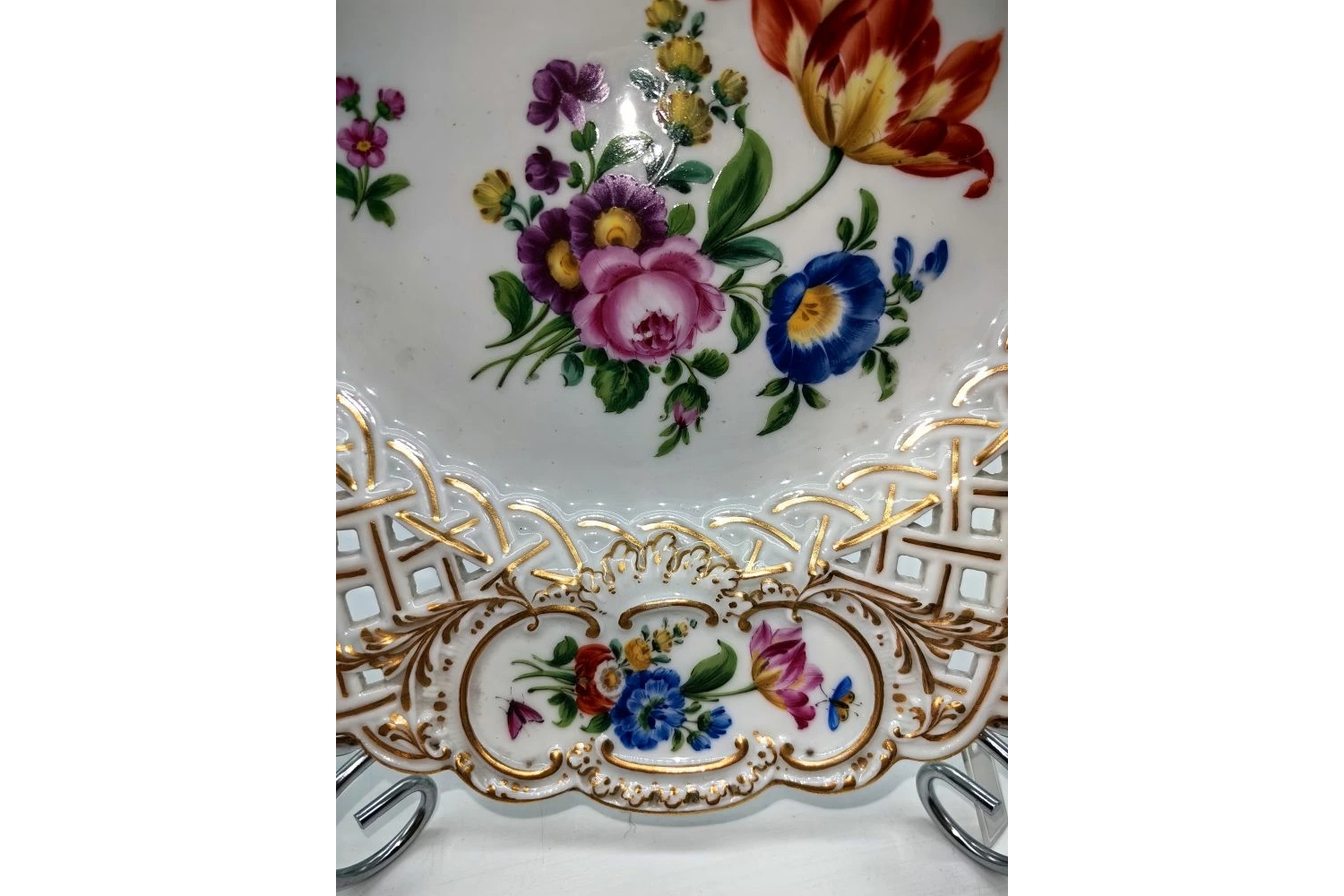Край: изысканный ажурный узор («решётка» или «кружева»), выполненный с ювелирной точностью — признак ручной работы и высокого класса изделия.