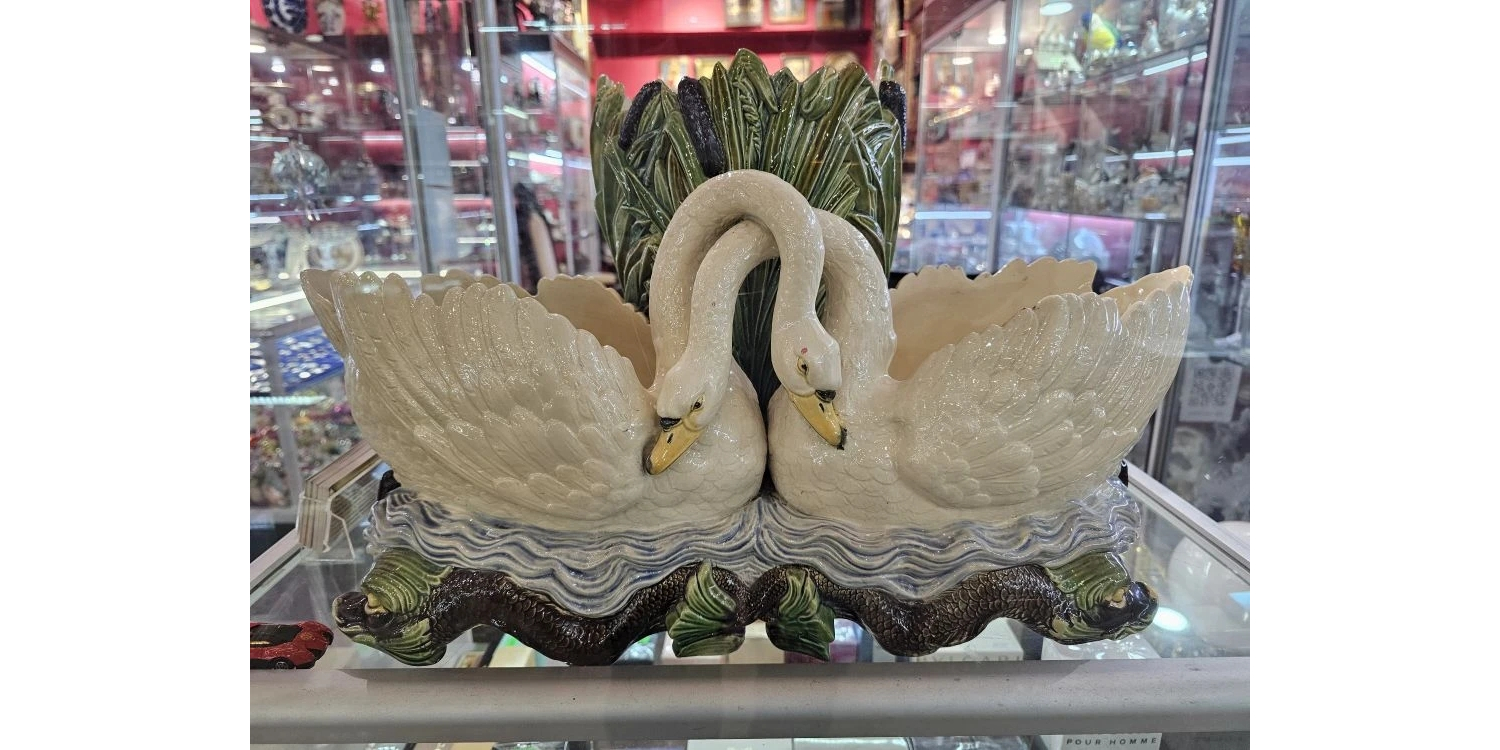 Кашпо «Два лебедя» производства фабрики Кузнецова XIX века — это антикварный предмет декоративно-прикладного искусства, изготовленный из фаянса с надглазурной росписью. Такие кашпо создавались для размещения цветочных горшков, при этом сам сосуд не имел дренажных отверстий.