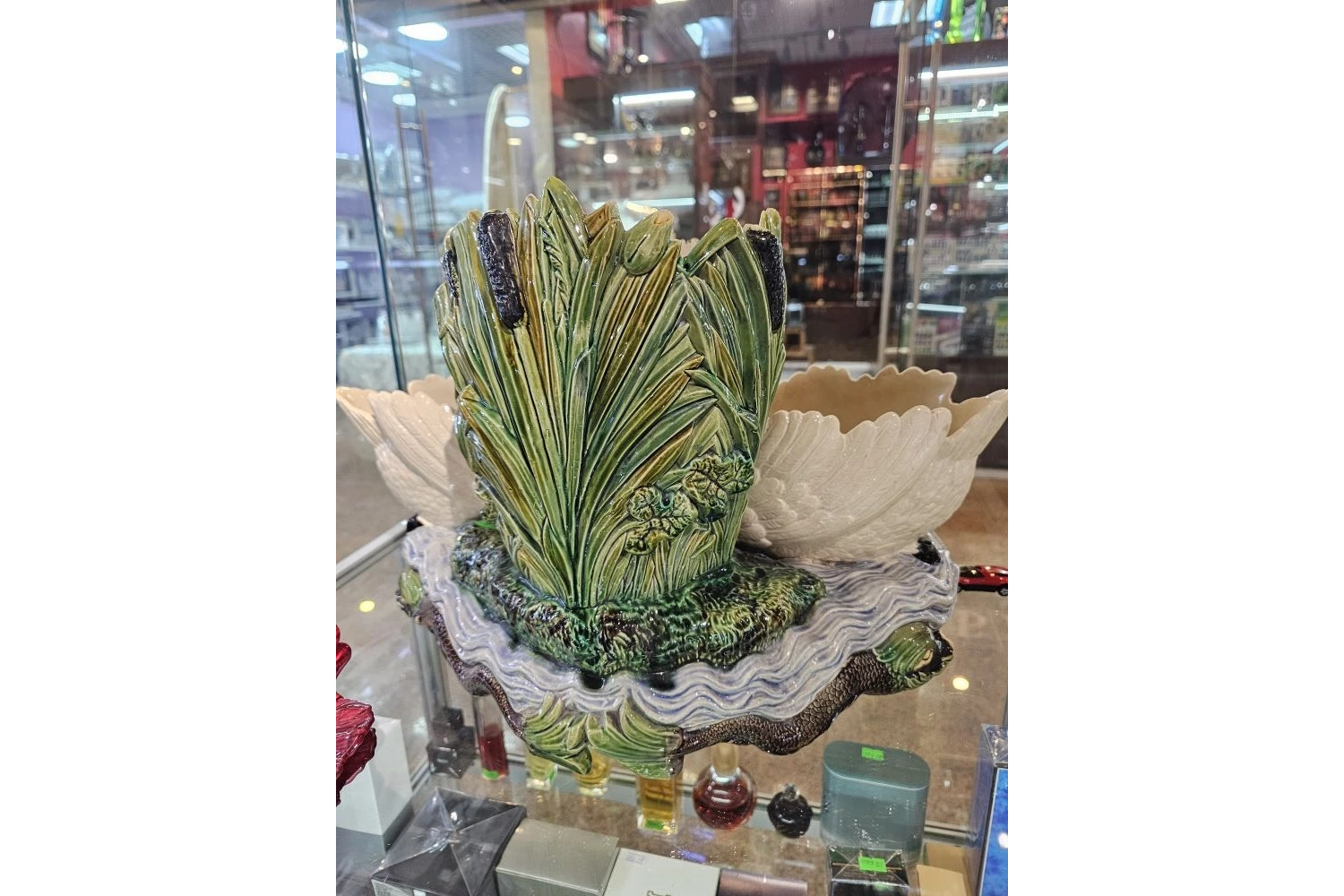 Сюжет и композиция: изображение двух лебедей. Лебеди часто символизируют красоту, грацию и верность. В таких кашпо фигуры птиц могли быть расположены симметрично или в динамичной позе, что подчёркивало их изящество. Возможно, сцена включала элементы пейзажа — воду, камыши или цветы, что добавляло композиции глубины. 12