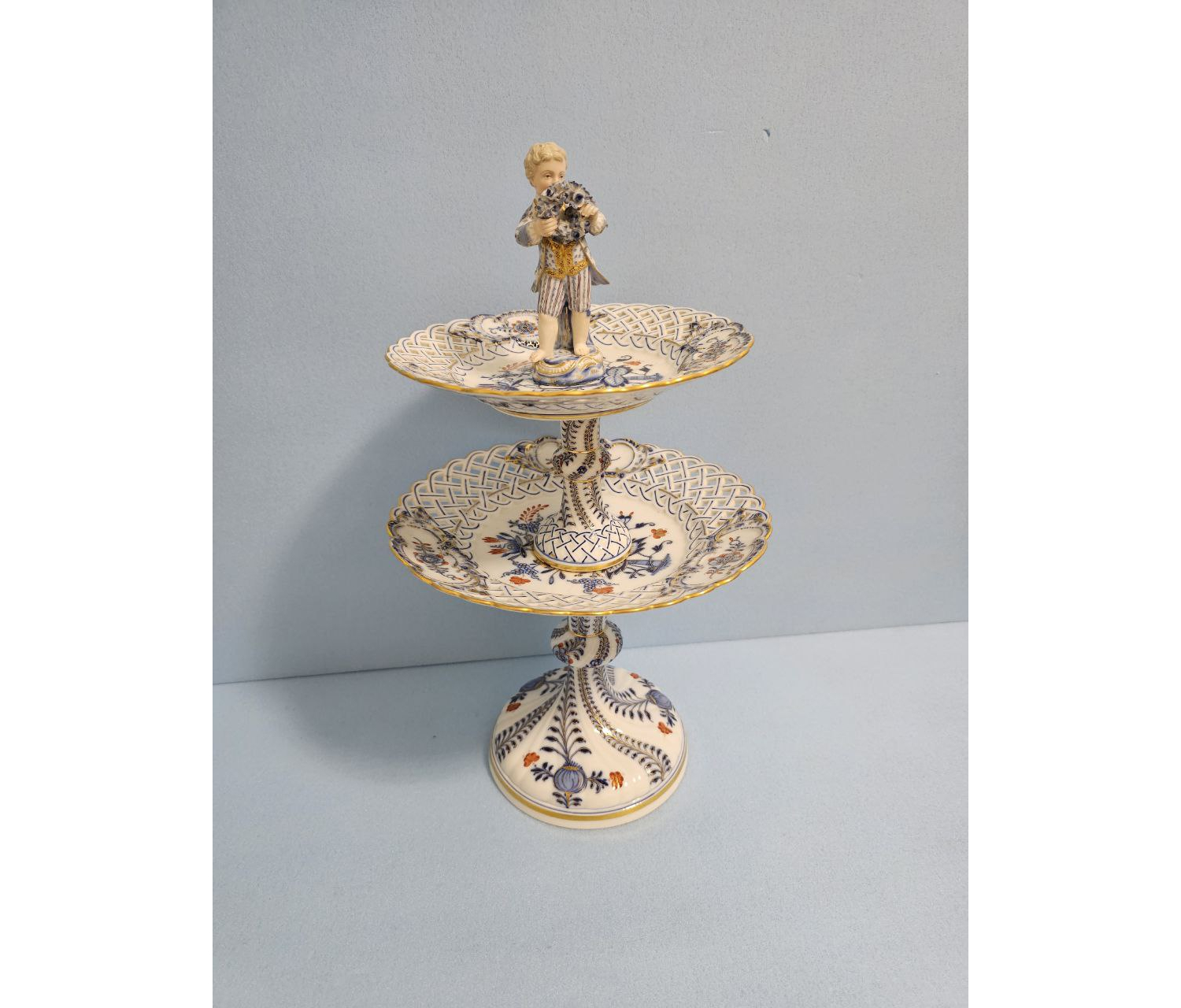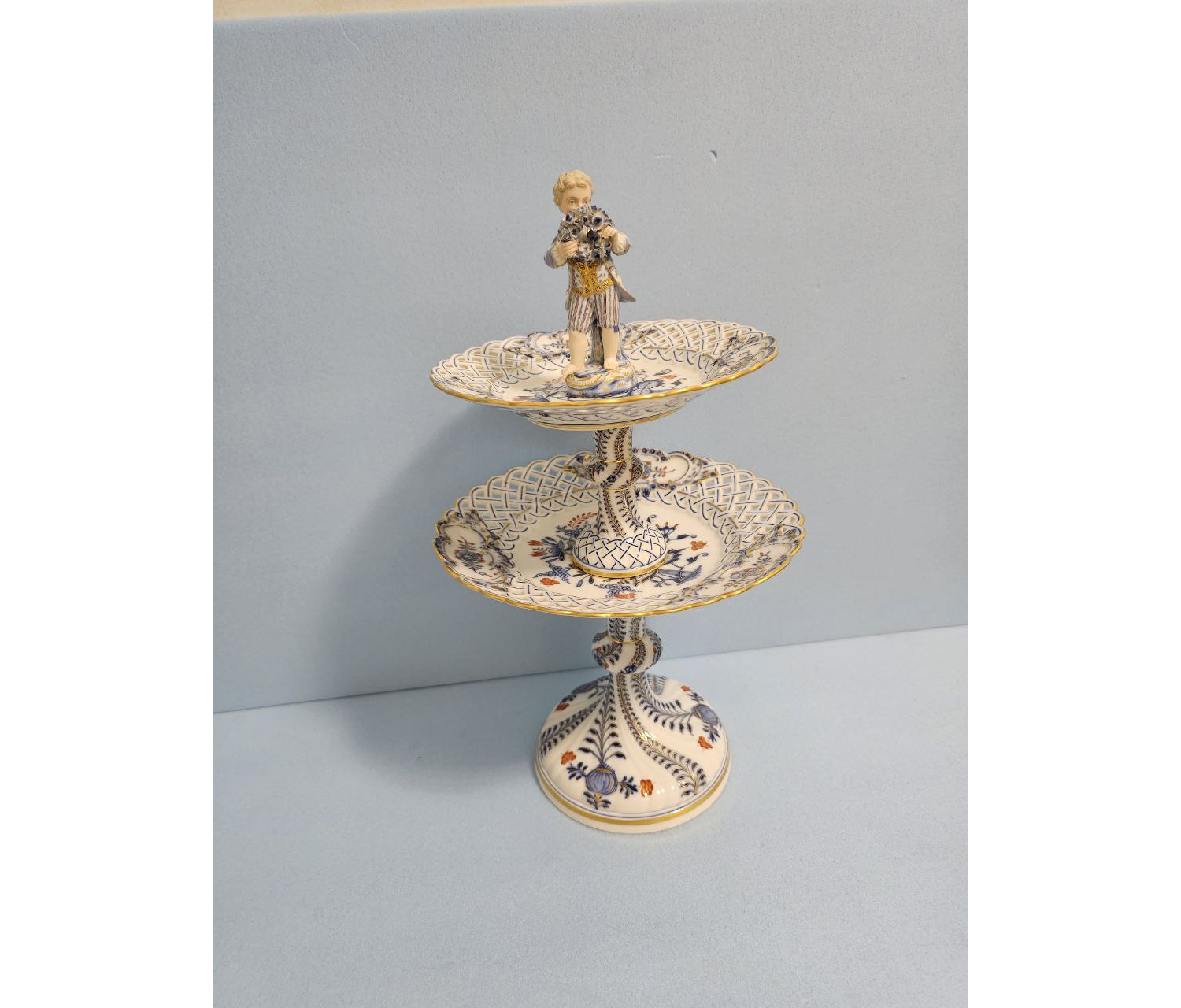 Изящная менажница мейсенской мануфактуры — образец европейского фарфорового искусства XIX века. Высота — 40 см, диаметр большой тарелки — 23 см. Выполнена из белоснежного твёрдого фарфора с подглазурной кобальтово‑синей росписью и золочением по краям отделений. Декор включает классический «луковый узор» и рельефные завитки. Подглазурное клеймо — перекрёстные мечи синего цвета, чётко читаемо. В люксовом состоянии: без повреждений, сколов и реставраций, золочение сохранилось полностью, роспись яркая и чёткая. Уникальный артефакт, отражающий мастерство мейсенских мастеров и традиции аристократической сервировки. Подходит для частных коллекций, музеев и ценителей европейского фарфора.