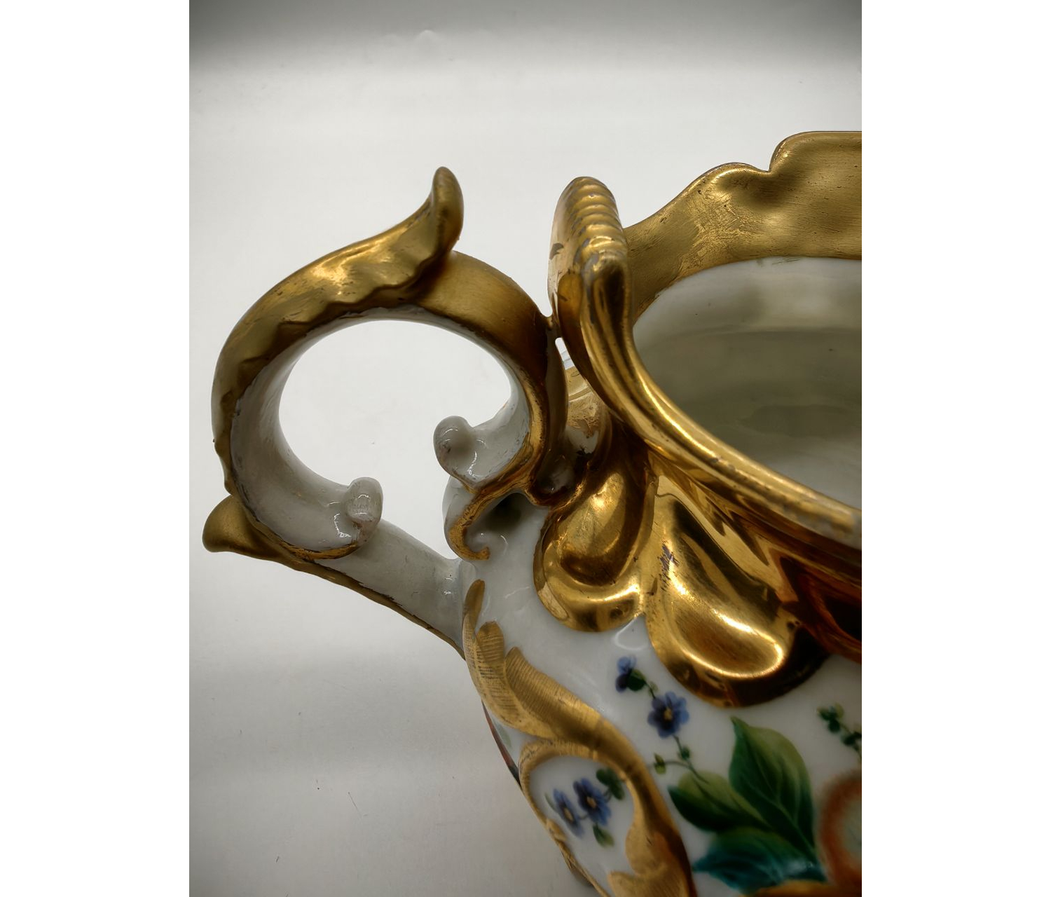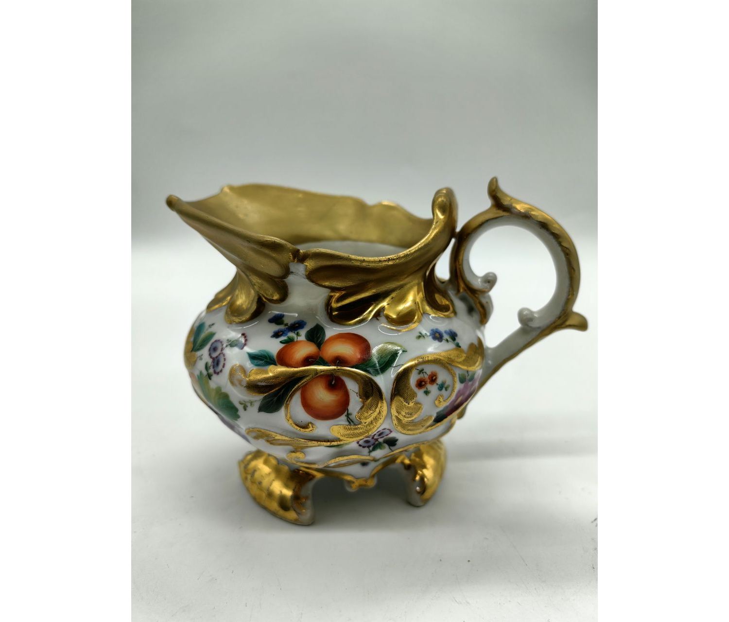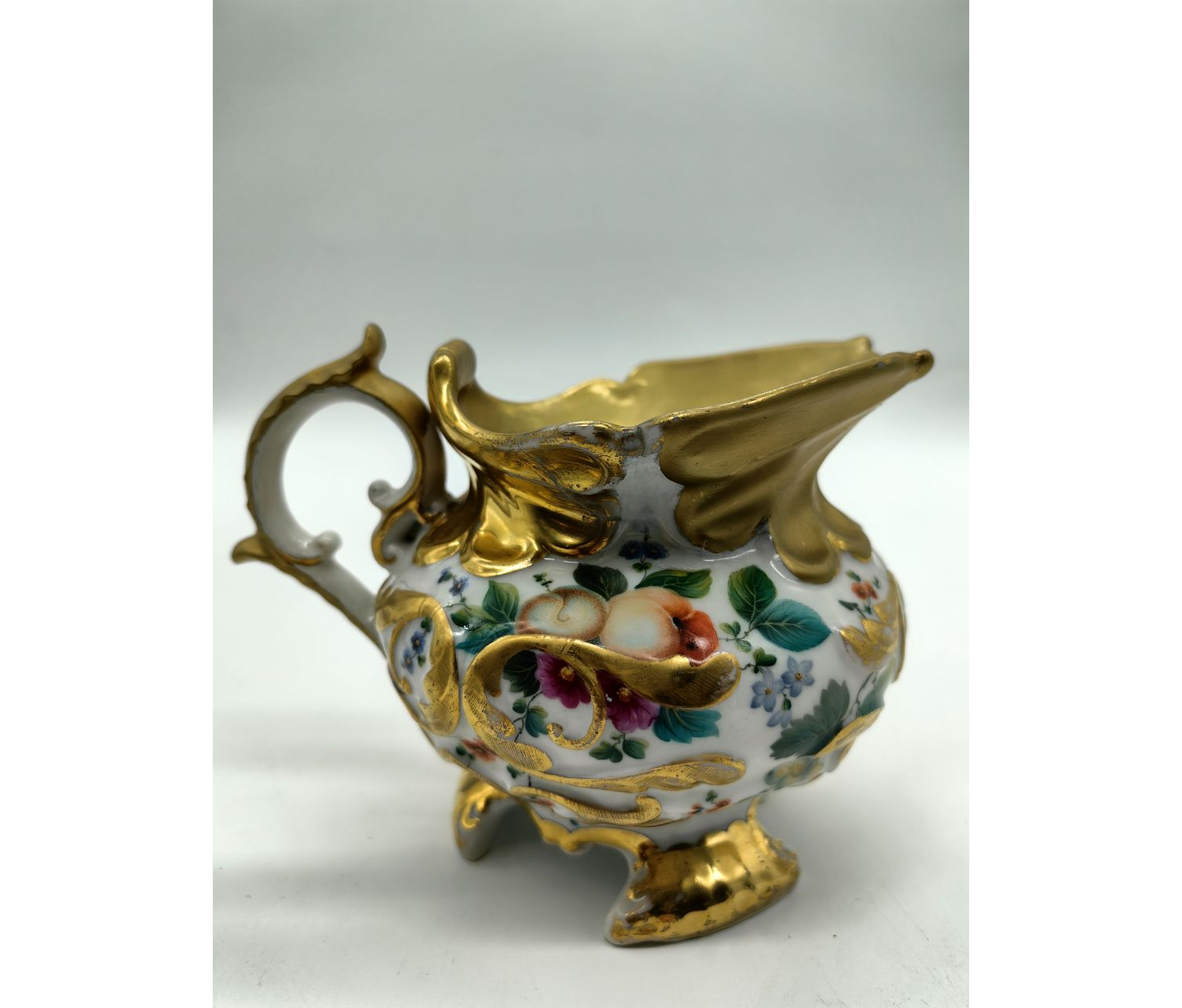 Антикварный молочник фабрики Гарднера с росписью золотом и изображениями фруктов — это предмет фарфорового искусства, созданный в период деятельности знаменитой мануфактуры. Такие изделия ценятся за качество материалов, ручную роспись и историческую значимость.