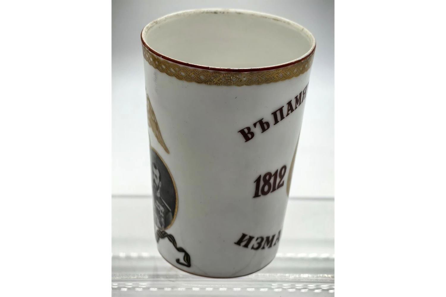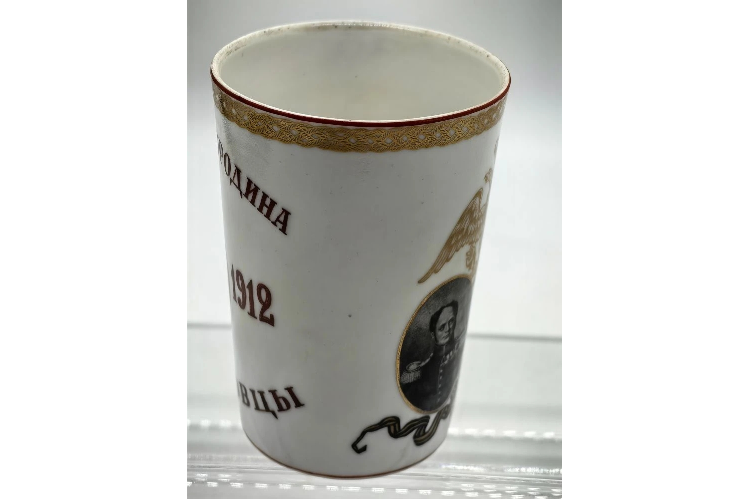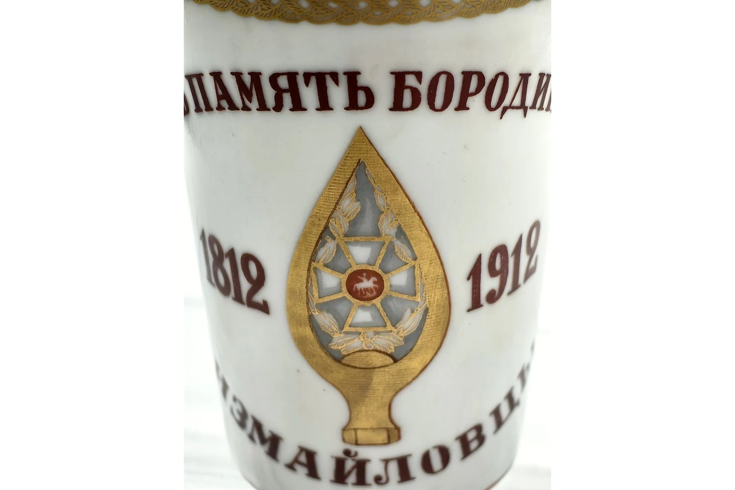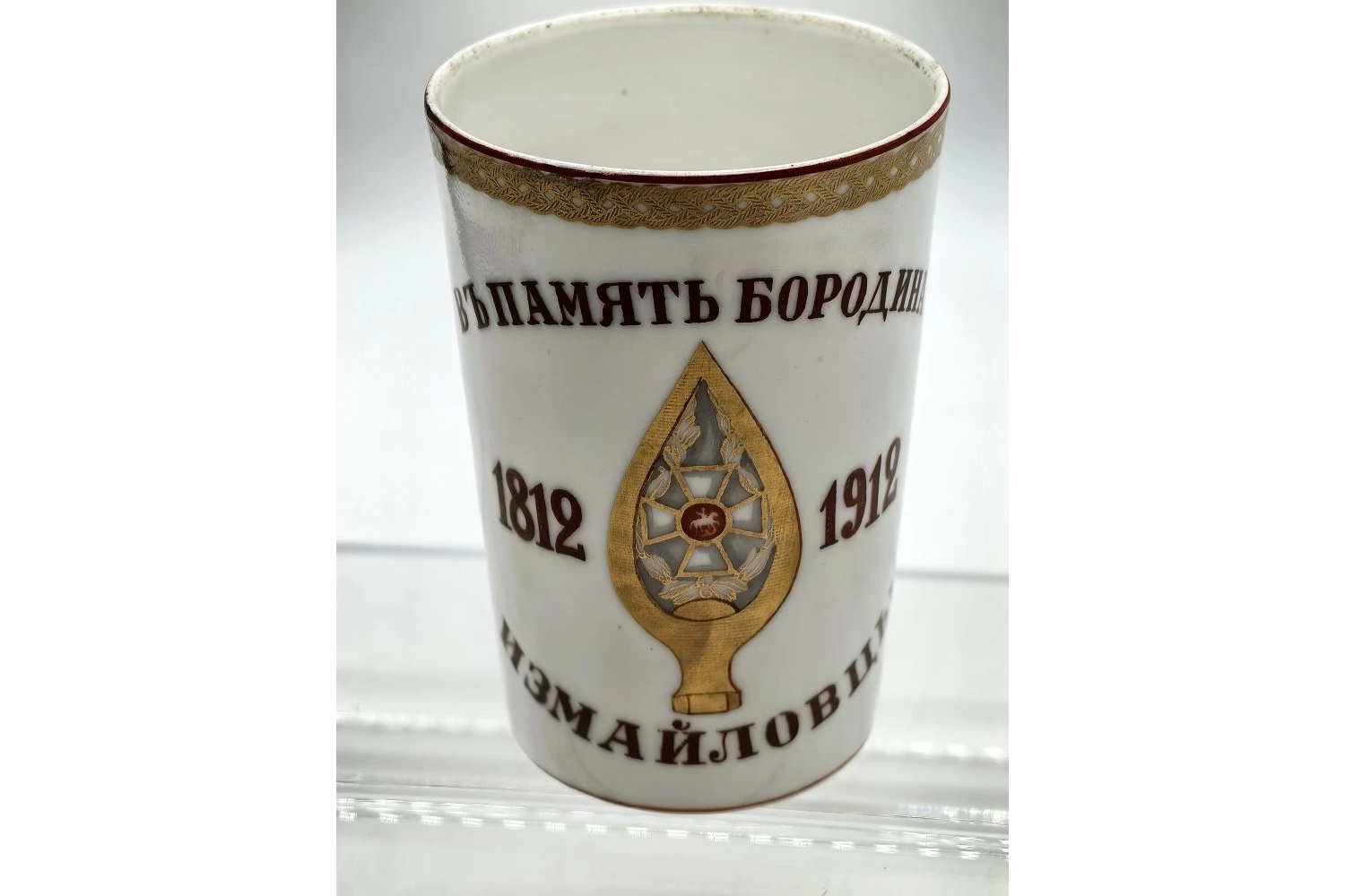 Исторический предмет декоративно‑прикладного искусства, созданный в память о столетии Отечественной войны 1812 года и подвиге лейб‑гвардии Измайловского полка в Бородинском сражении. Стакан — редкий образец патриотической керамики начала XX века, сочетающий утилитарность с мемориальной функцией.