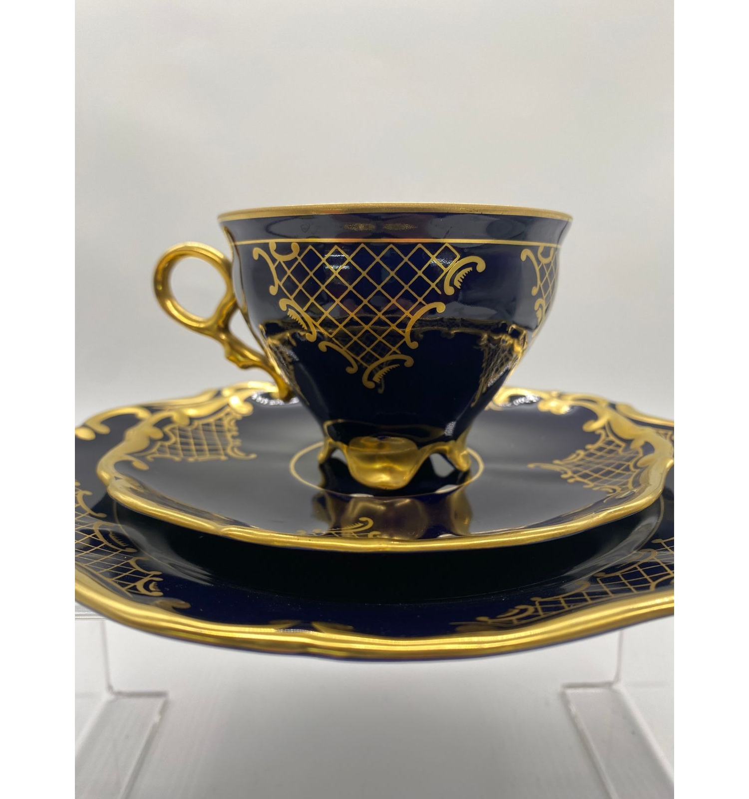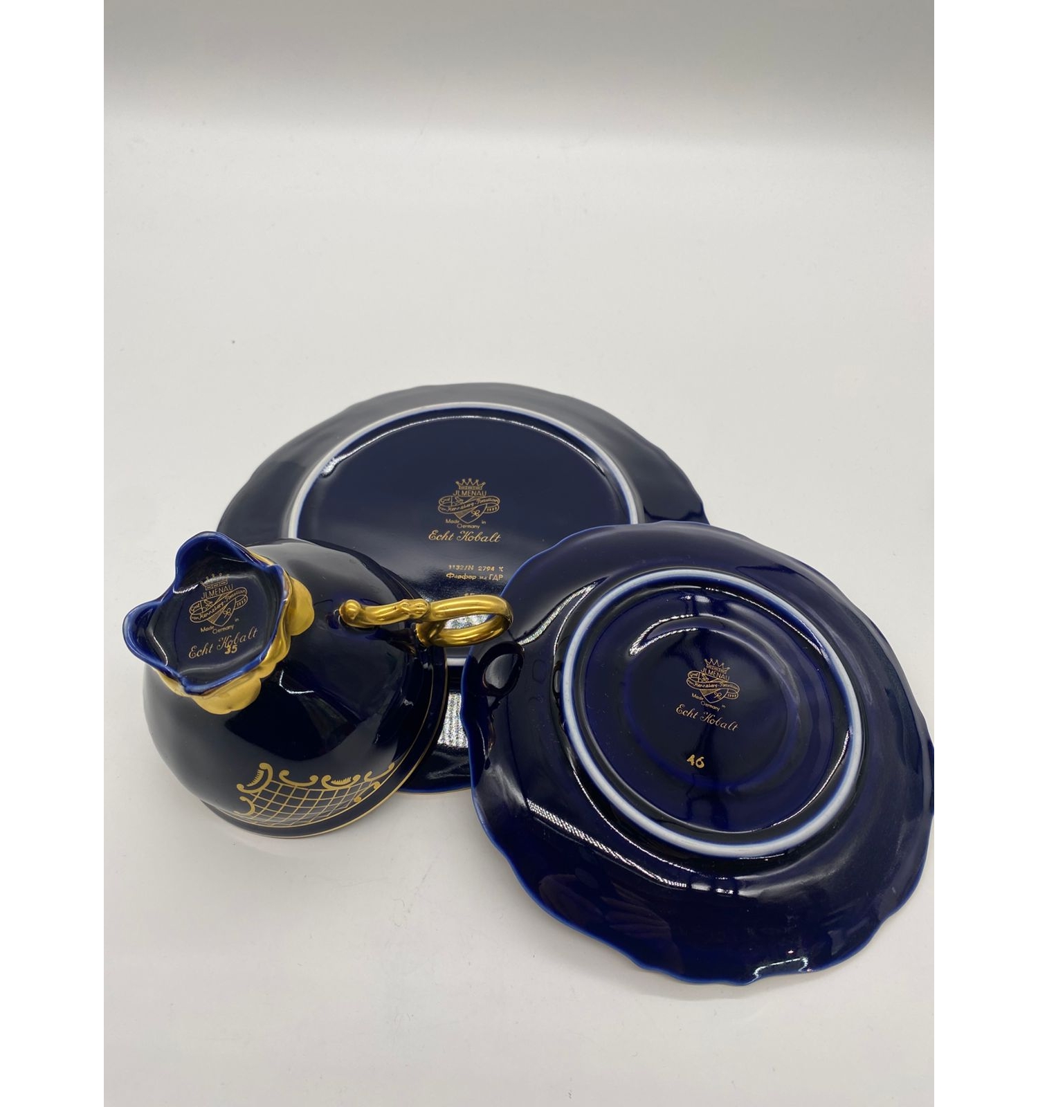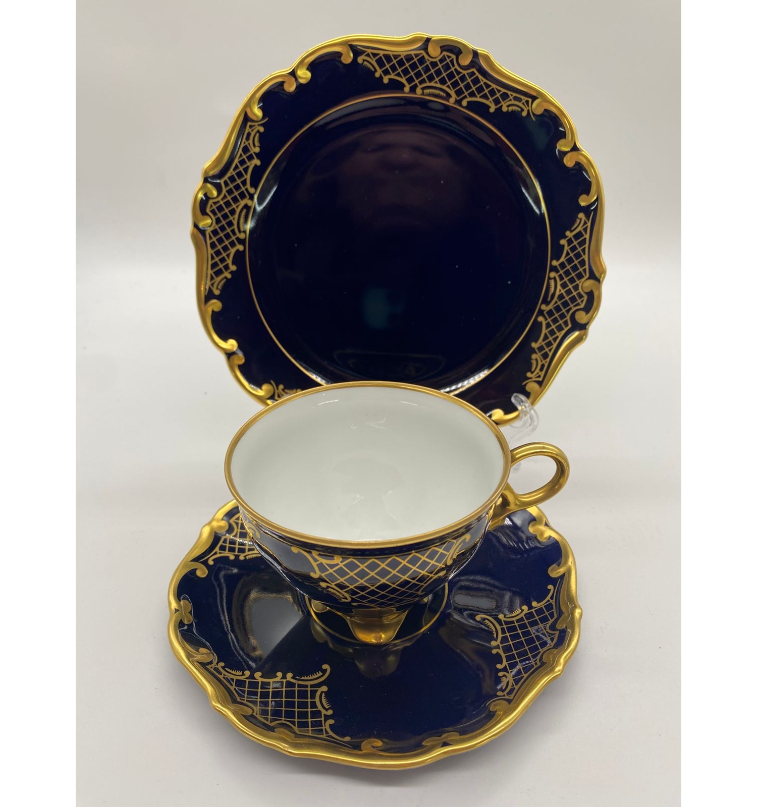 Все элементы набора выполнены из высококачественного фарфора, который отличается своей белизной и тонкостью. На чашке, блюдце и тарелке можно увидеть изящную кобальтовую роспись, выполненную с высочайшим мастерством и вниманием к деталям. Узоры, нанесенные кобальтом, придают изделию изысканность и утонченность. Элементы позолоты, нанесенные на определенные части набора, добавляют роскоши и подчеркивают внимание к деталям.