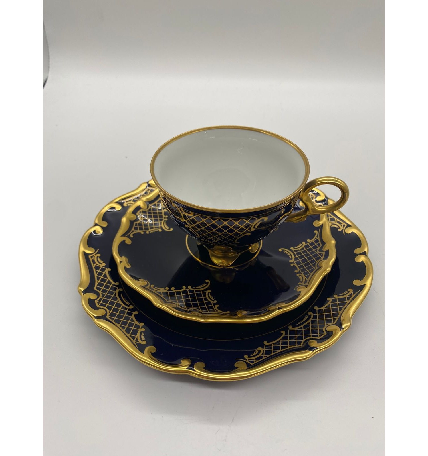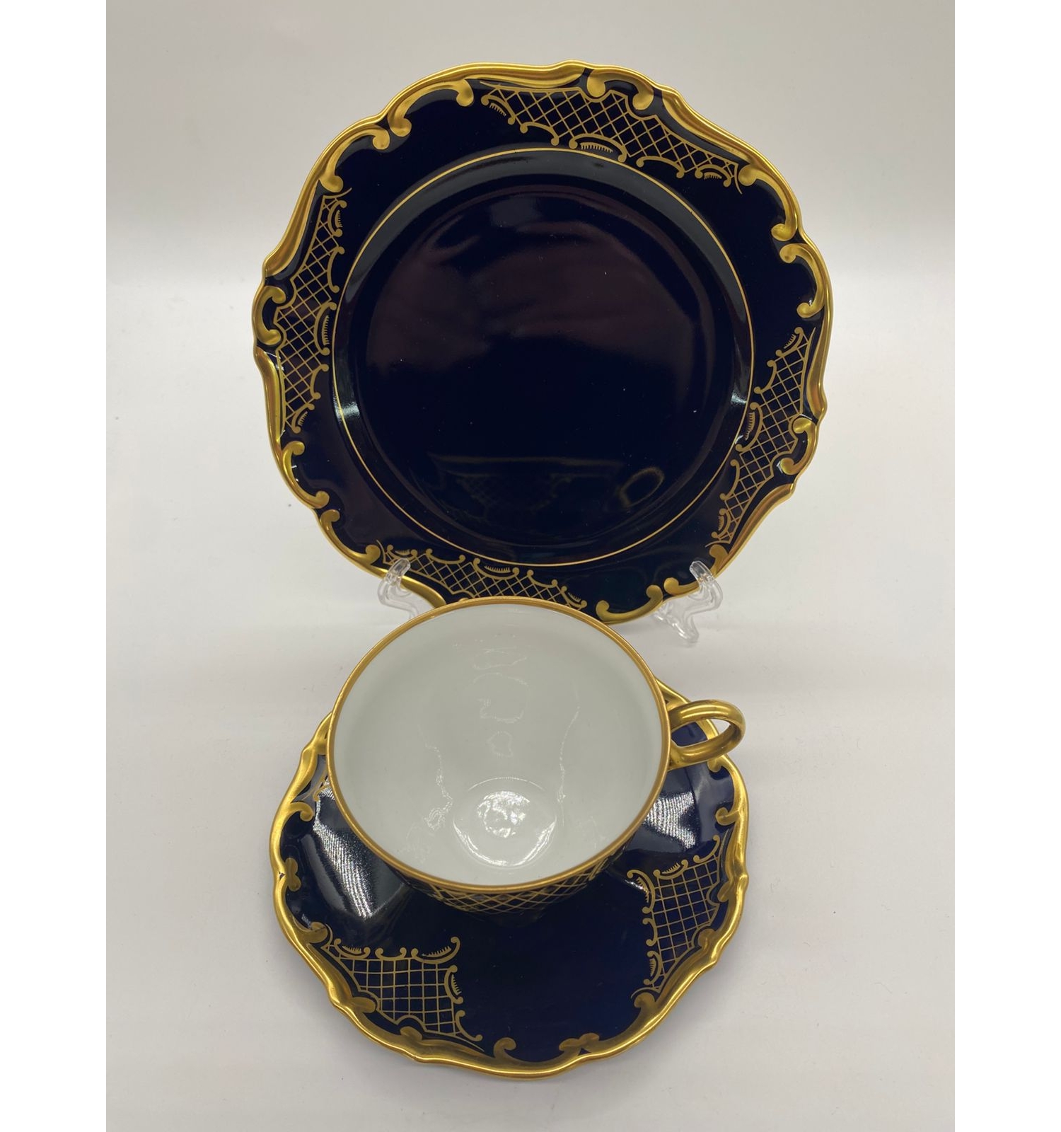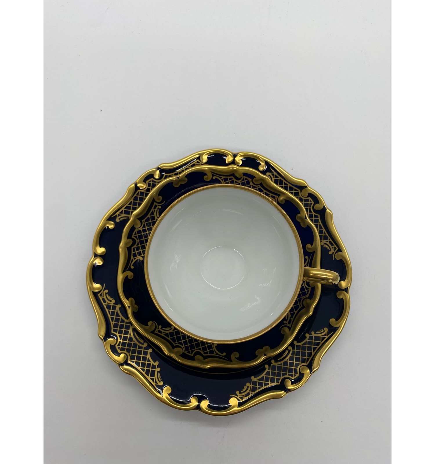 Все элементы набора выполнены из высококачественного фарфора, который отличается своей белизной и тонкостью. На чашке, блюдце и тарелке можно увидеть изящную кобальтовую роспись, выполненную с высочайшим мастерством и вниманием к деталям. Узоры, нанесенные кобальтом, придают изделию изысканность и утонченность. Элементы позолоты, нанесенные на определенные части набора, добавляют роскоши и подчеркивают внимание к деталям.