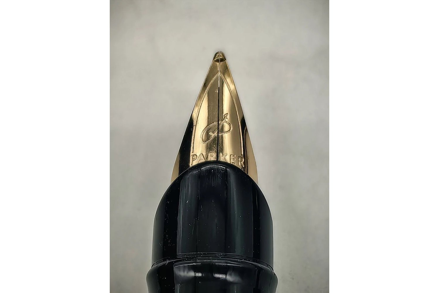 Перо. На нём есть логотип в виде стрелы и надпись Parker USA. Перо жёсткое, но позволяет немного надавить при письме. Толщина линии — F (без маркировки).