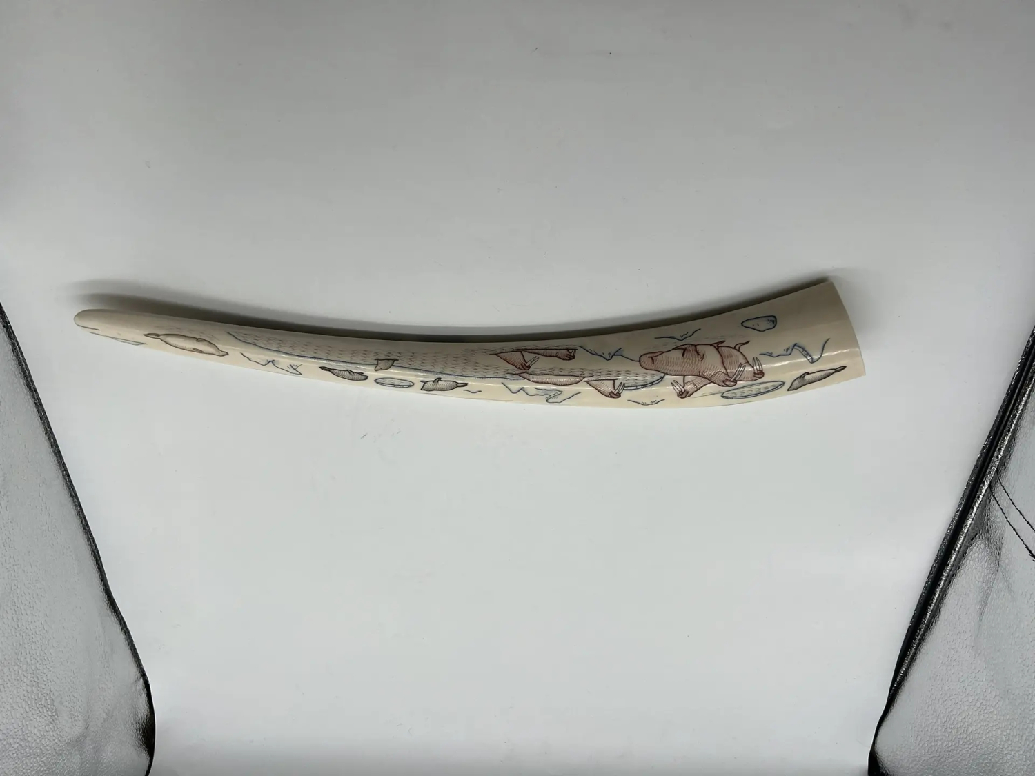 Следы использования: на одном из концов заметны потёртости, возможно, бивень служил рукоятью или ритуальным предметом.