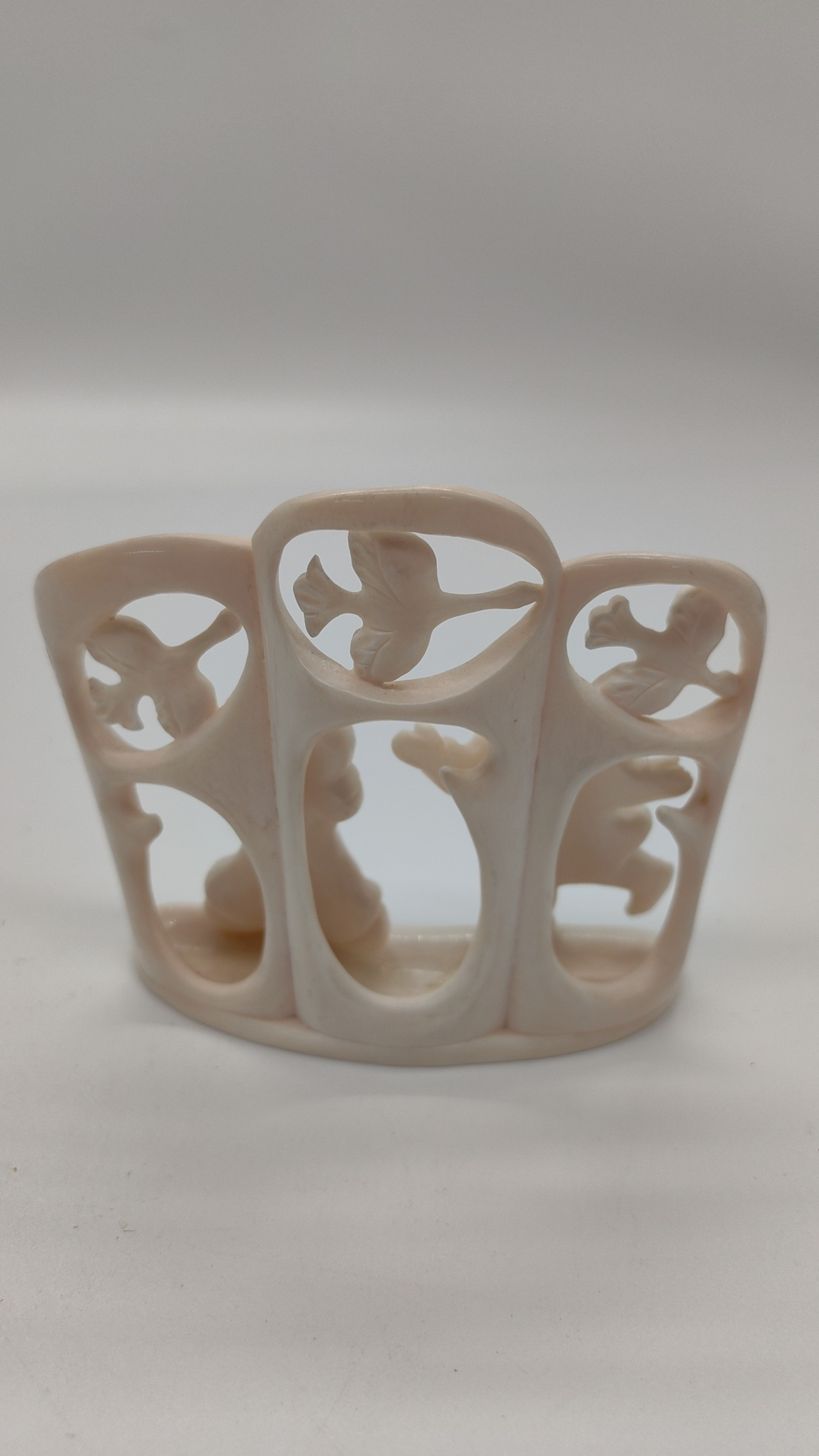 Представляю вашему вниманию уникальную винтажную скульптуру из бивня мамонта, предназначенную для салфеток. Высота скульптуры составляет 11 см, ширина — 10,5 см.