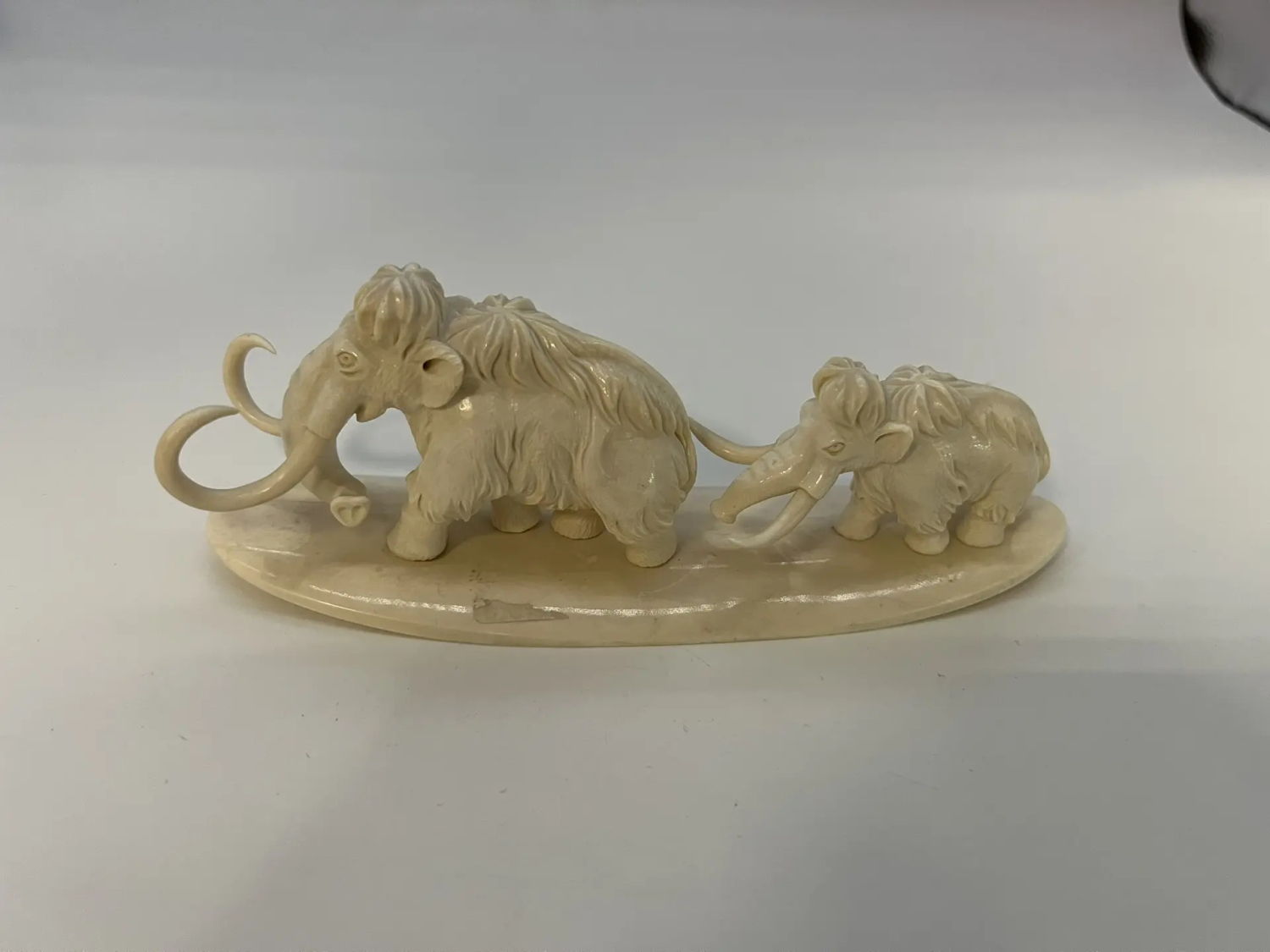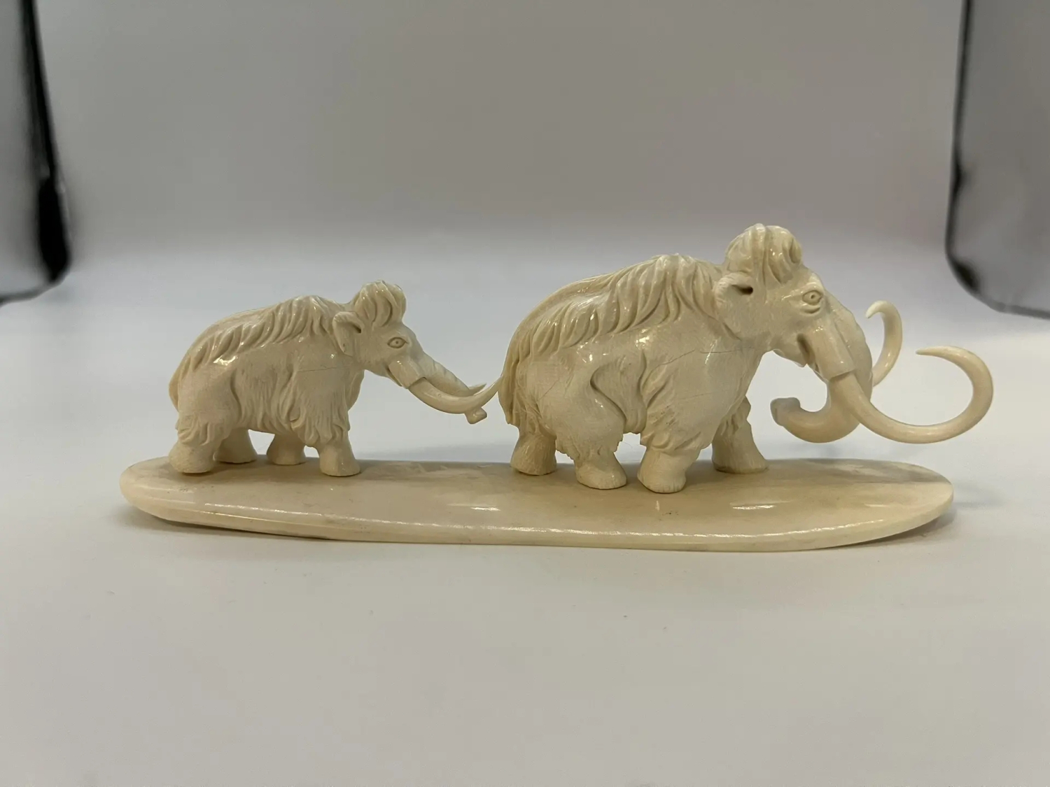 Скульптура «Мамонт с мамонтёнком» из бивня мамонта — это тонко проработанное произведение косторезного искусства, воплощающее трогательный сюжет из жизни доисторических животных.