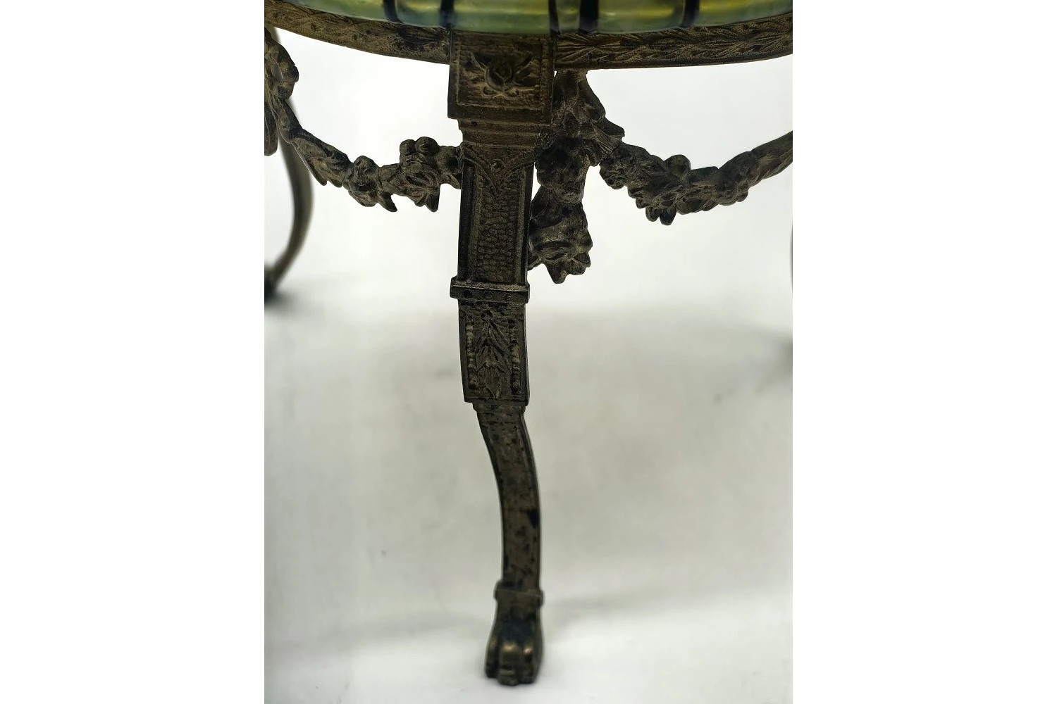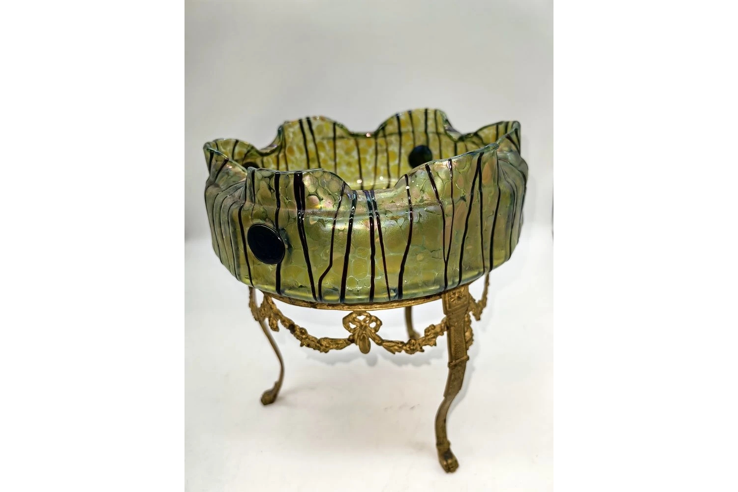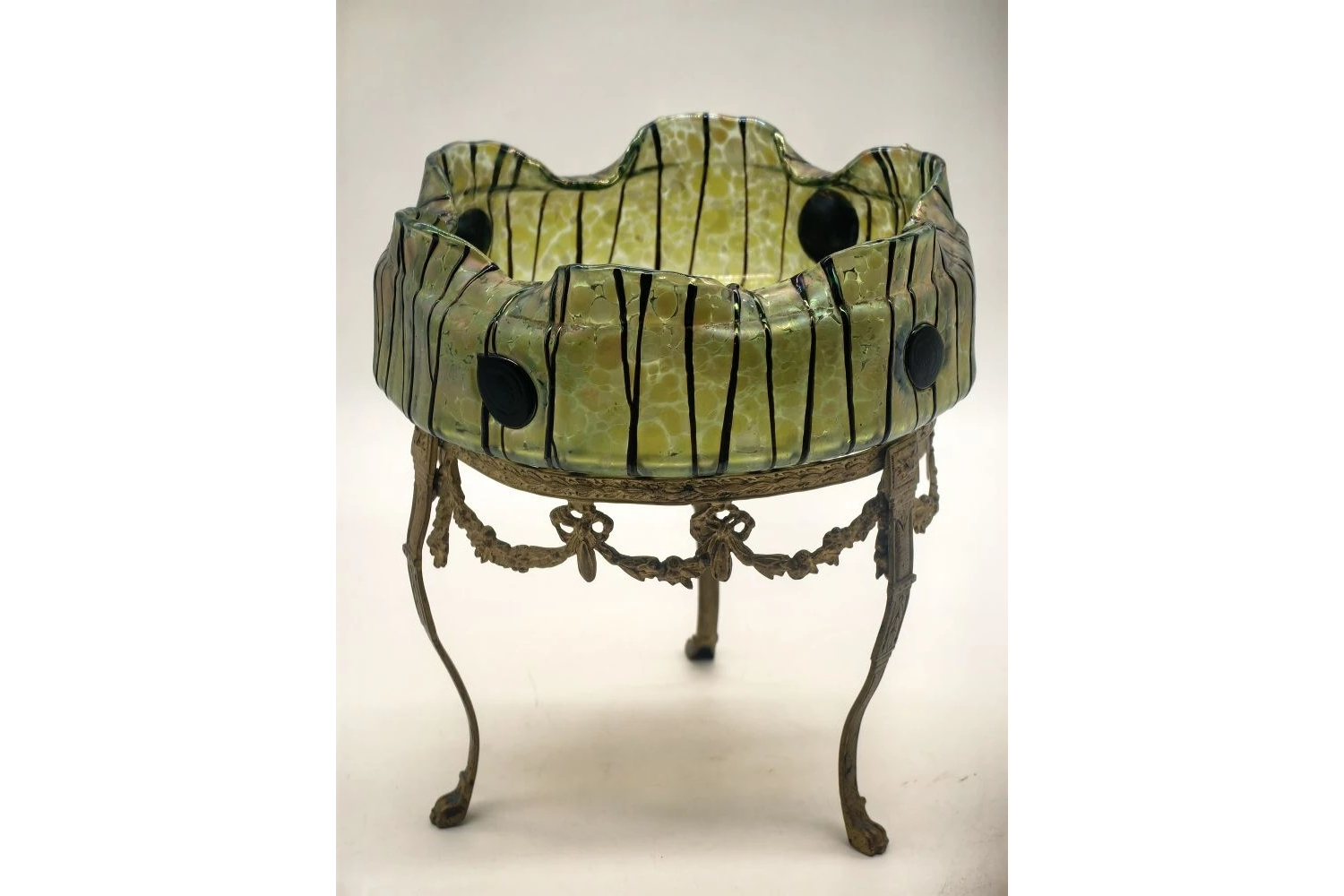 Материалы: тёмно‑зелёное стекло с характерными тёмными разводами, бронзовые ножки.