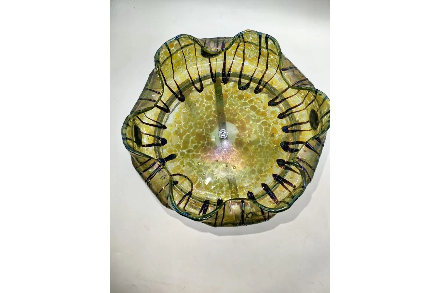 Стекло. Глубокий тёмно‑зелёный оттенок с природными тёмными разводами, напоминающими мраморные прожилки. Такая цветовая гамма придаёт вазе загадочность и глубину, а игра света на поверхности раскрывает богатство фактуры.