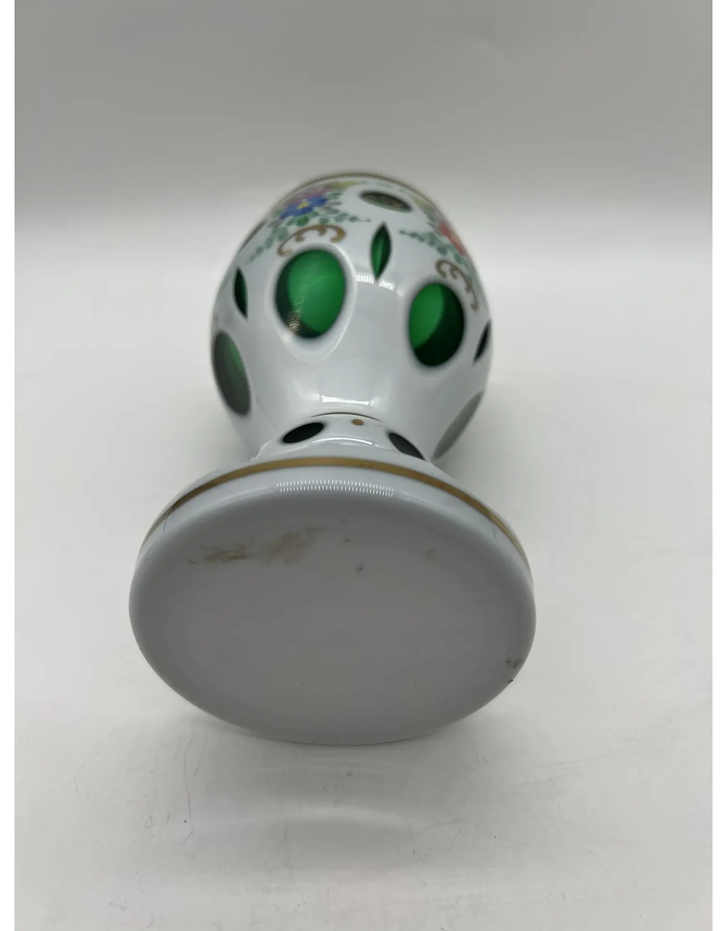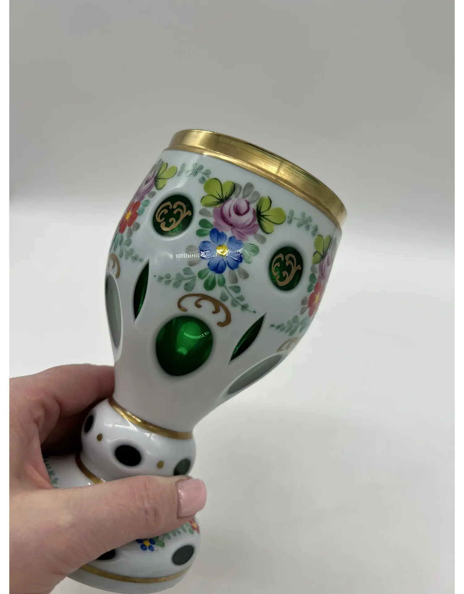 Изысканная винтажная ваза — воплощение традиций богемского стеклоделия. Изделие сочетает техническую сложность исполнения и утончённый дизайн, характерный для классических образцов Богемии.
