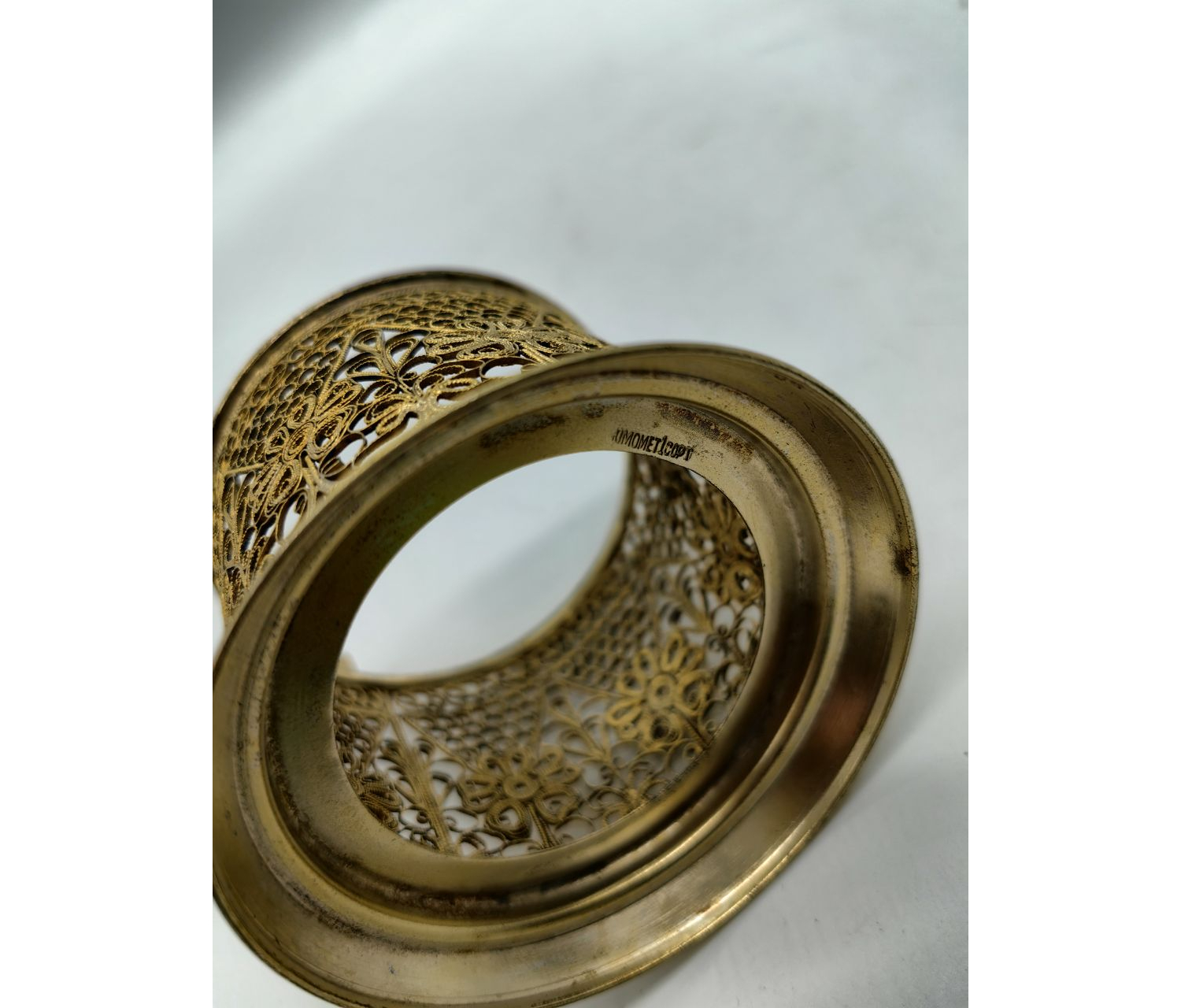 Ажурное переплетение: сложный узор из тонких металлических нитей, образующих симметричные завитки, растительные мотивы или геометрические фигуры. Просветы между элементами создают игру света и тени.