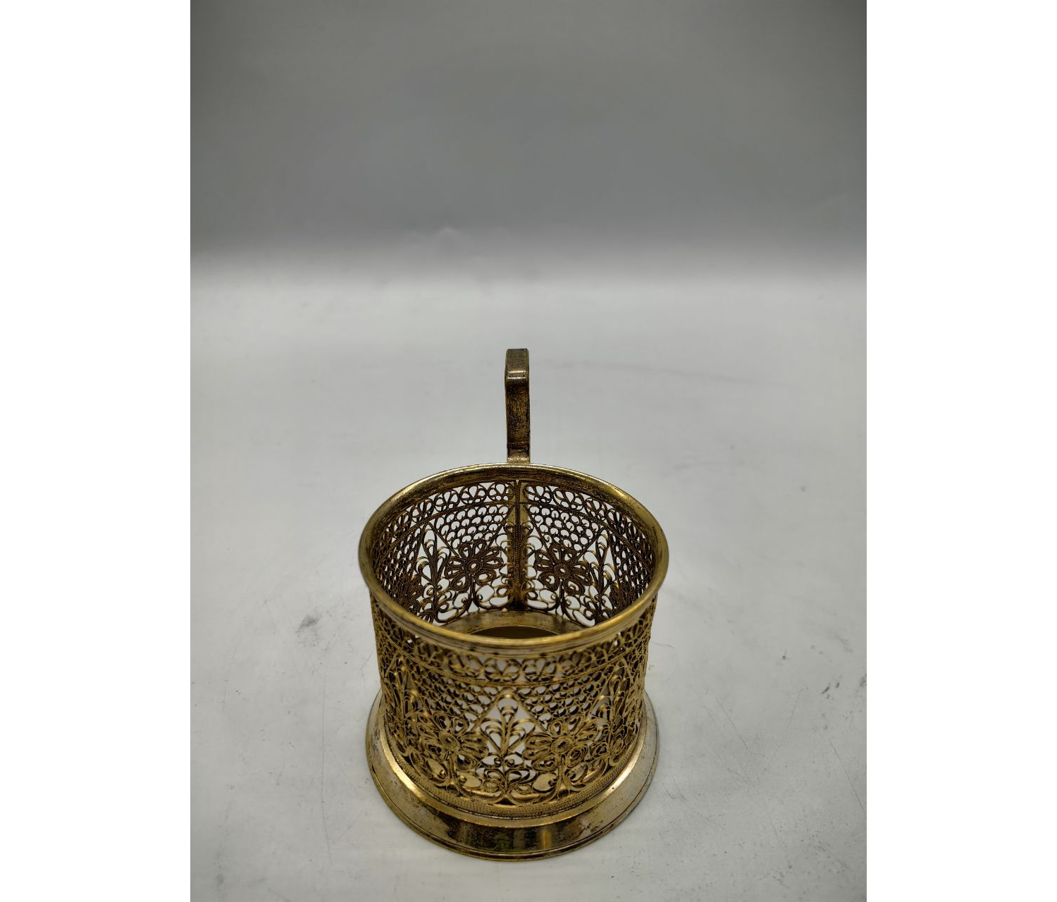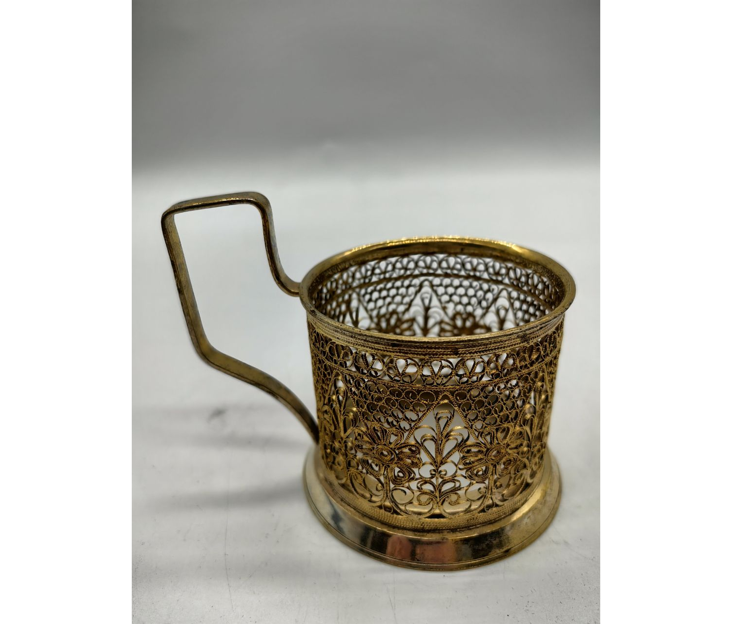 Подстаканники такого типа выпускались в СССР в 1960–1980‑е годы. Их производили на крупных предприятиях художественной металлообработки (например, Кольчугинский завод, Казаковское предприятие художественных изделий). Позолота и ажурная техника подчёркивали статус предмета — он мог использоваться как: