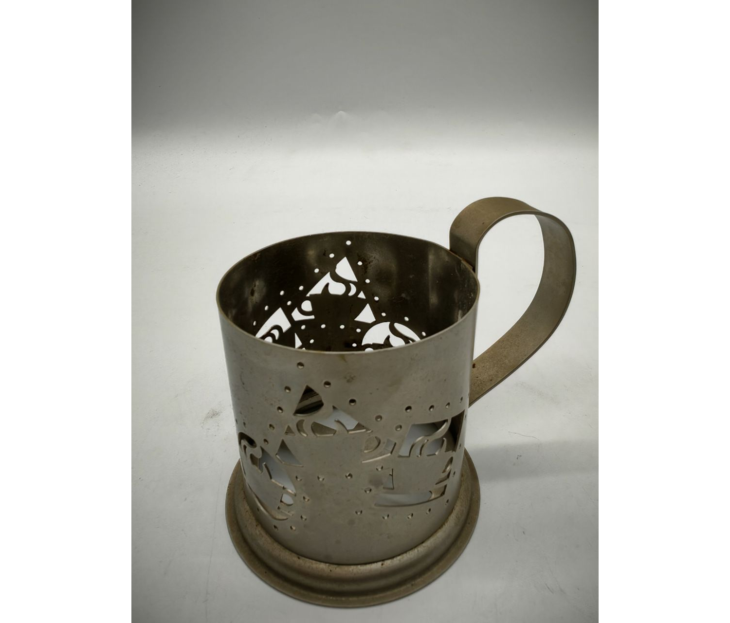 Винтажный подстаканник из мельхиора, выполненный в эстетике модерна. Изделие относится к периоду СССР (вероятно, 1950–1960‑е годы) и демонстрирует характерные для стиля черты: плавные линии, органичные формы, сдержанную декоративность. Предмет сочетает функциональность с художественной ценностью, типичной для советского декоративно‑прикладного искусства середины XX века.
