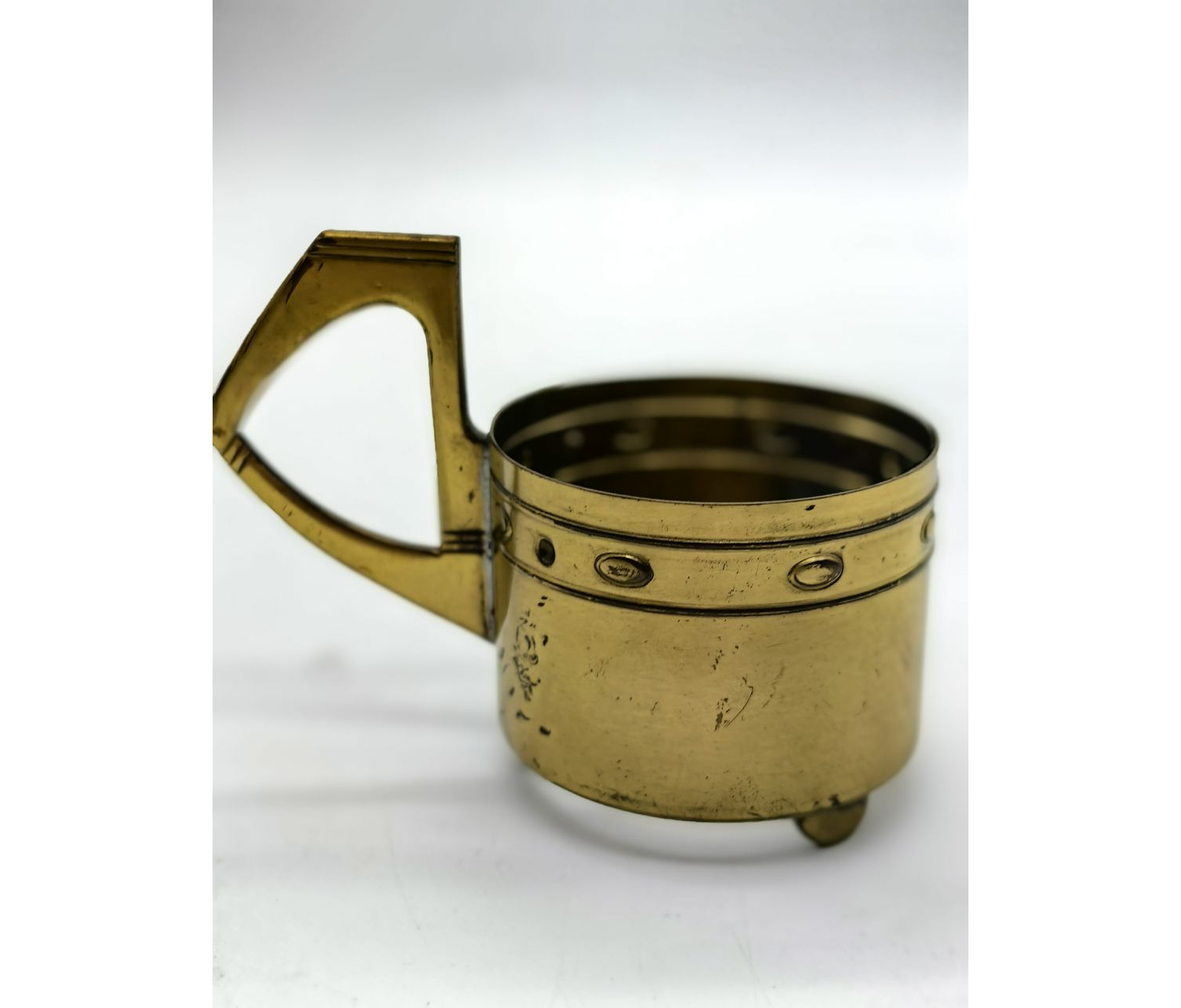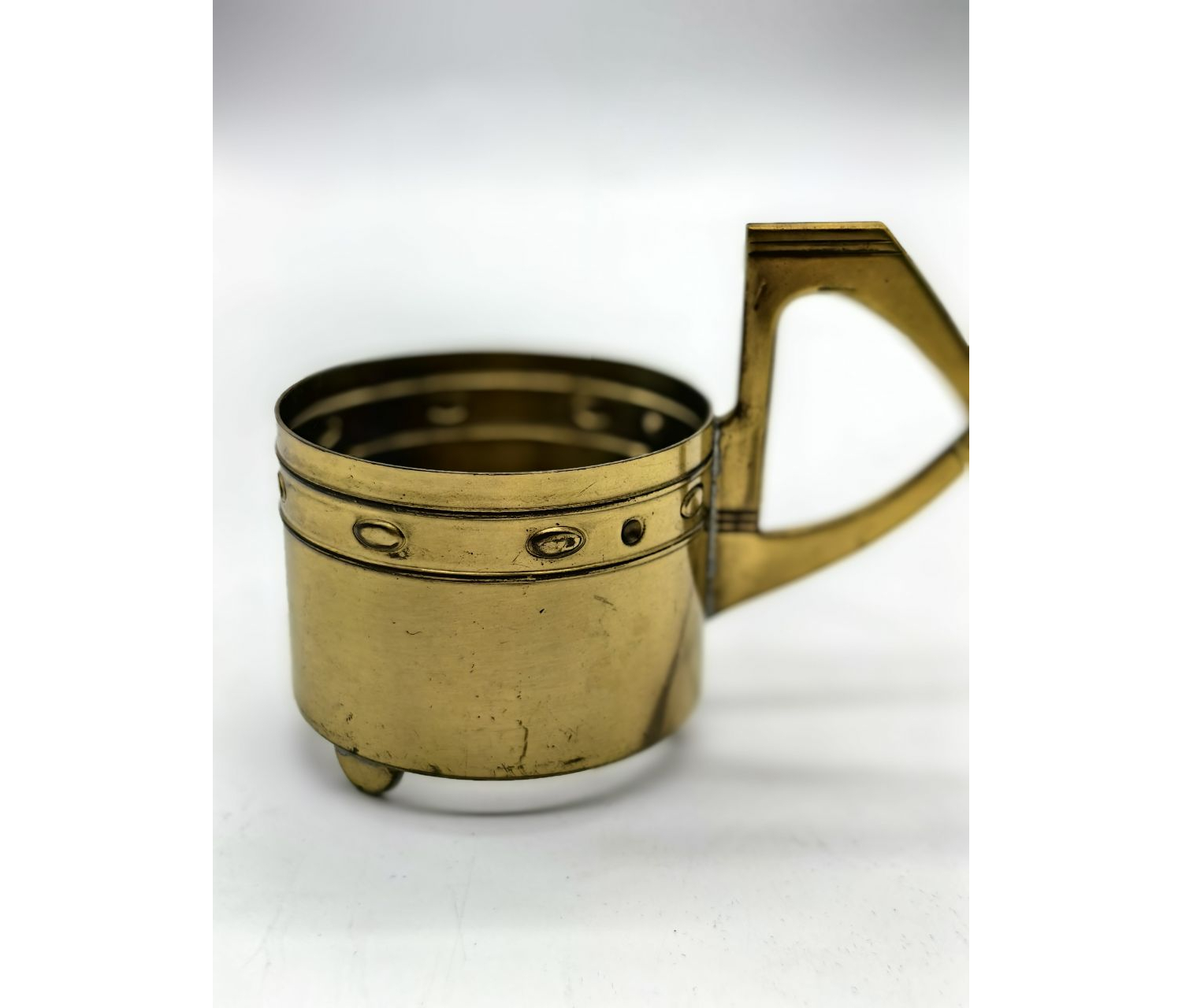 Антикварный подстаканник начала XX века, выполненный из латуни — сплава меди с цинком. Предмет сочетает утилитарную функцию (поддержка стеклянного стакана, защита рук от нагрева) с художественной ценностью. Такие изделия были распространены в России и Европе, отражая стилистику эпохи и мастерство ремесленников.