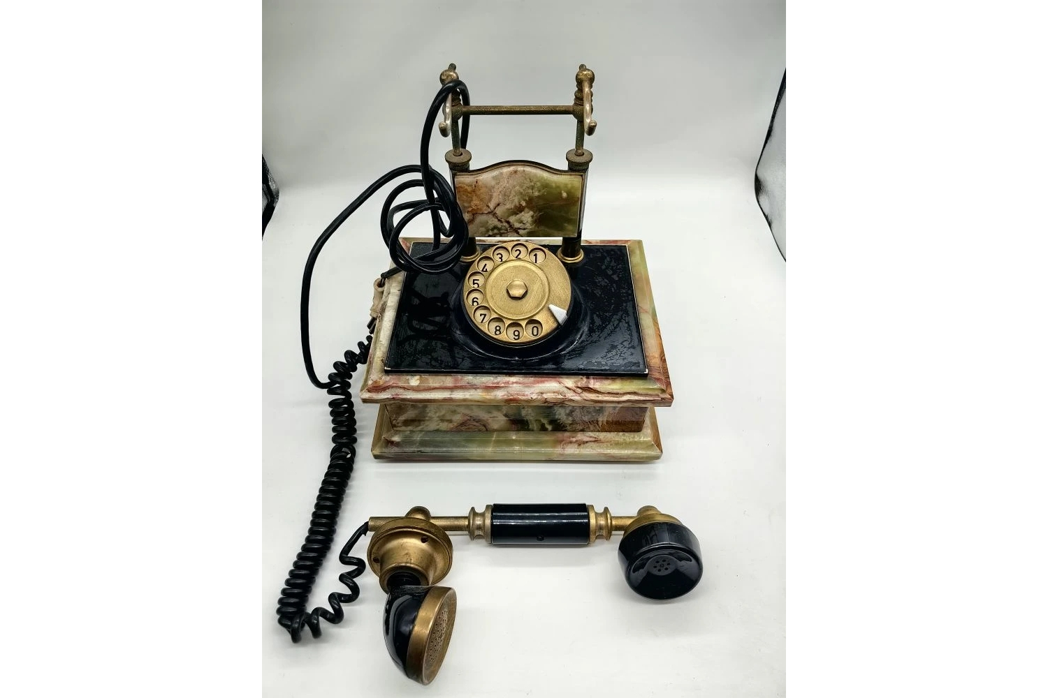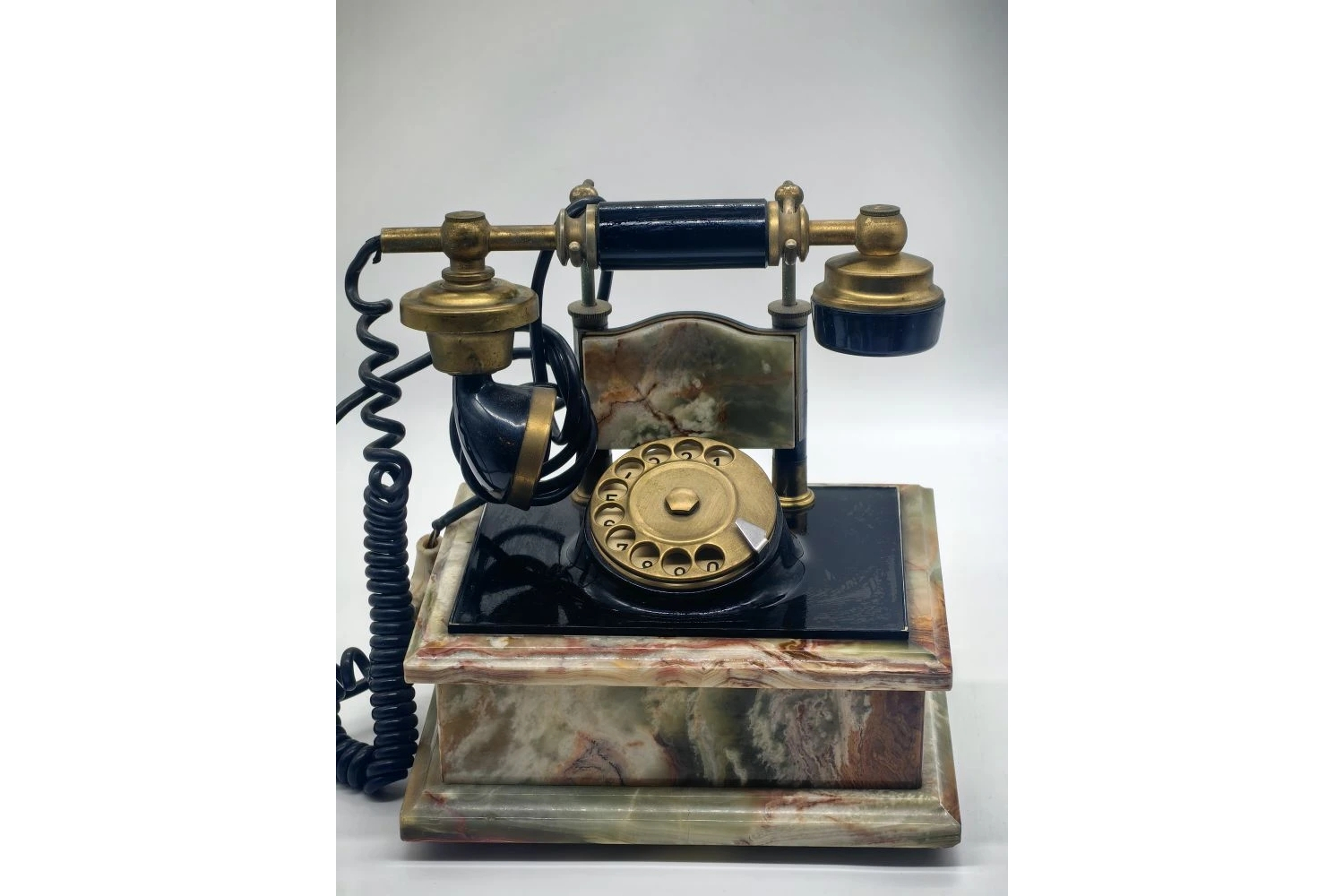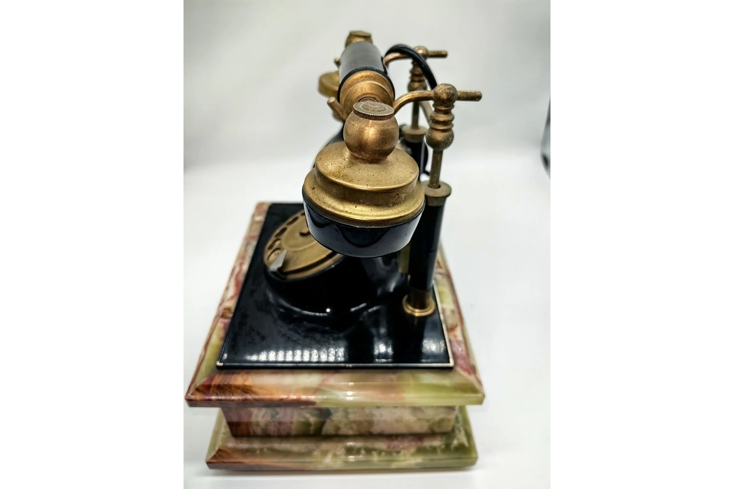 Редкий предмет интерьера и технического наследия — антикварный дисковый телефон, сочетающий натуральный камень (оникс) и металлические элементы. Изделие воплощает эстетику начала XX века: утончённую роскошь материалов и инженерную мысль эпохи становления телефонной связи.