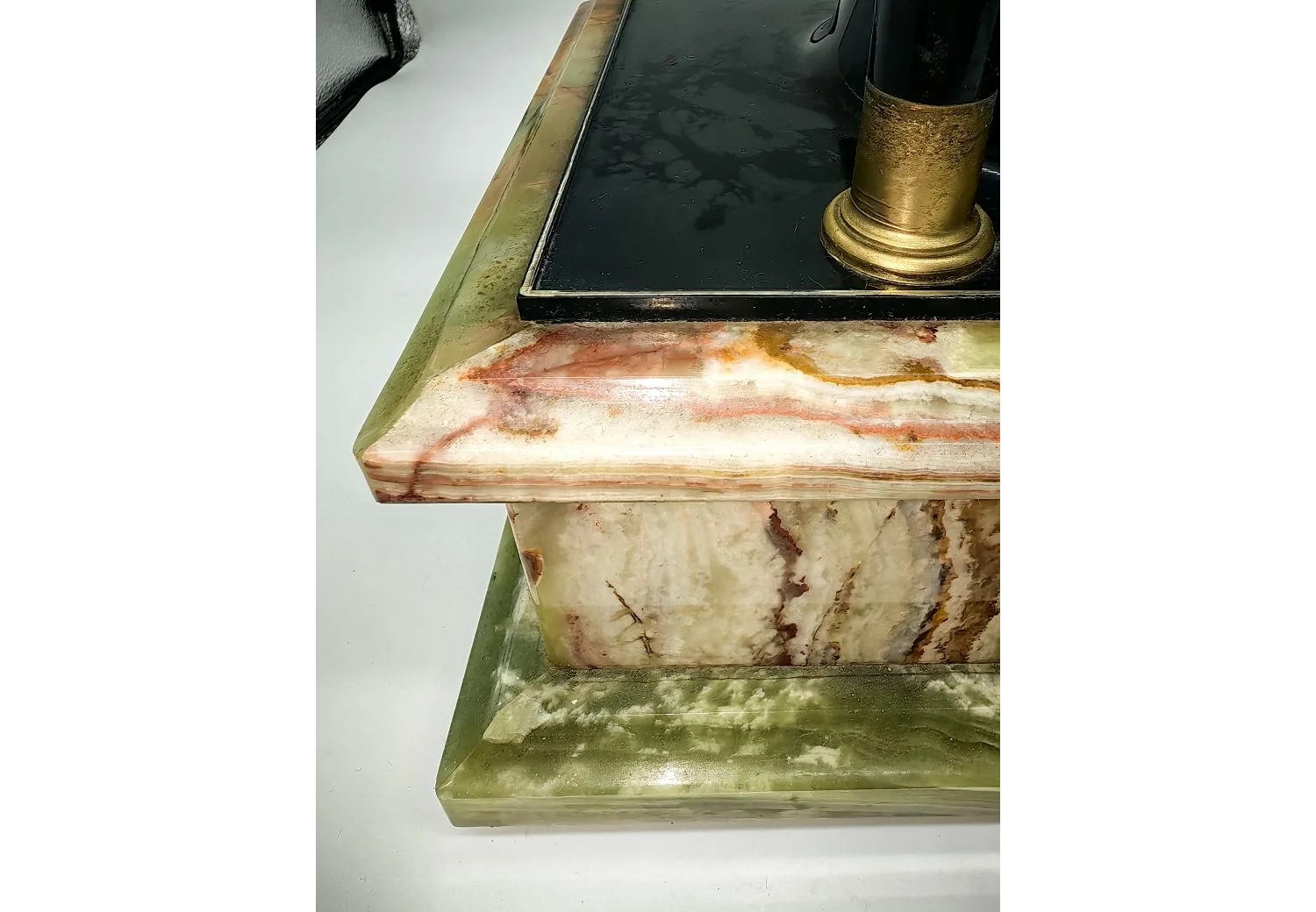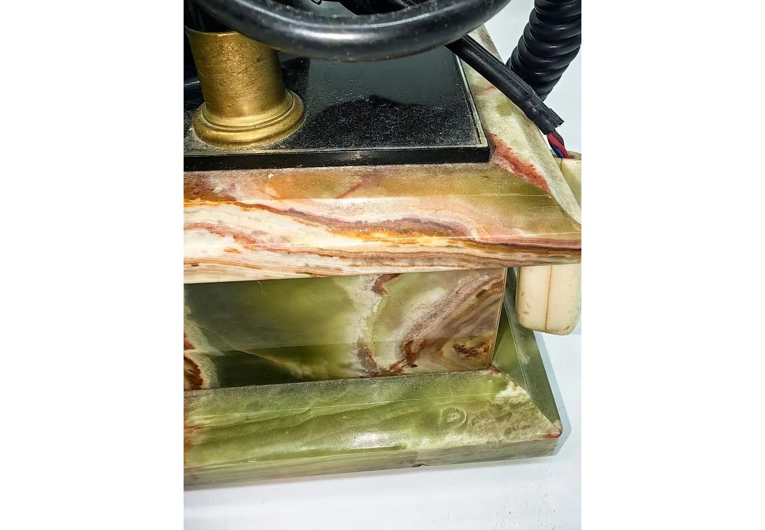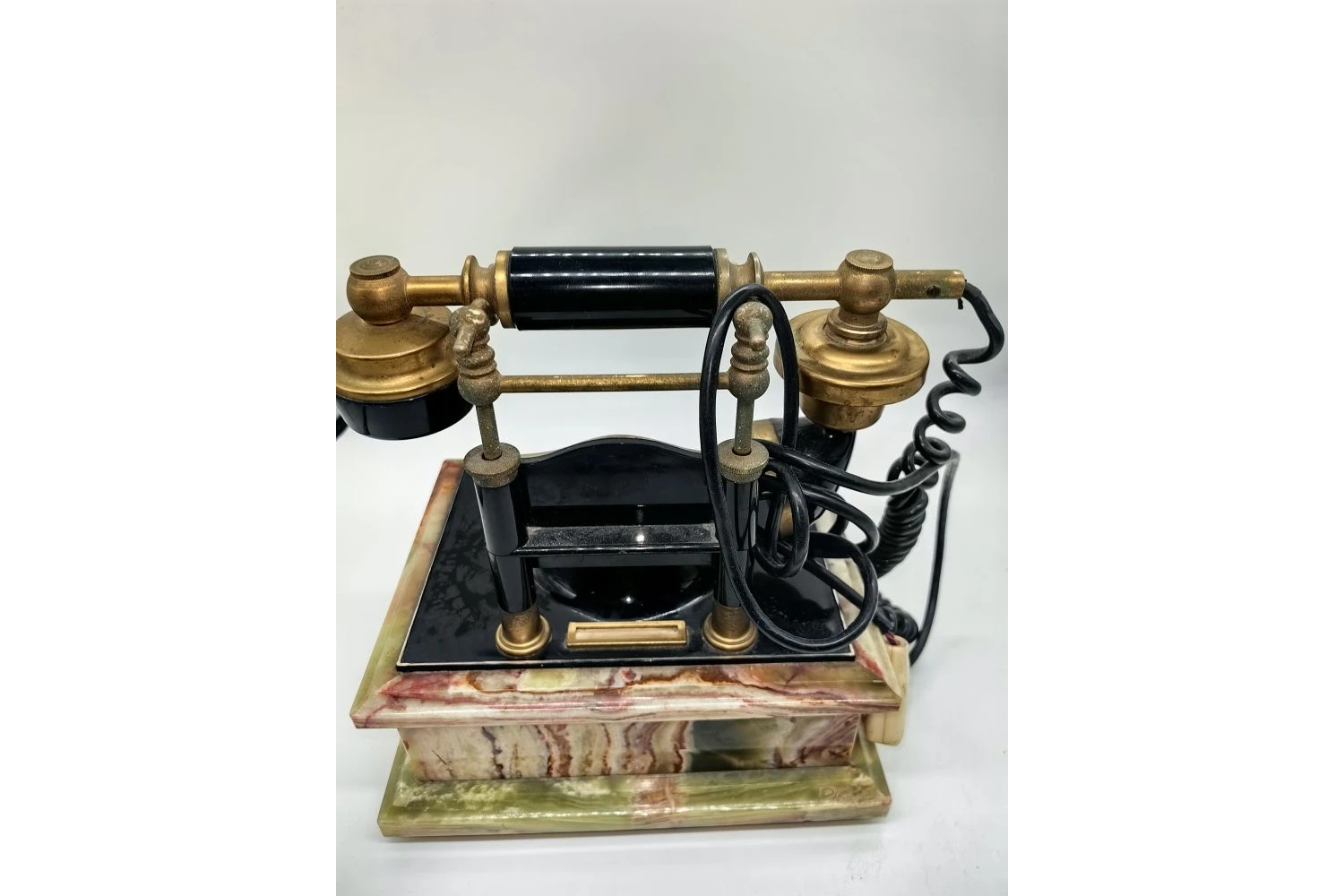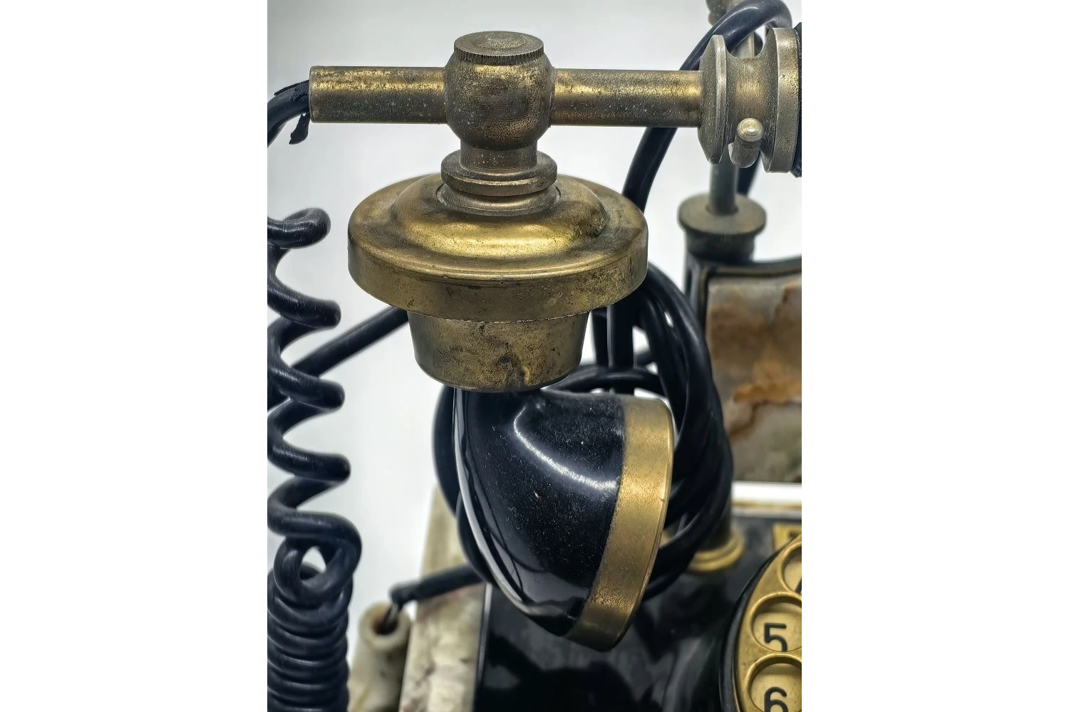 Редкий предмет интерьера и технического наследия — антикварный дисковый телефон, сочетающий натуральный камень (оникс) и металлические элементы. Изделие воплощает эстетику начала XX века: утончённую роскошь материалов и инженерную мысль эпохи становления телефонной связи.