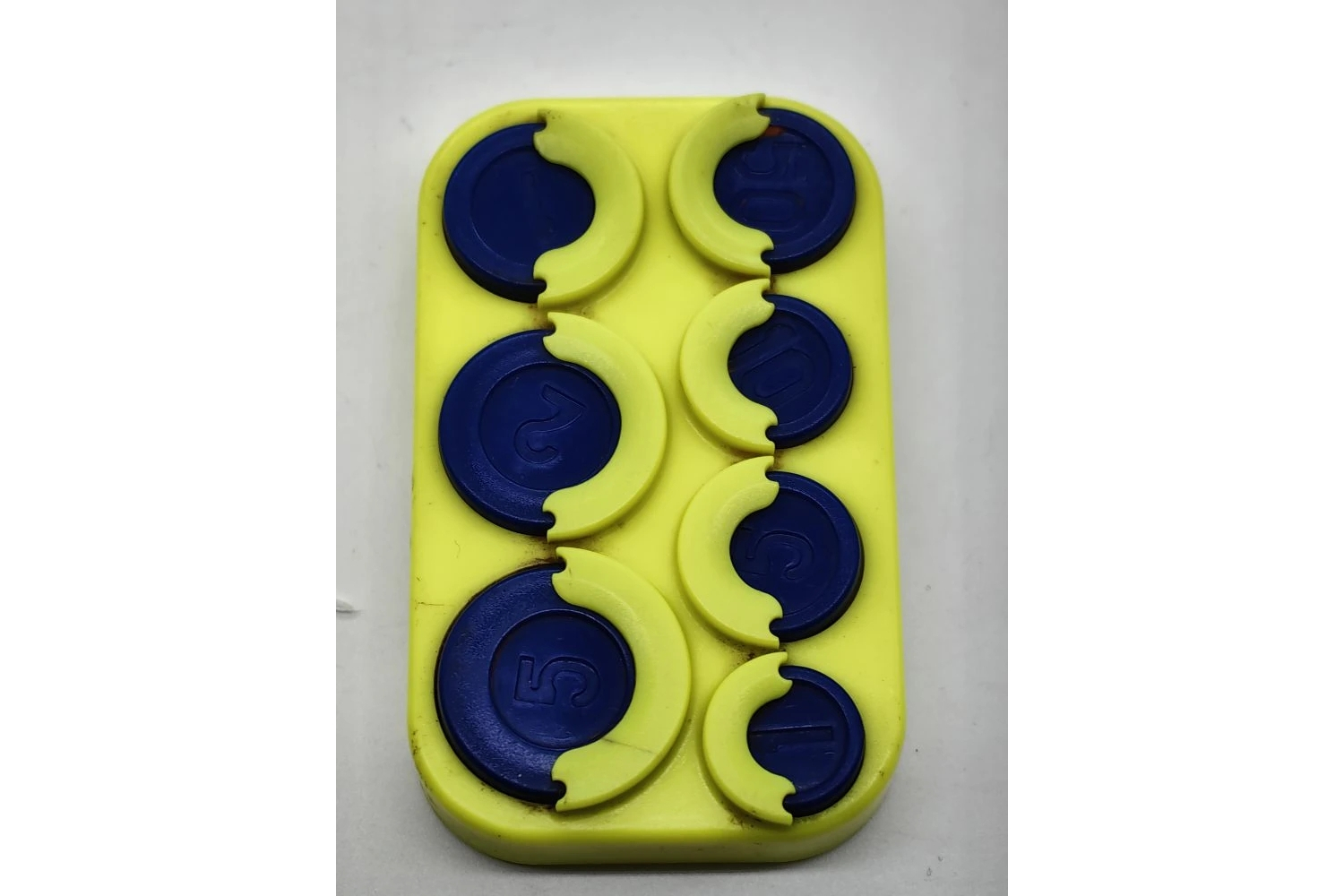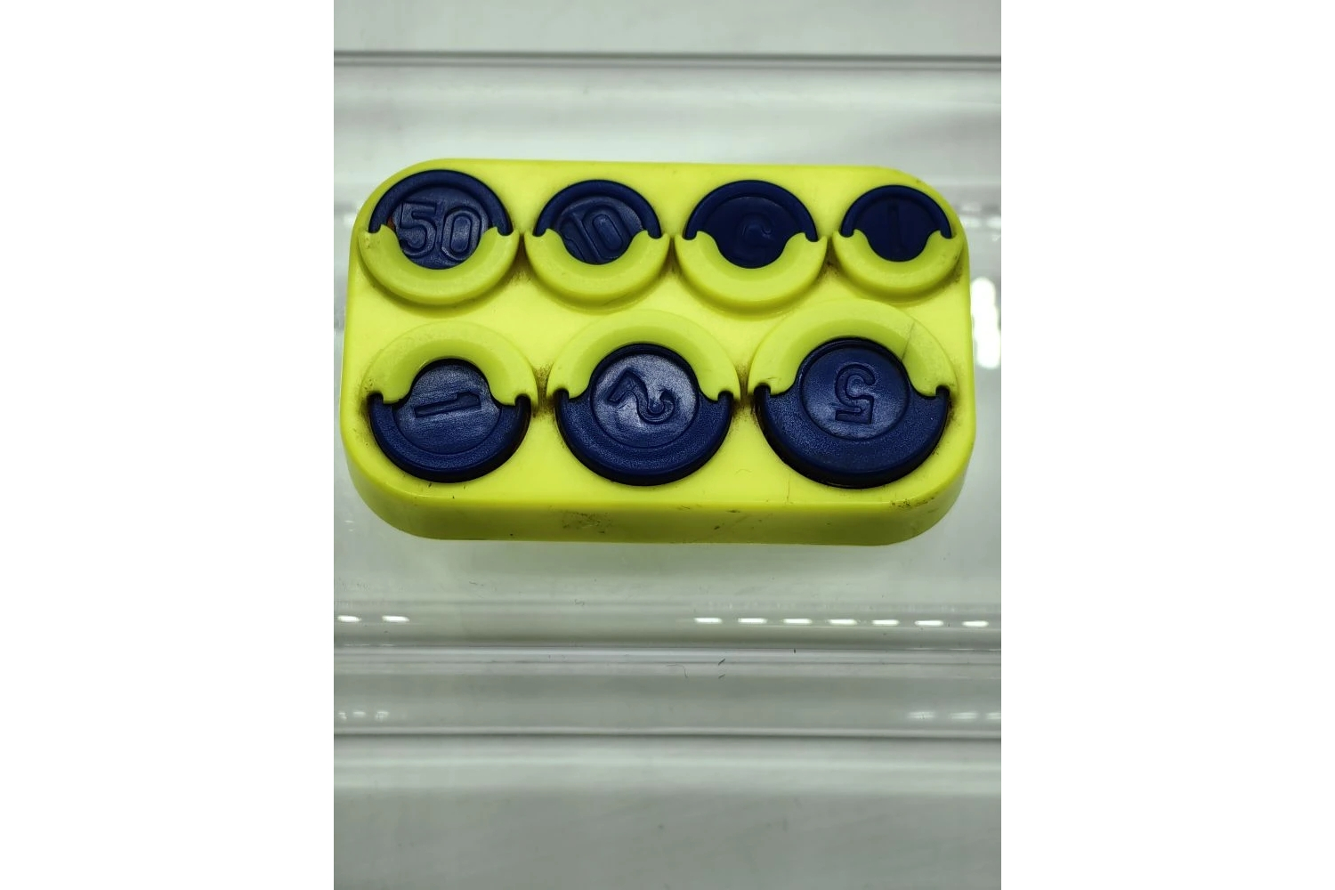 Ячейки/гнёзда для монет разного номинала (1, 2, 3, 5, 10, 15, 20 копеек). Каждая ячейка рассчитана на диаметр конкретной монеты.