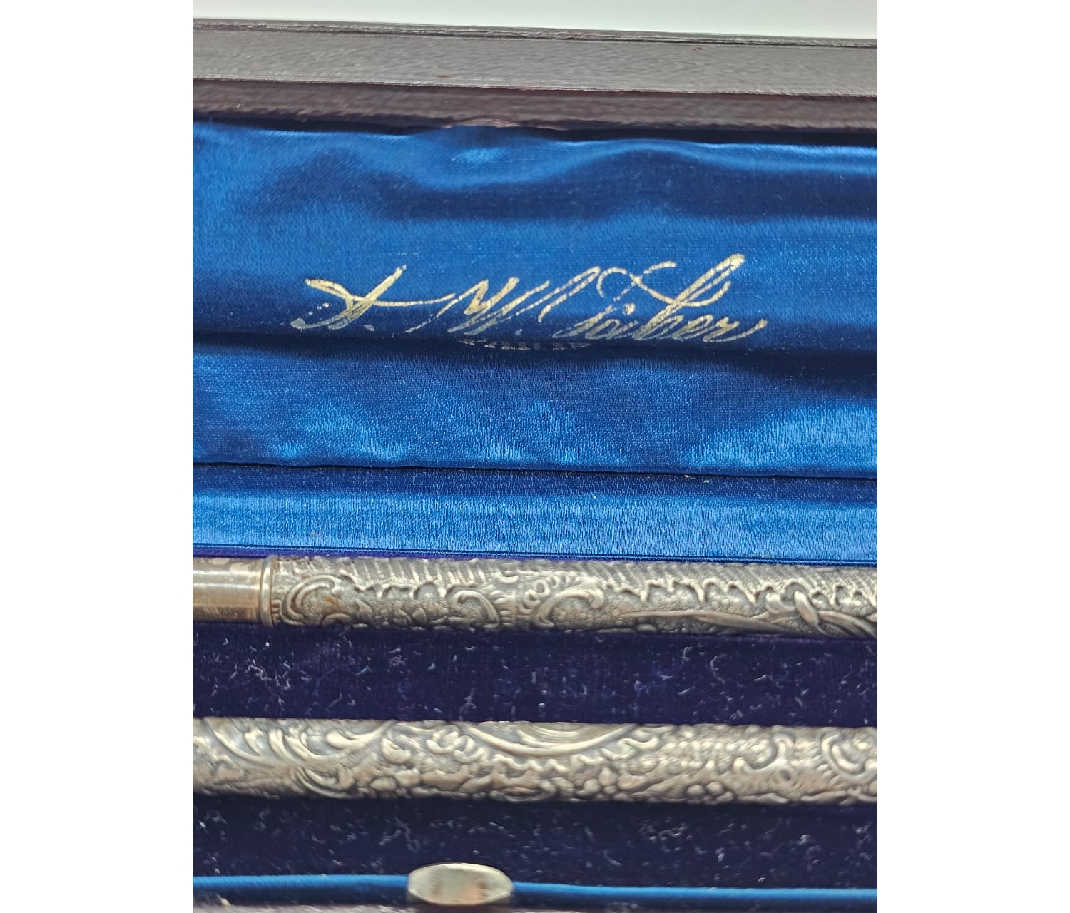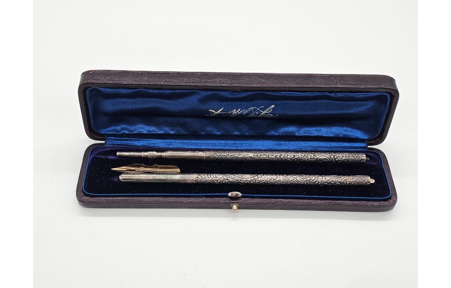 Этот набор представляет собой исключительный образец ювелирного искусства XIX века. Сочетание функциональности и художественного исполнения делает его не только практичным письменным прибором, но и настоящим произведением искусства, достойным места в любой коллекции антиквариата. Сохранность оригинального футляра подчёркивает аутентичность и историческую ценность комплекта.