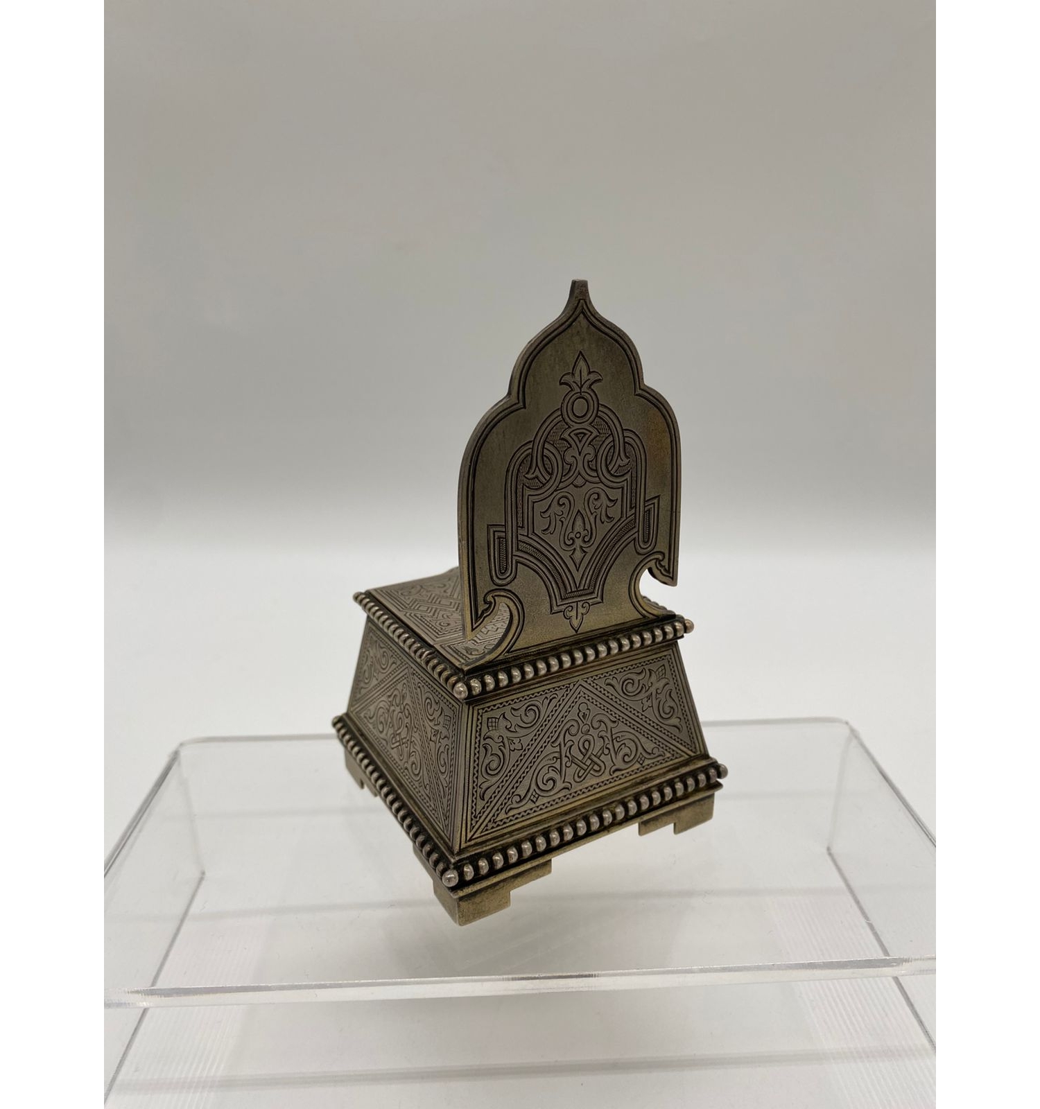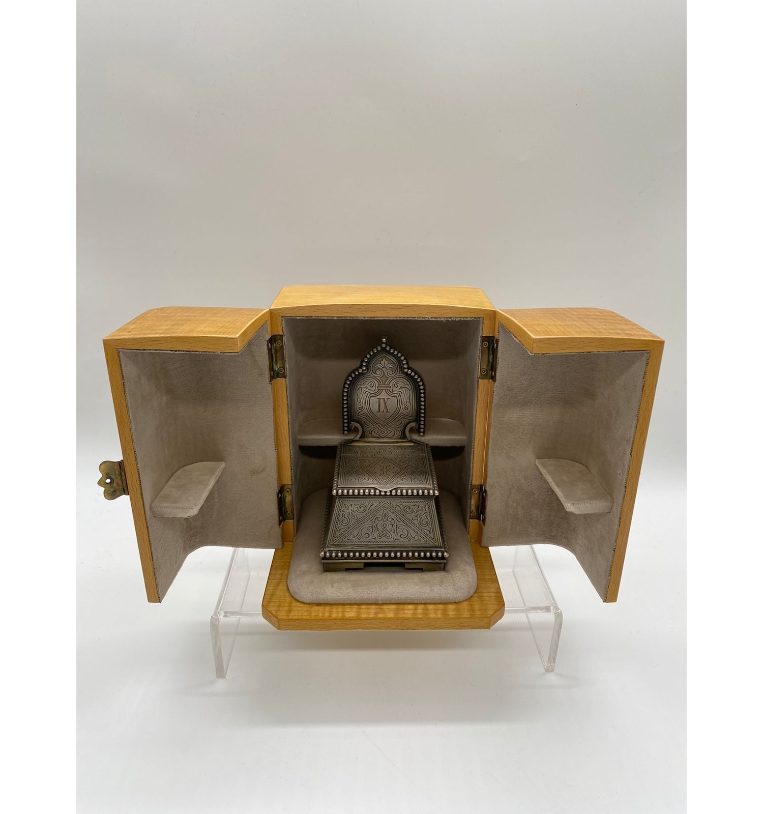 Уникальная форма этой серебряной солонки выполнена в виде изящного стульчика, что делает её не только функциональным предметом сервировки, но и настоящим произведением искусства.