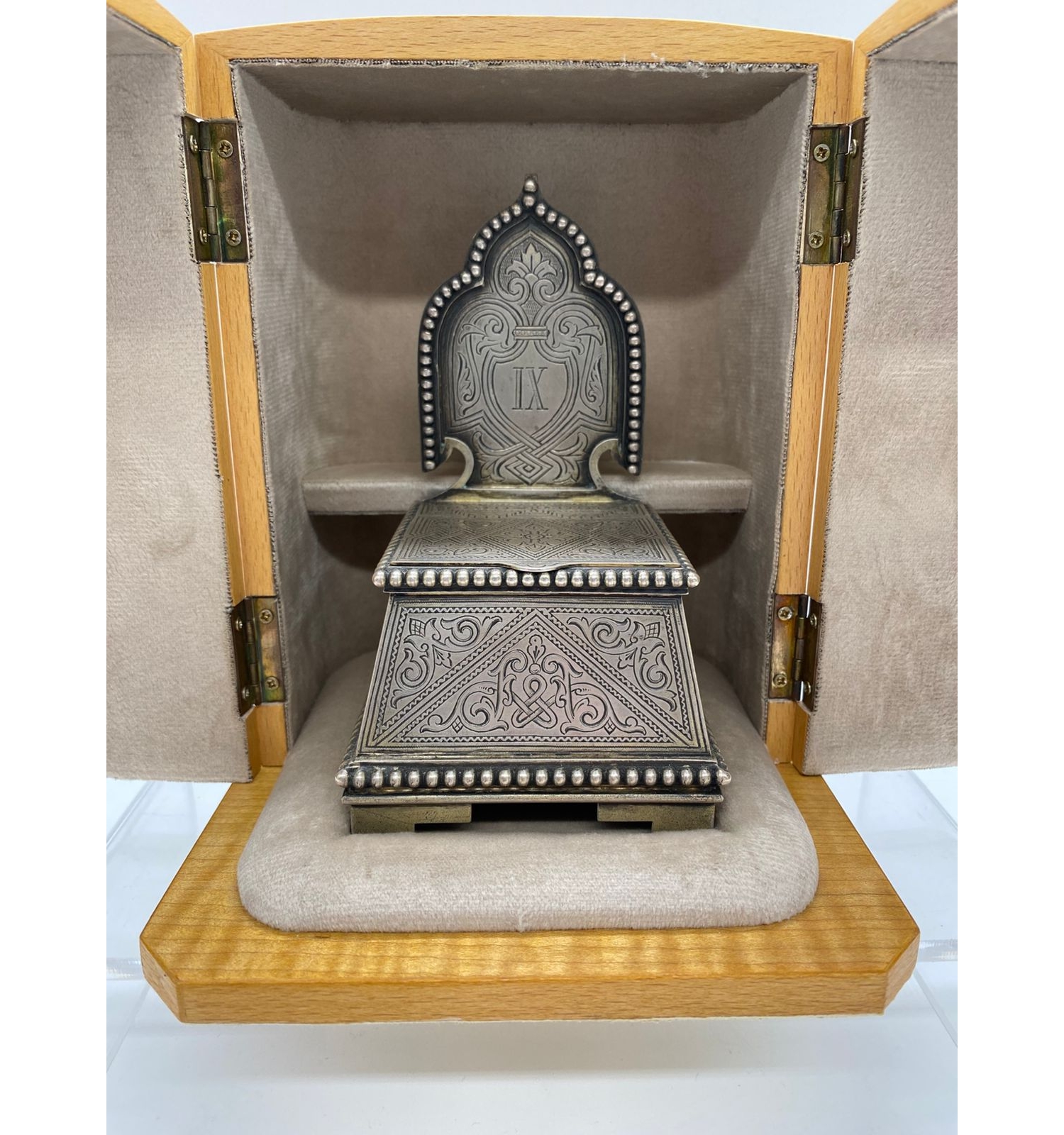 Эта серебряная солонка-стульчик представляет собой не только функциональный предмет сервировки, но и ценный образец декоративно-прикладного искусства, который станет украшением любой коллекции антиквариата. Работы мастера И. Хлебникова высоко ценятся на антикварном рынке и считаются показателем безупречного вкуса их владельцев.