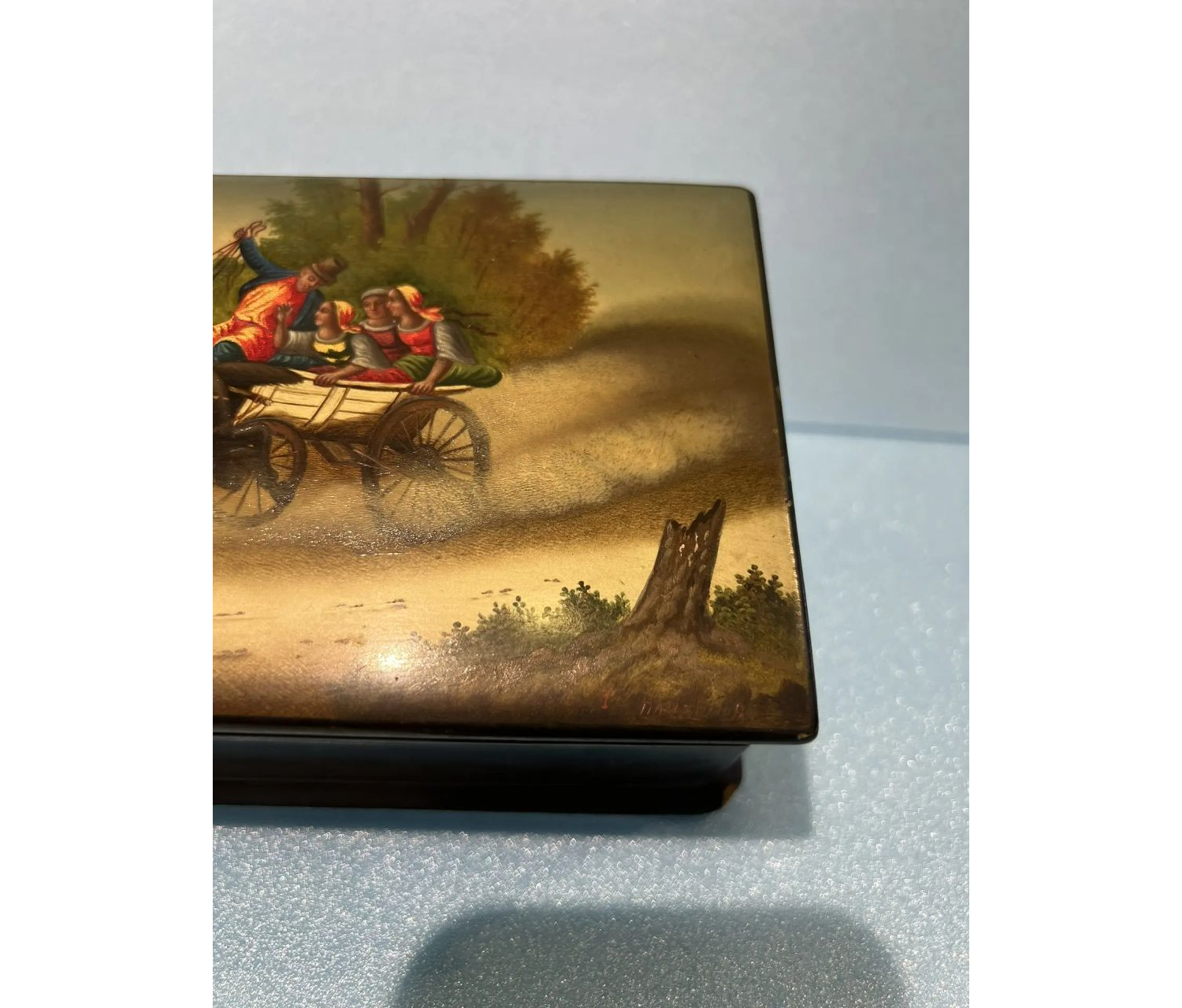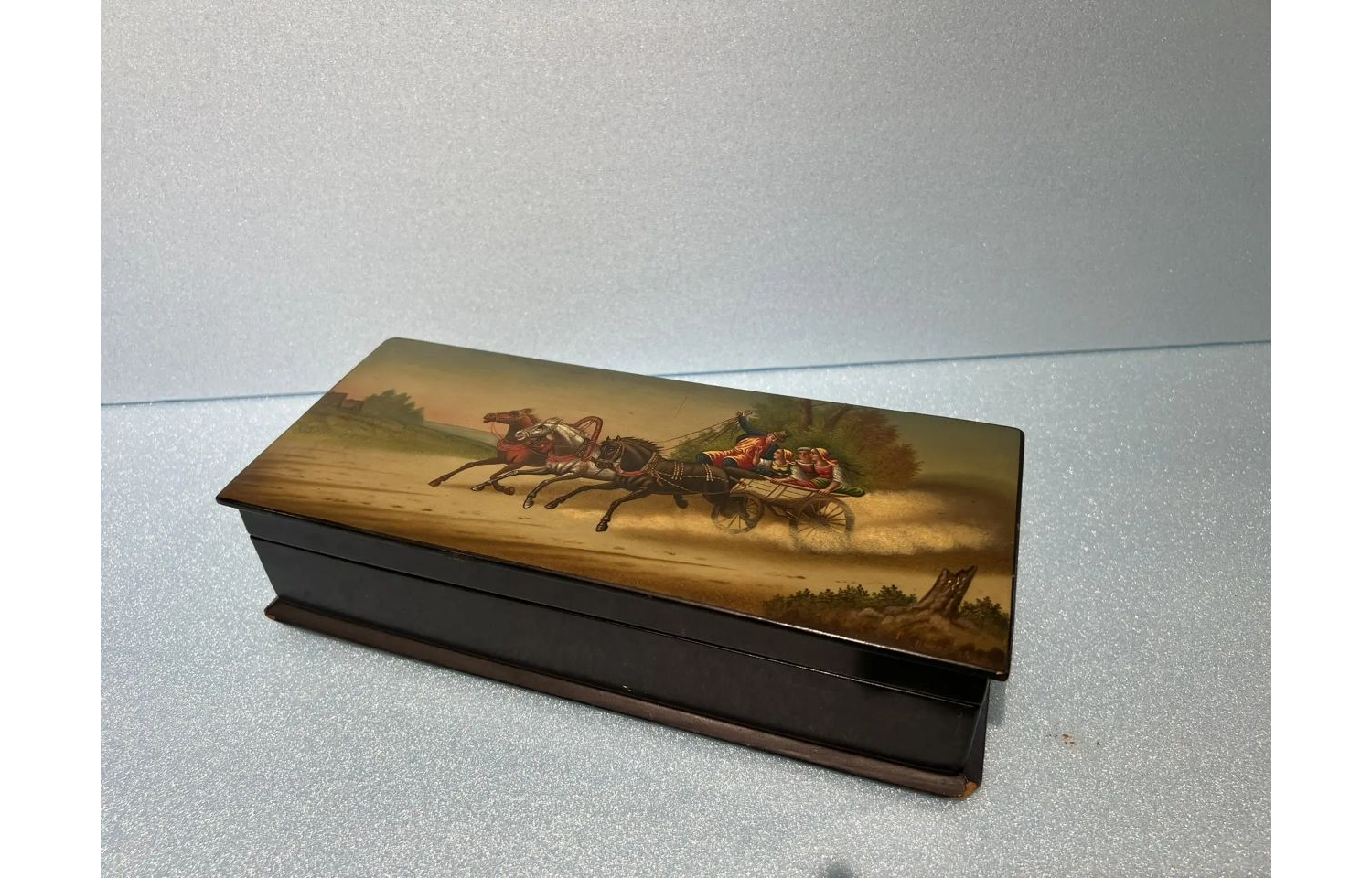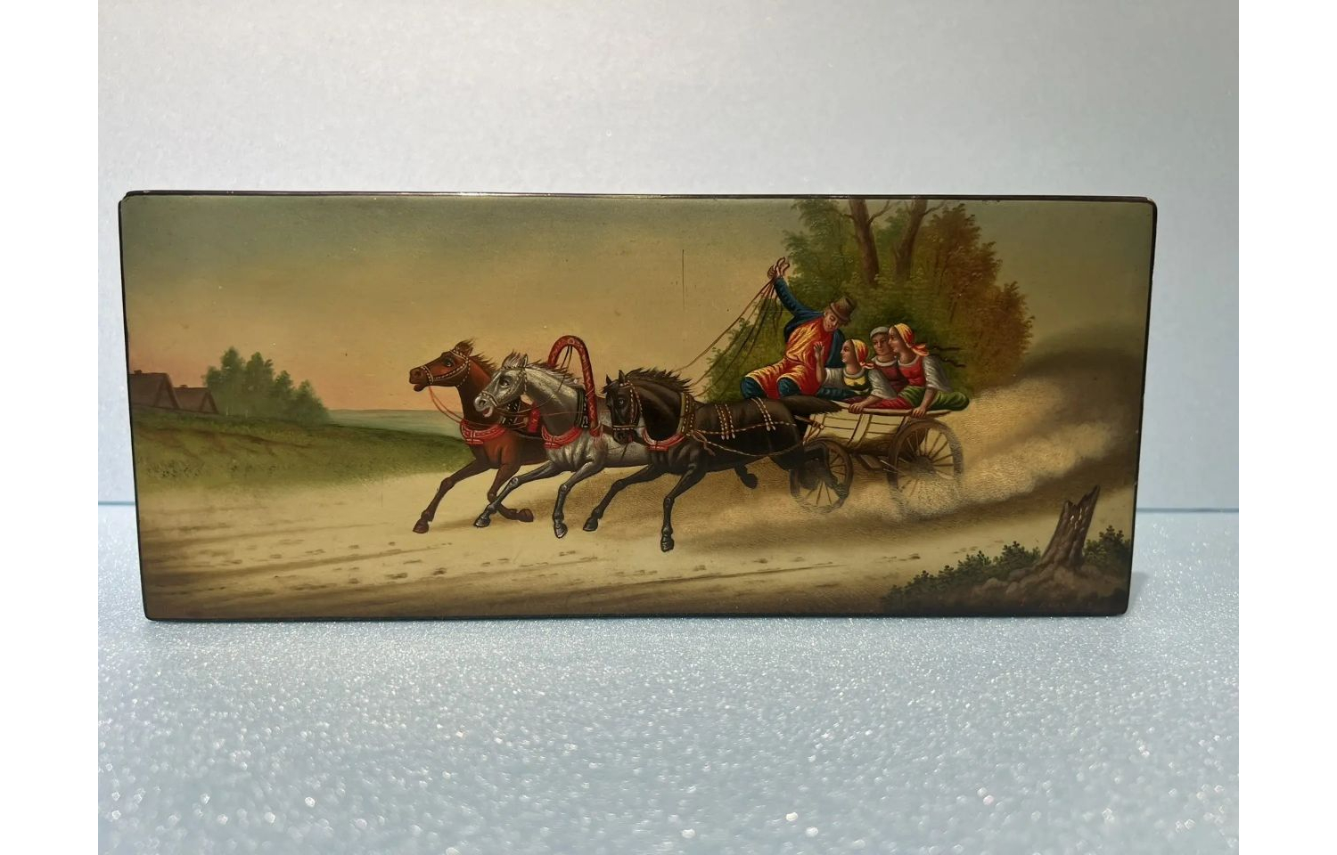 Авторская антикварная шкатулка Федоскино с изображением тройки — это произведение лаковой миниатюры, созданное вручную по традиционным технологиям. Такие шкатулки изготавливались из папье-маше, расписывались масляными красками и покрывались лаком.