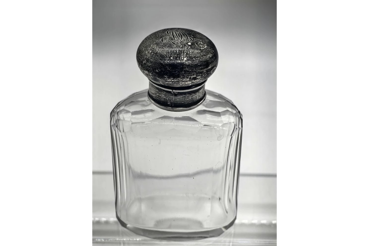 Изысканный парфюмерный флакон английского производства — образец викторианского стиля и мастерства стеклодувов и ювелиров XIX века. Сочетание художественного стекла и серебряной крышки с чеканкой делает предмет желанным экспонатом для коллекционеров и ценителей антикварной эстетики.