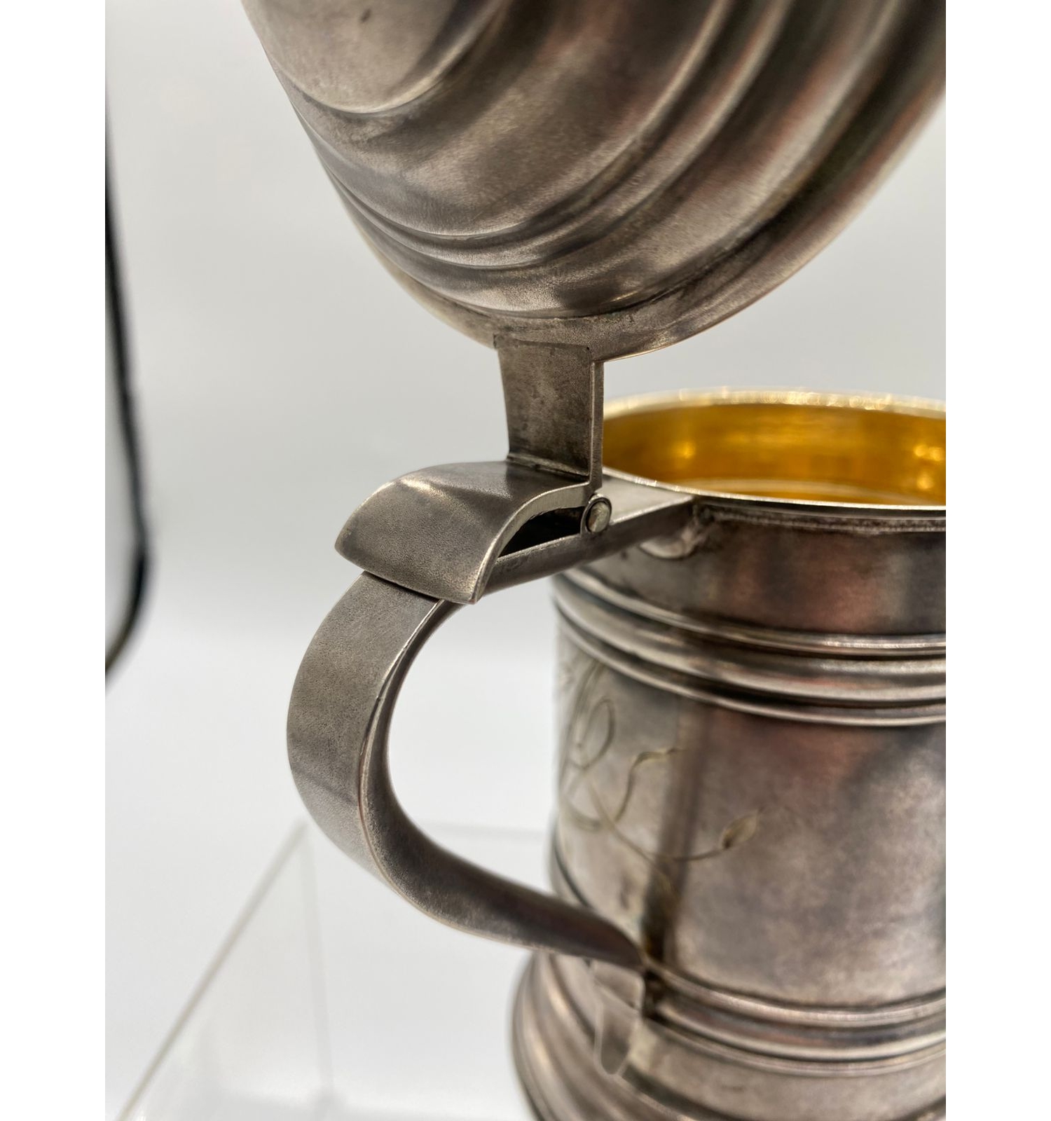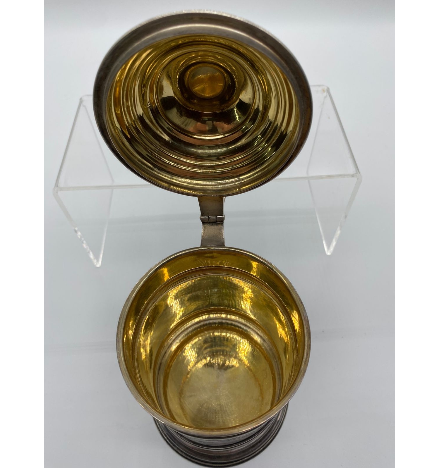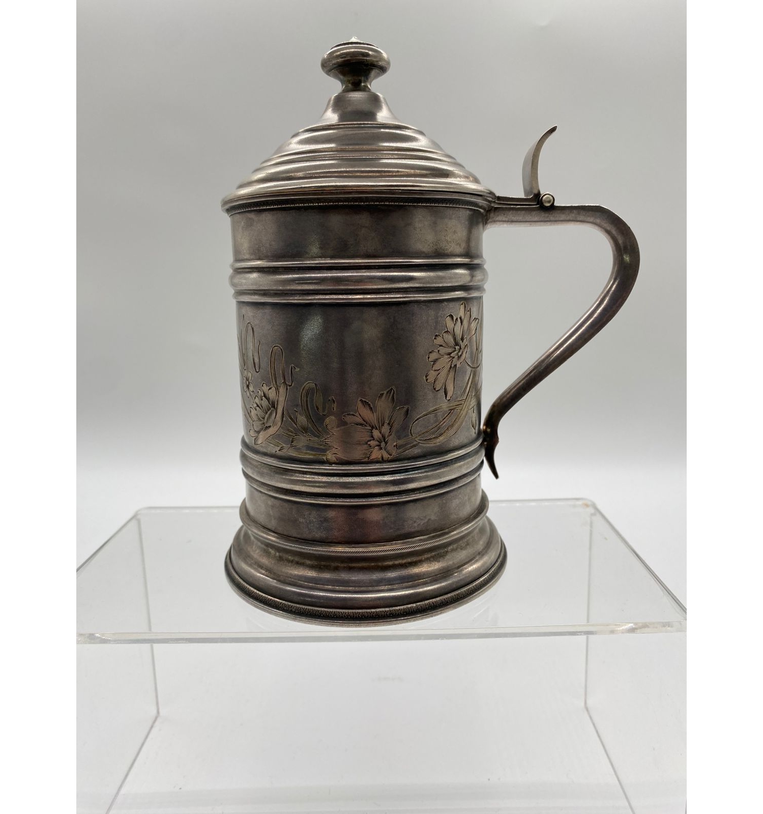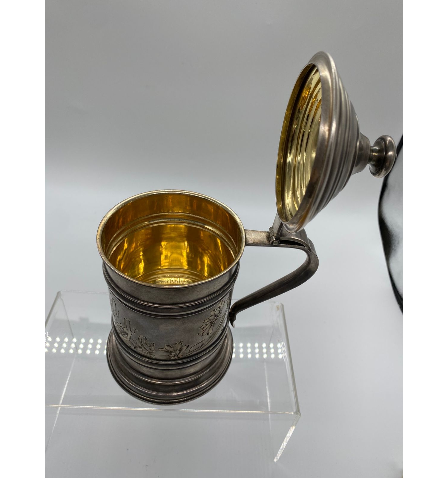 Эта кружка — не просто функциональный предмет для напитков, а настоящее произведение искусства, воплотившее в себе мастерство русских ювелиров. Изысканный цветочный орнамент в сочетании с благородным металлом и позолотой делает её достойным украшением любого застолья и ценной частью коллекции антиквариата.