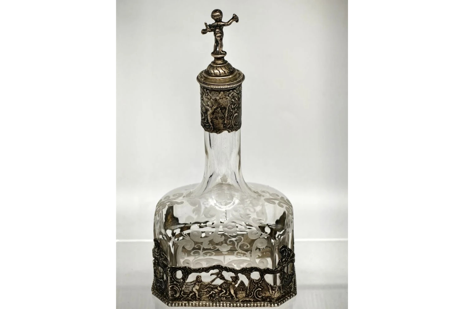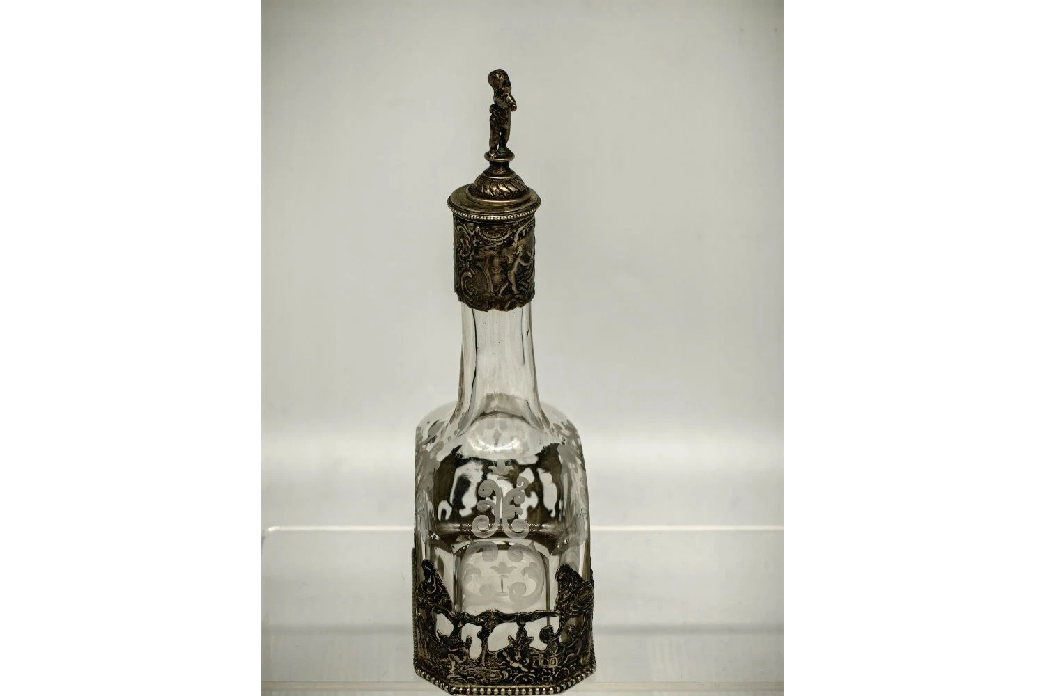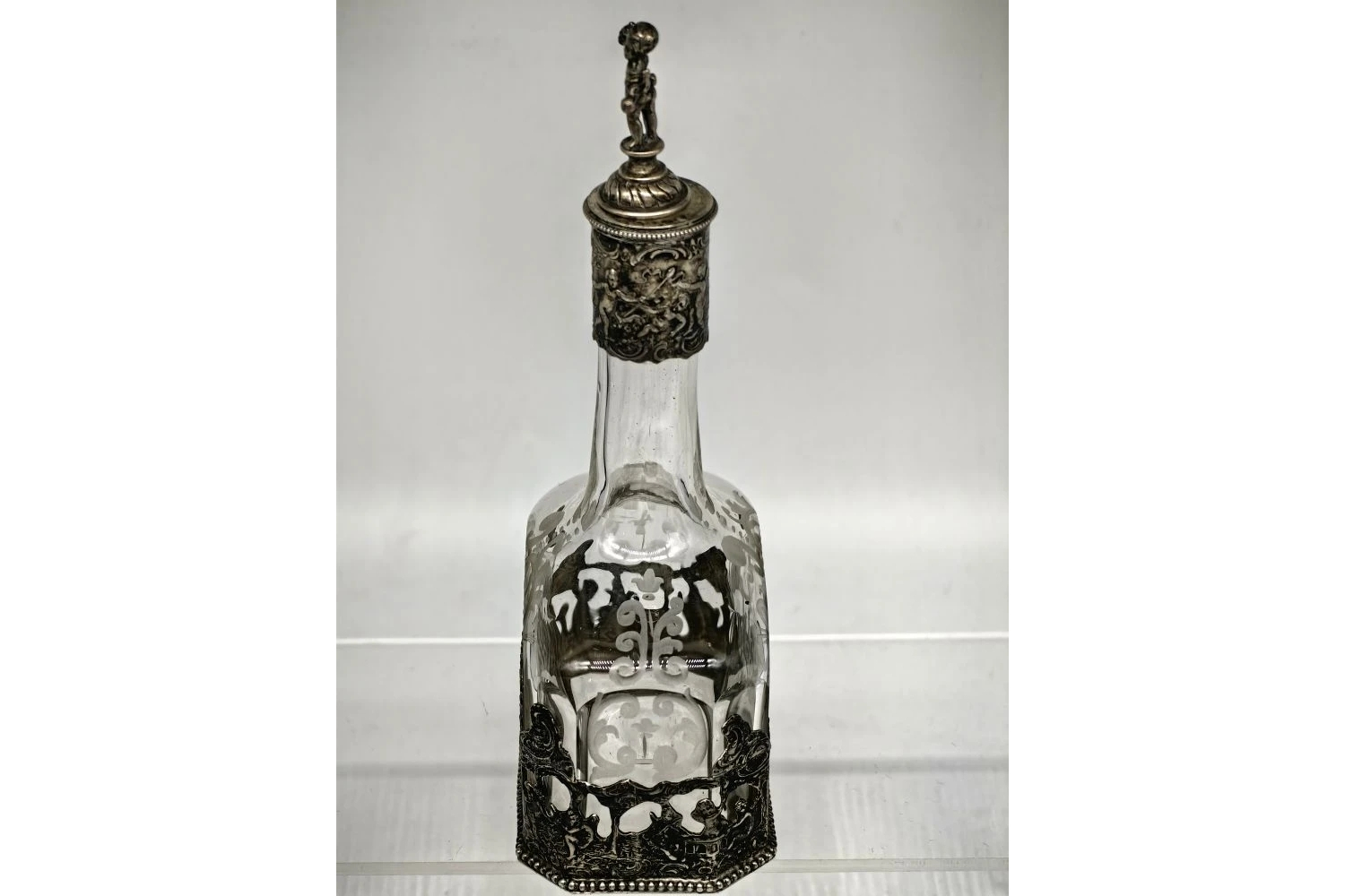 Изысканный антикварный графин — образец декоративно‑прикладного искусства, сочетающий мастерство стеклодувов и серебряных дел мастеров. Подходит для коллекционирования, тематических сервировок или в качестве статусного подарка.