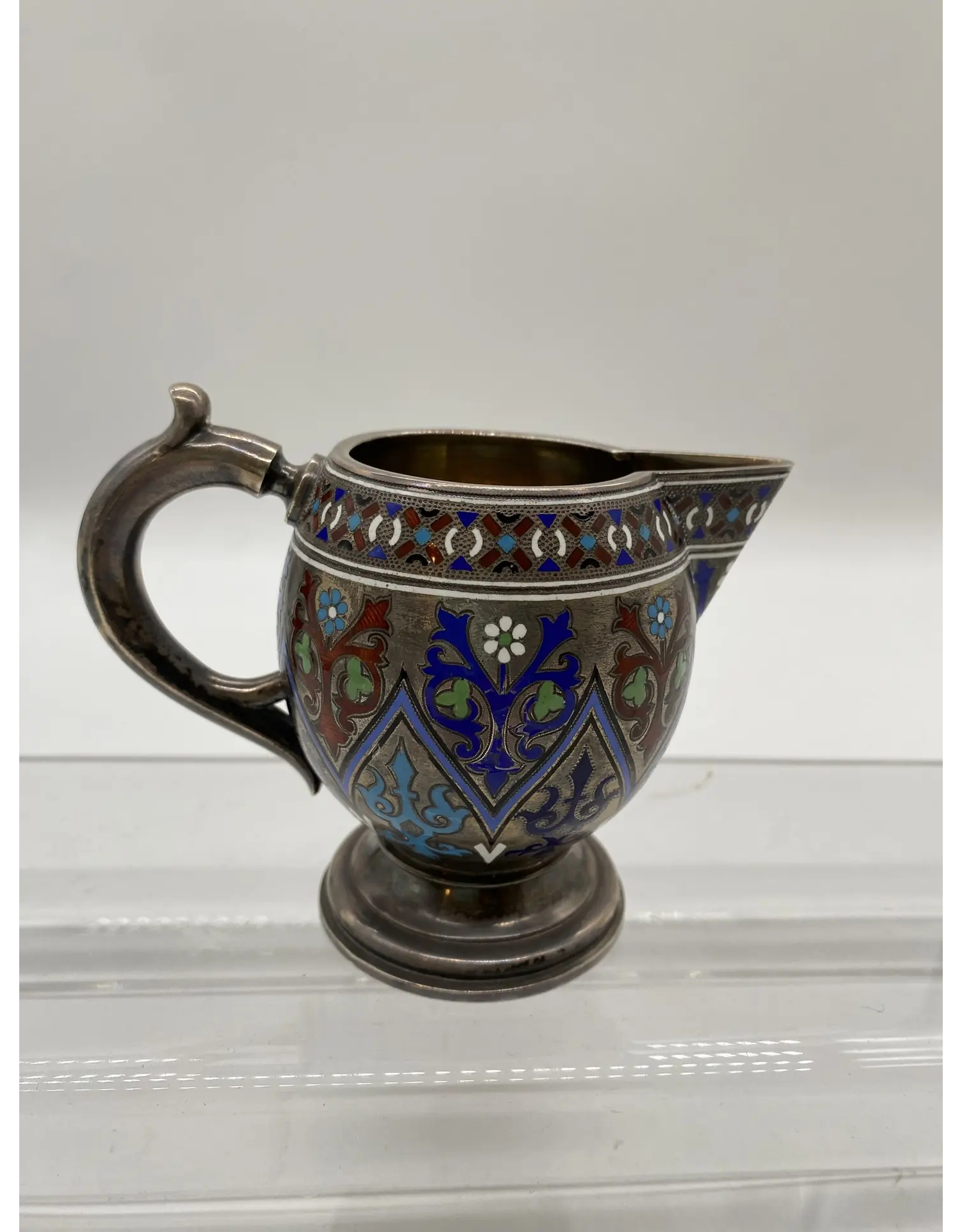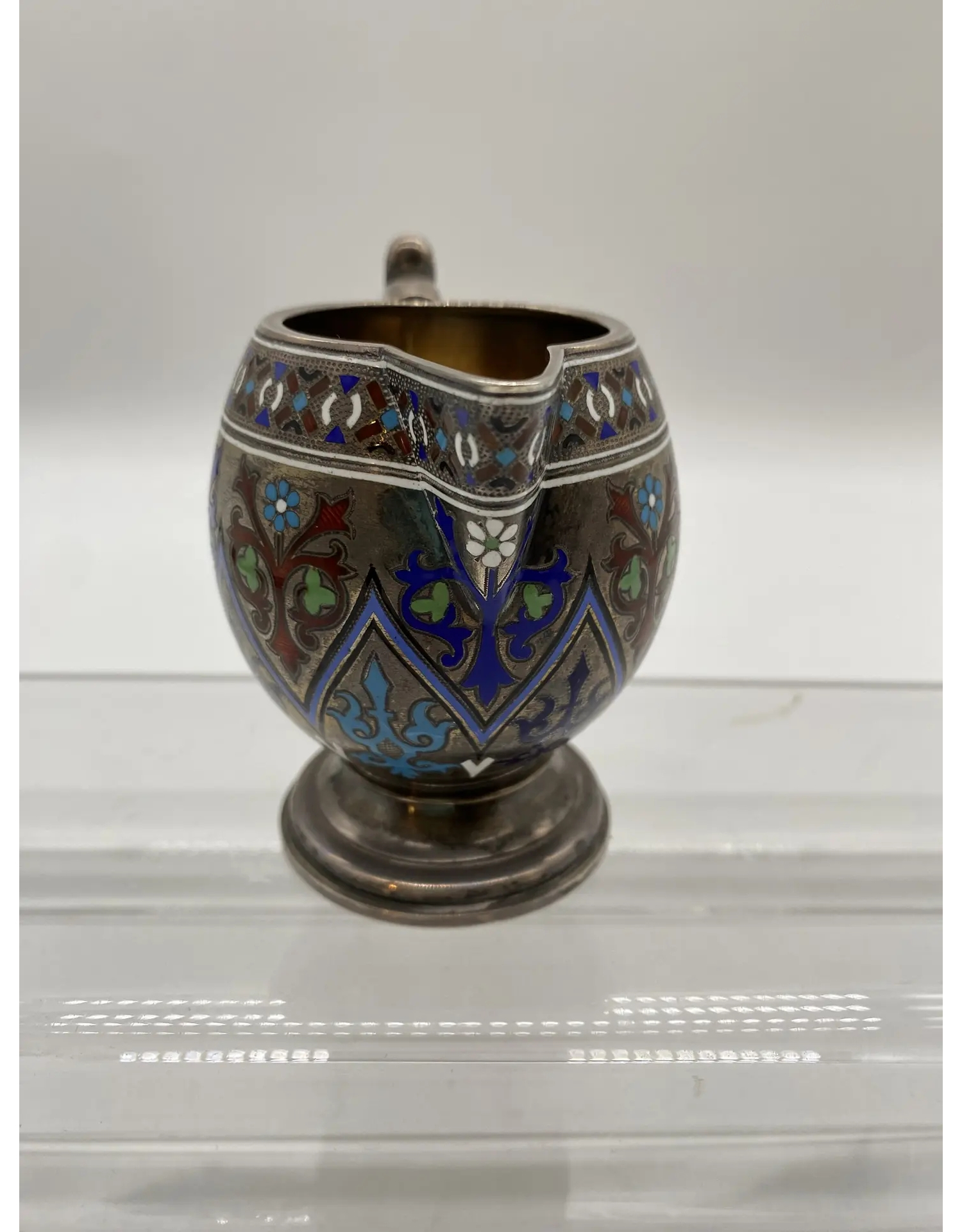 Серебряный молочник с эмалью XIX века — это предмет столового серебра, украшенный художественной эмалью, изготовленный из серебра 88 пробы. Такие изделия были распространены в России в период расцвета эмальерного искусства, особенно во второй половине XIX века, когда получили распространение технически сложные виды ювелирных эмалей: эмаль по скани, витражная, эмаль по гильошированному фону.