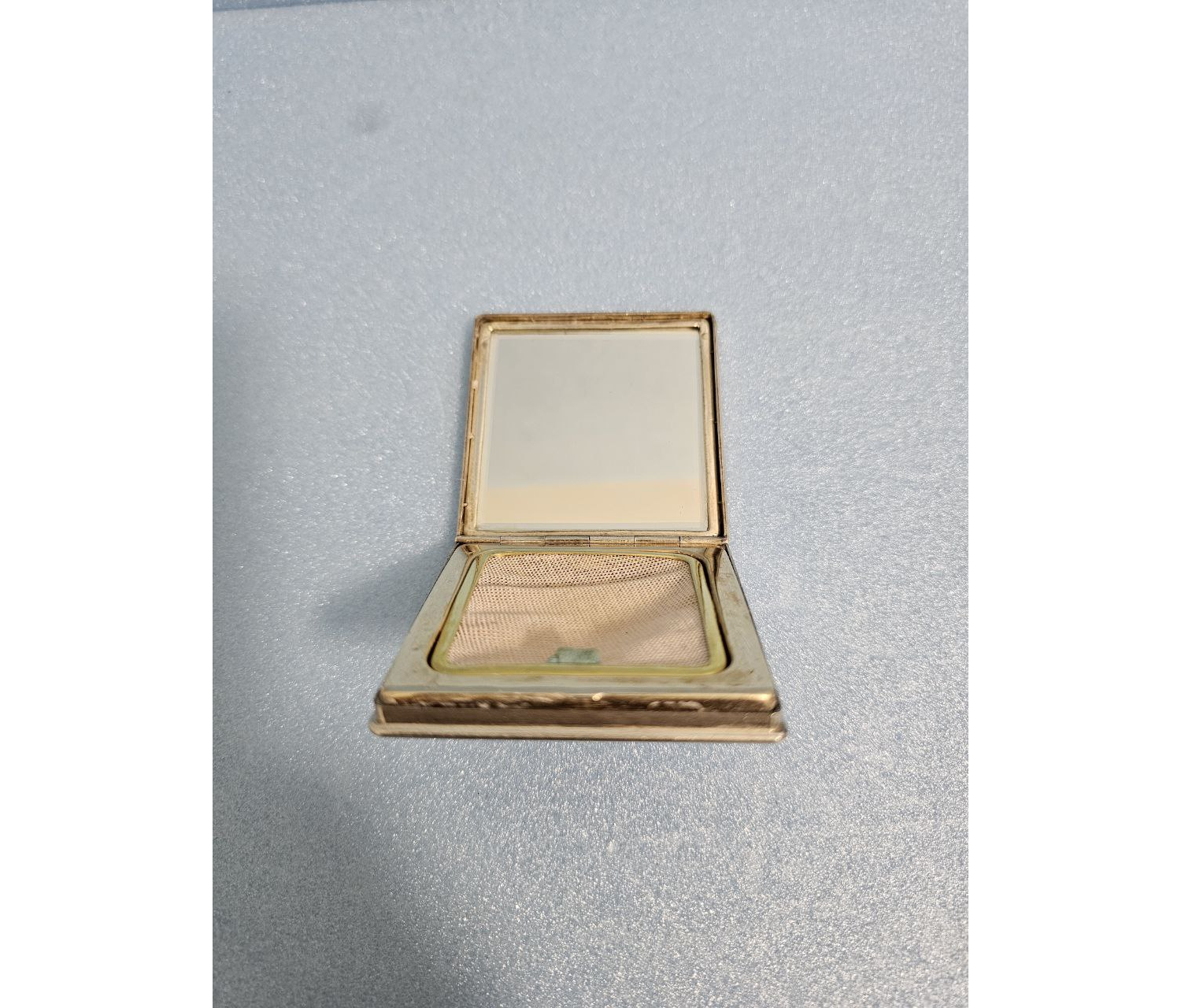 На внутренней стороне крышки обычно располагается маленькое зеркальце в серебряной оправе (в отличном состоянии — без сколов и потускнения). Внутри корпуса — отсек для пудры с бархатной или атласной подложкой (сохранность подкладки зависит от бережности использования, но в данном случае она в порядке).