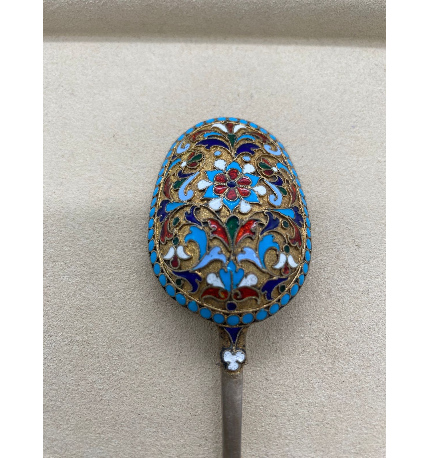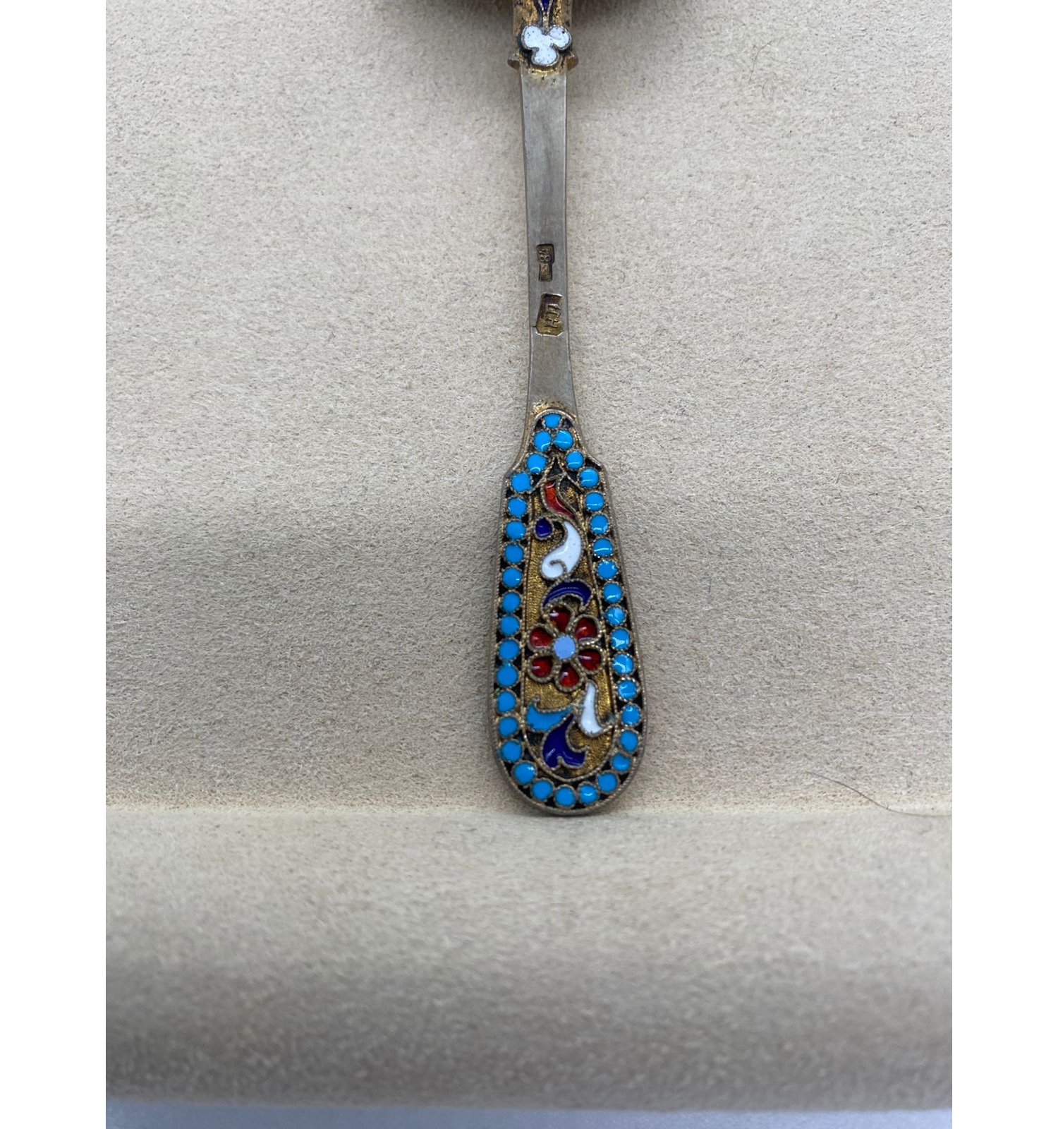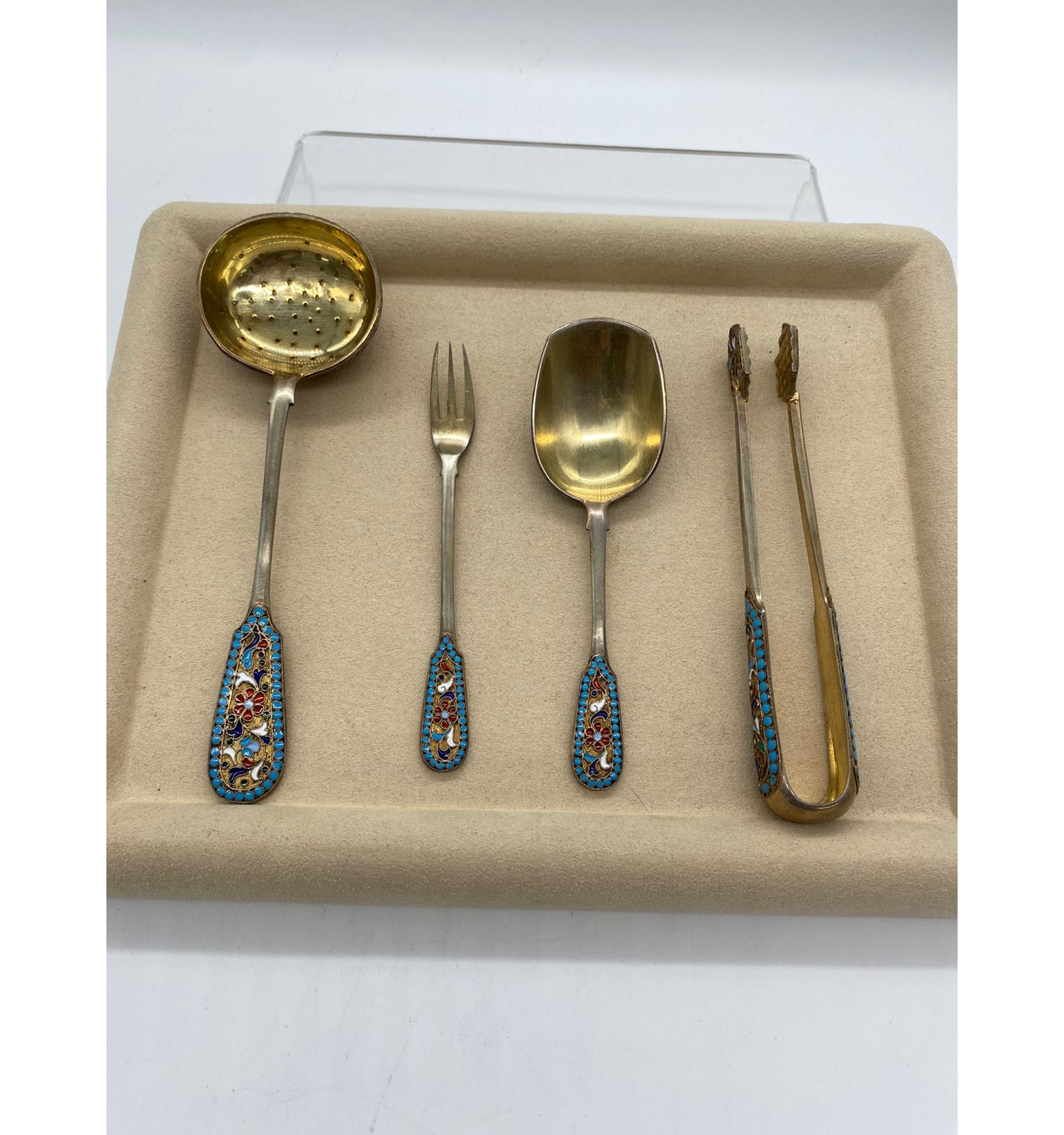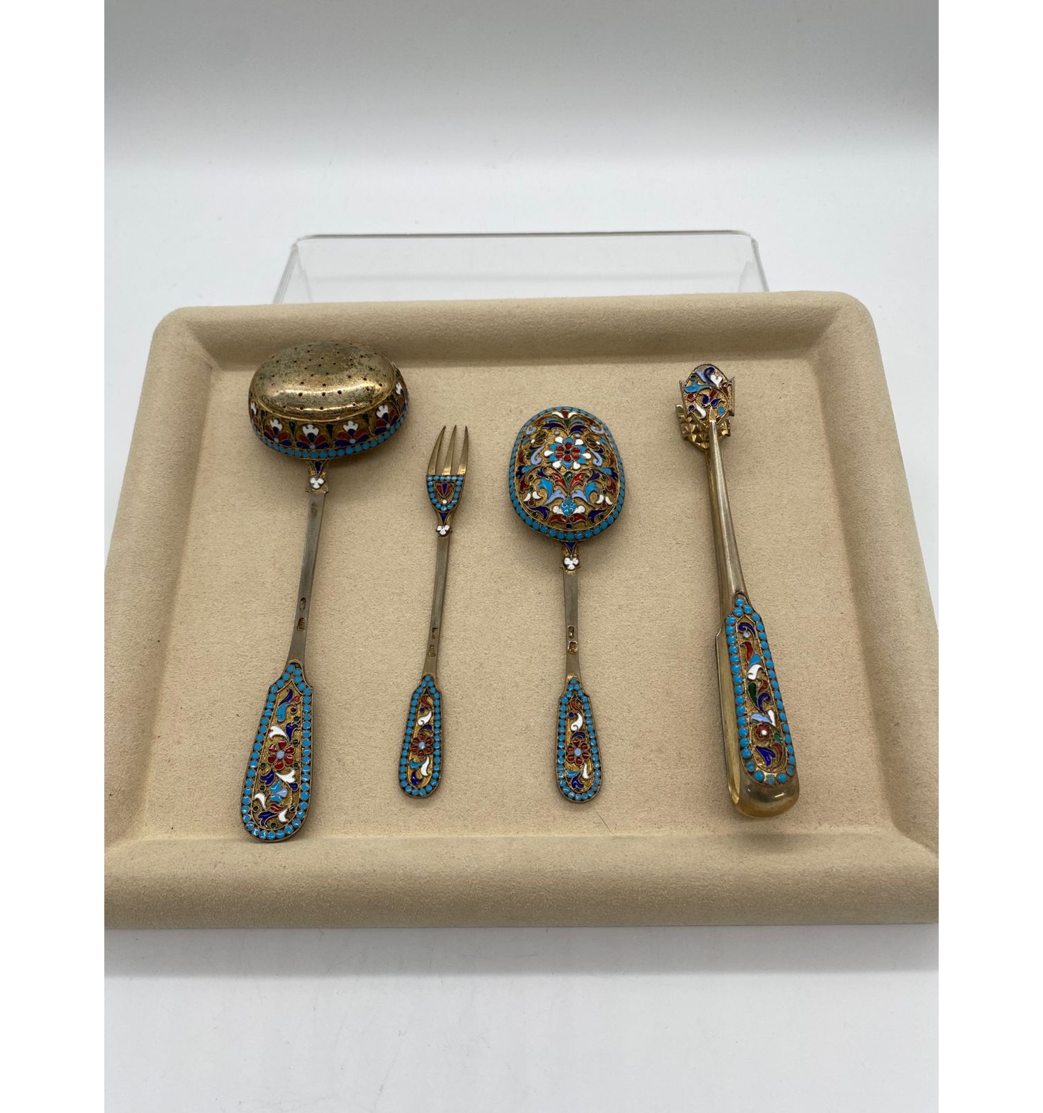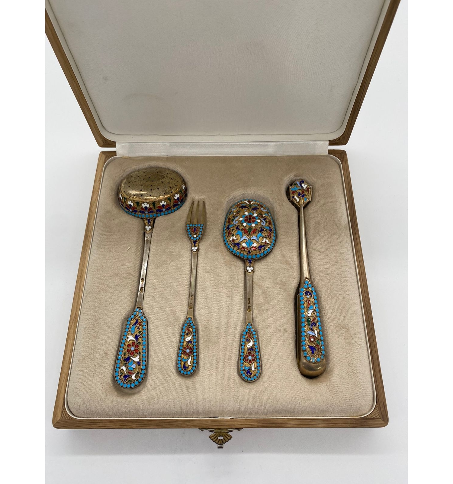 Этот изысканный столовый набор является прекрасным образцом ювелирного искусства Российской империи. Сочетание благородного серебра и техники горячей эмали создает неповторимый декоративный эффект. Работа мастера Н.Л. демонстрирует высочайший уровень владения эмалевыми техниками и обработки металла, что делает набор не только функциональным предметом сервировки, но и ценным произведением декоративно-прикладного искусства.