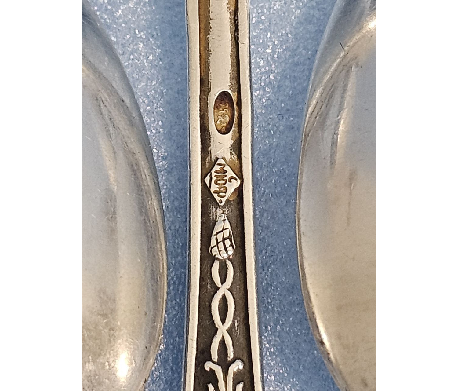 На каждой ложке присутствует чёткое клеймо с обозначением пробы (875) и другими атрибутами, характерными для советского серебряного стандарта.