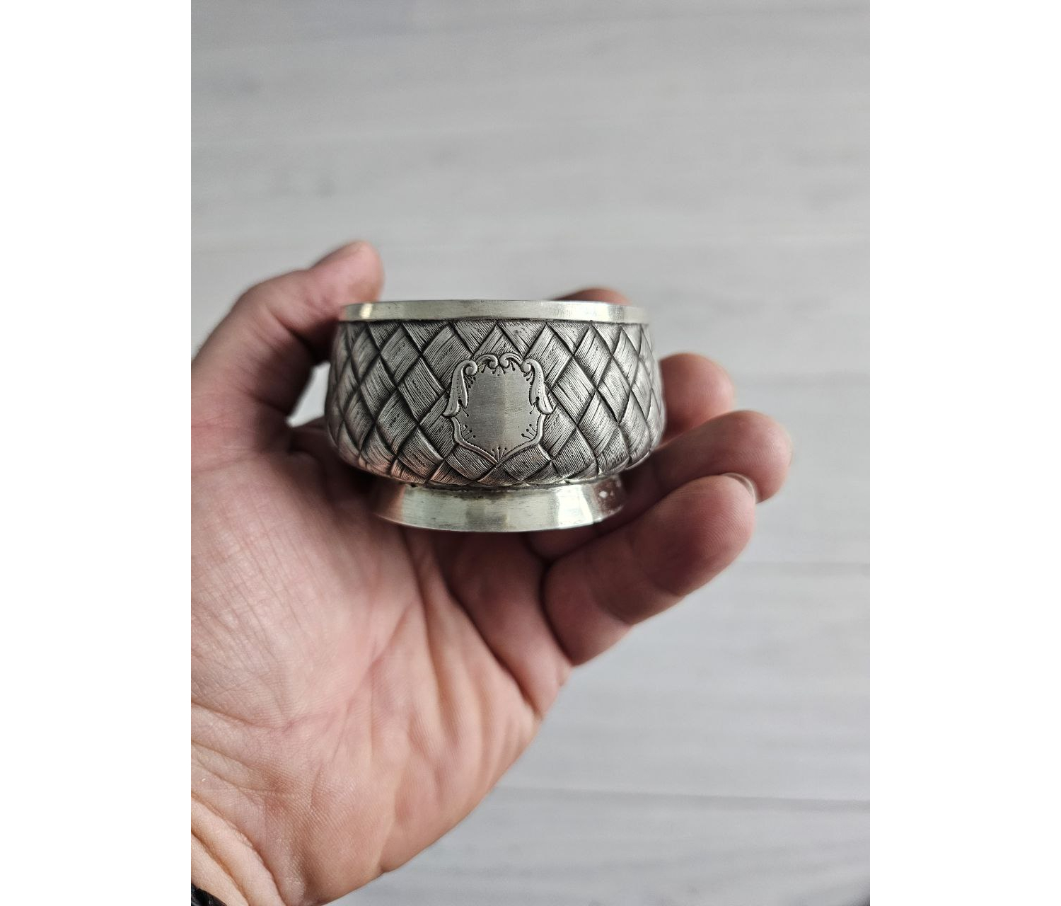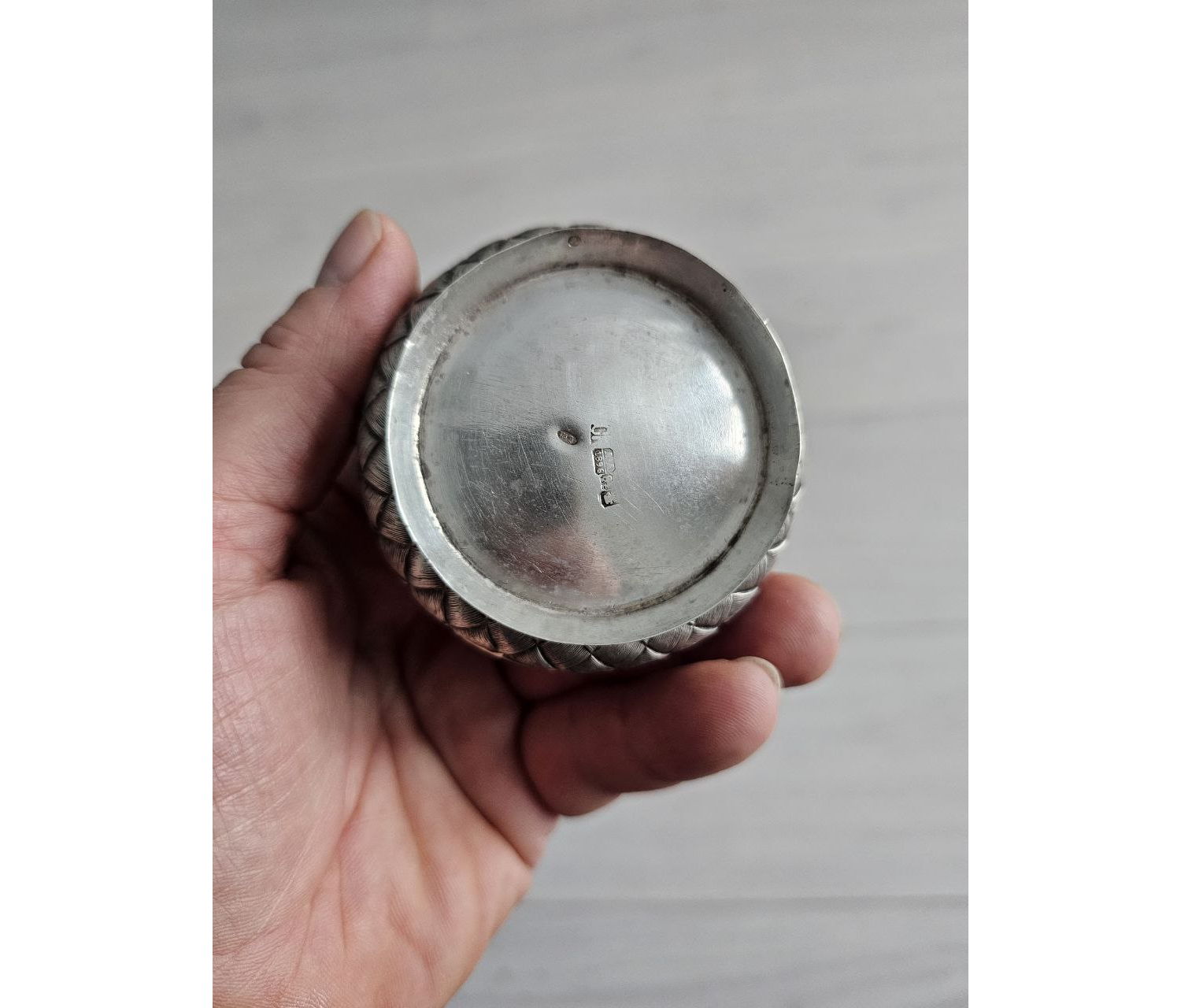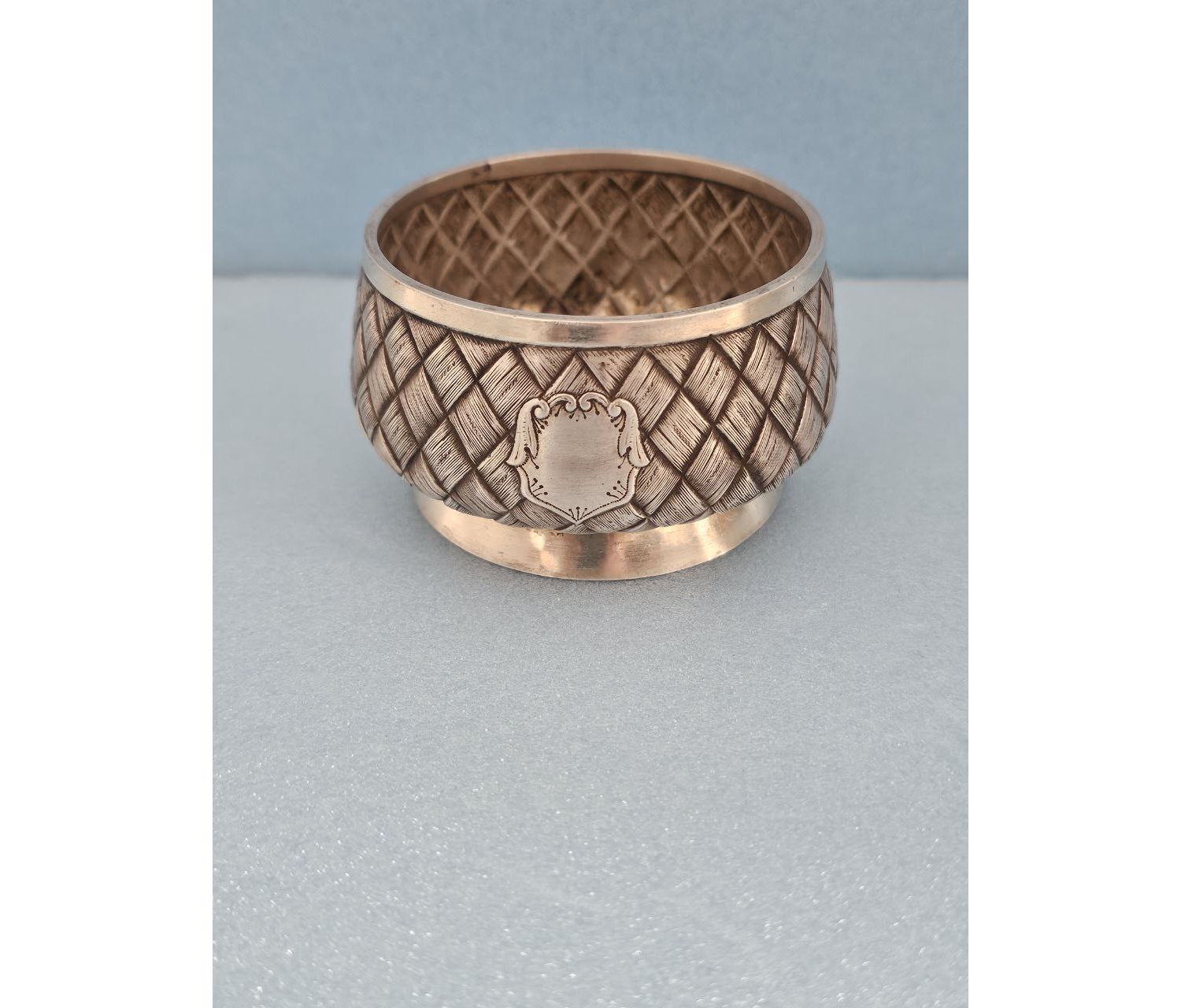 Изящный предмет столового серебра эпохи позднего царствования Александра III или начала правления Николая II. Солонка выполнена в технике «плетёночки» — популярном декоративном решении XIX века, имитирующем плетение из лозы или тростника. Редкий образец мастерства русских серебряных дел мастеров, сочетающий практичность с художественной выразительностью.