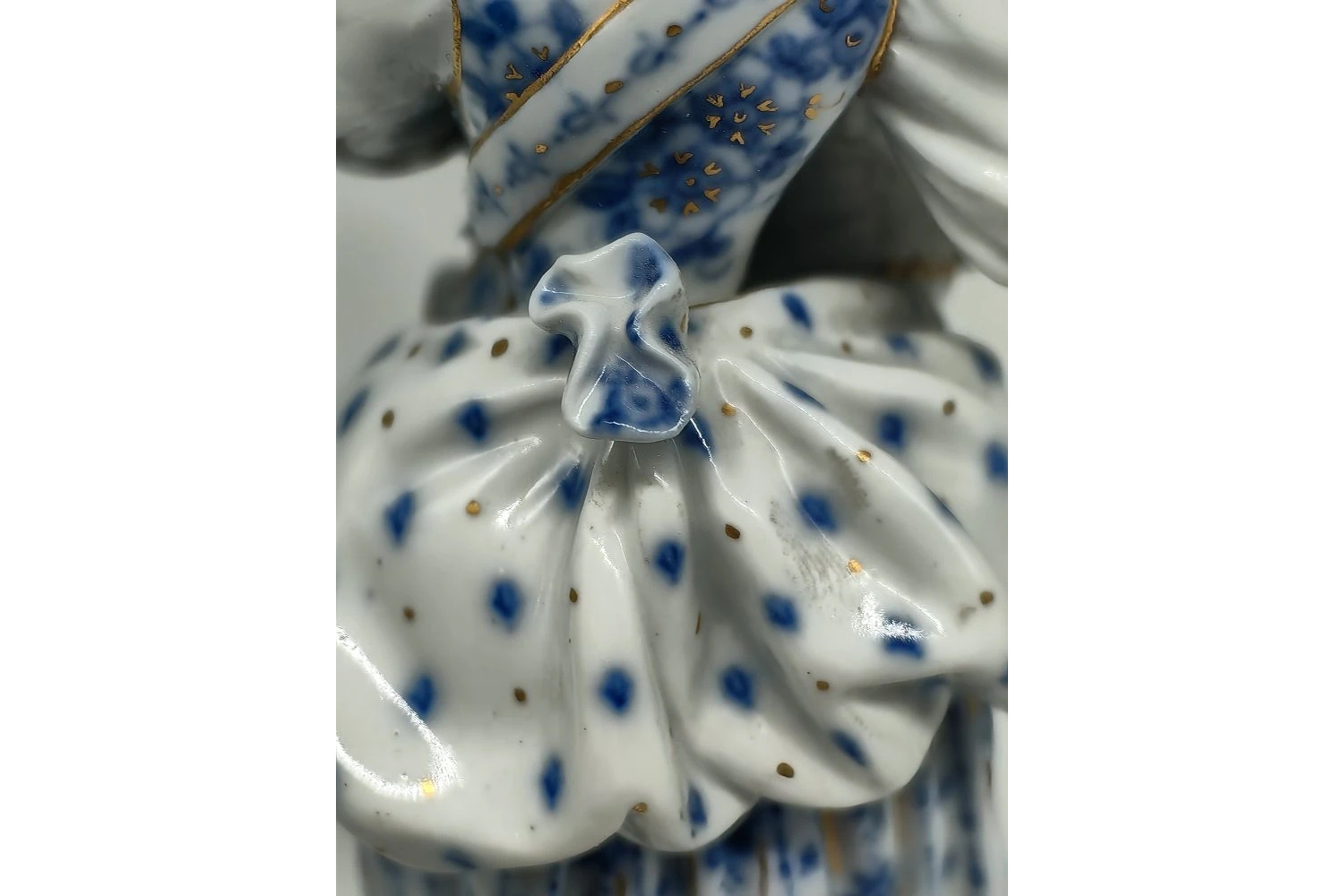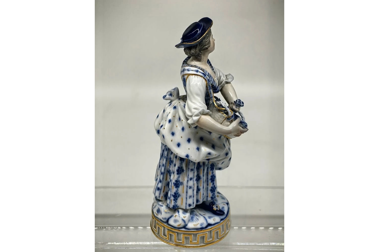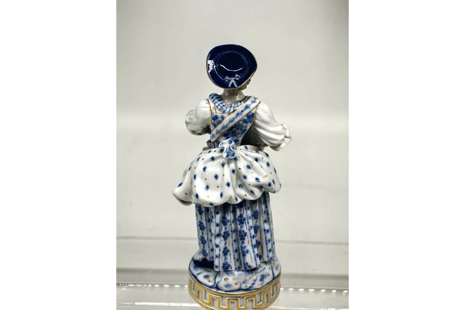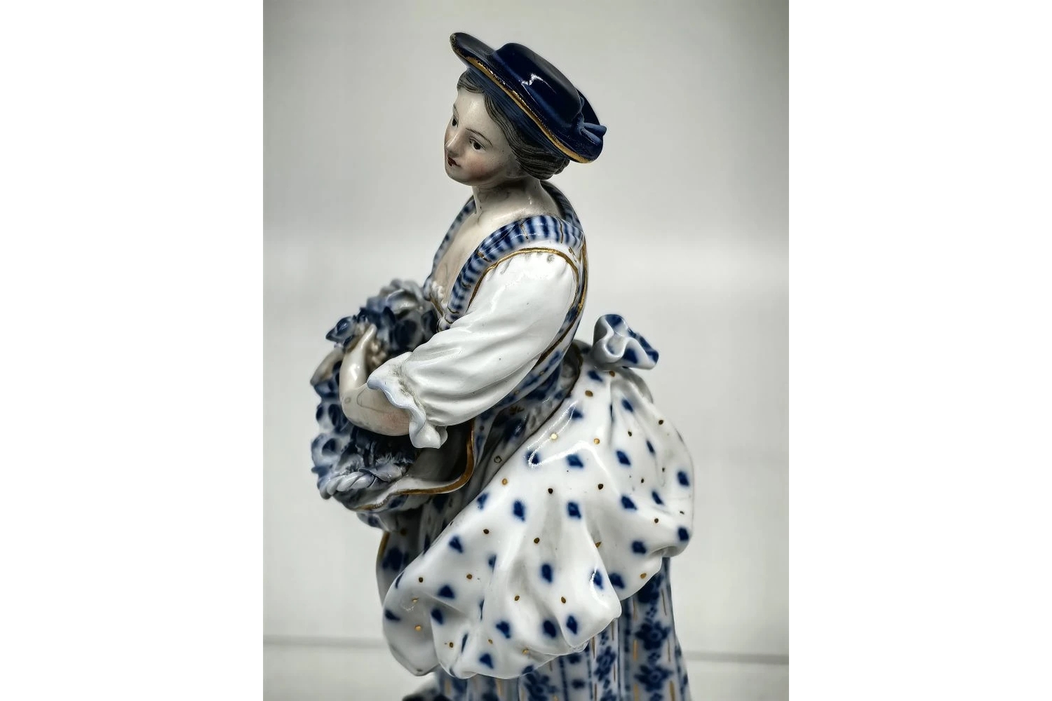 Изящная фарфоровая статуэтка мейсенской мануфактуры — образец европейского фарфорового искусства XVIII–XIX веков. Высота — 18 см. Изображает даму в элегантном платье эпохи рококо с букетом роз в руках. Выполнена из белоснежного твёрдого фарфора с подглазурной голубой росписью: тонкие линии подчёркивают складки платья, локоны причёски и лепестки цветов. Подглазурное клеймо — перекрёстные мечи синего цвета, чётко читаемо. Отличное антикварное состояние: без повреждений, сколов и реставраций, роспись сохранилась в первозданном виде. Уникальный артефакт, отражающий мастерство мейсенских мастеров и эстетику галантного века. Подходит для частных коллекций, музеев и ценителей европейского фарфора.