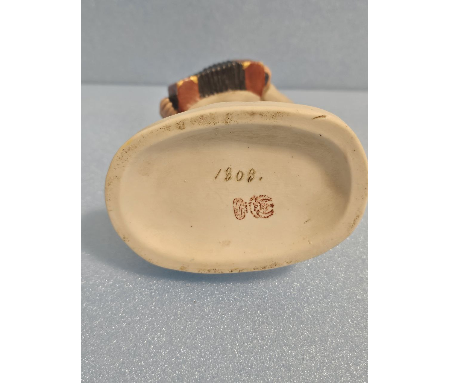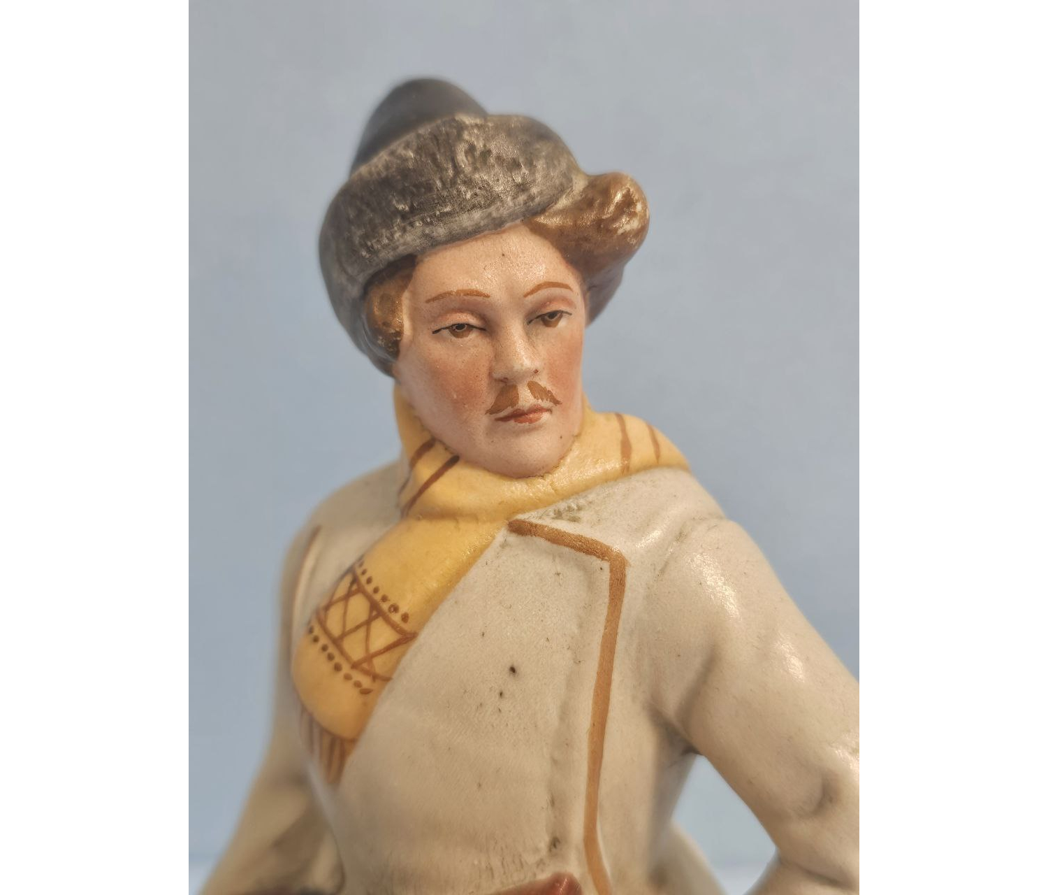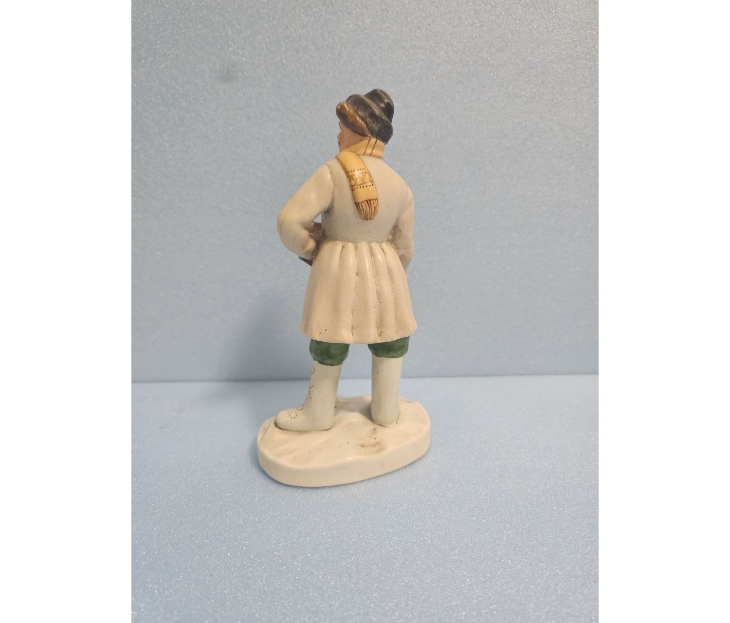 Статуэтка украшена рельефными элементами, такими как складки ткани и узор на инструменте, придающими ей дополнительную объемность и живость восприятия. Изделие прекрасно сохранилось, отсутствуют сколы, трещины и потертости, что свидетельствует о бережном обращении предыдущих владельцев.