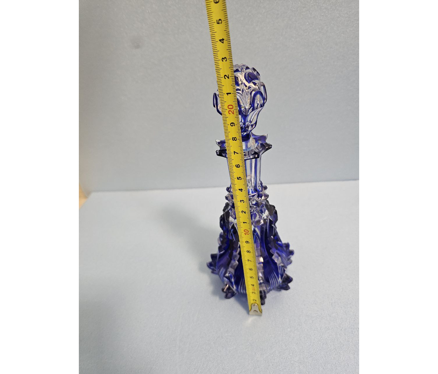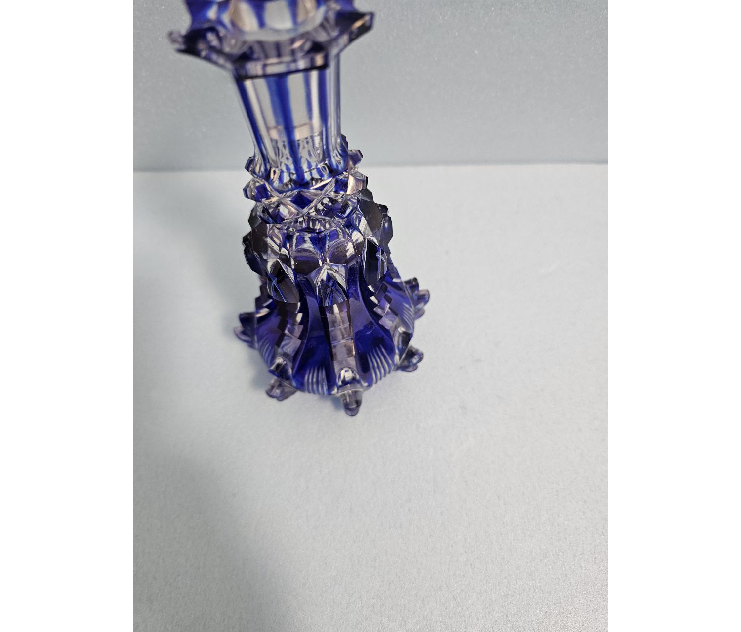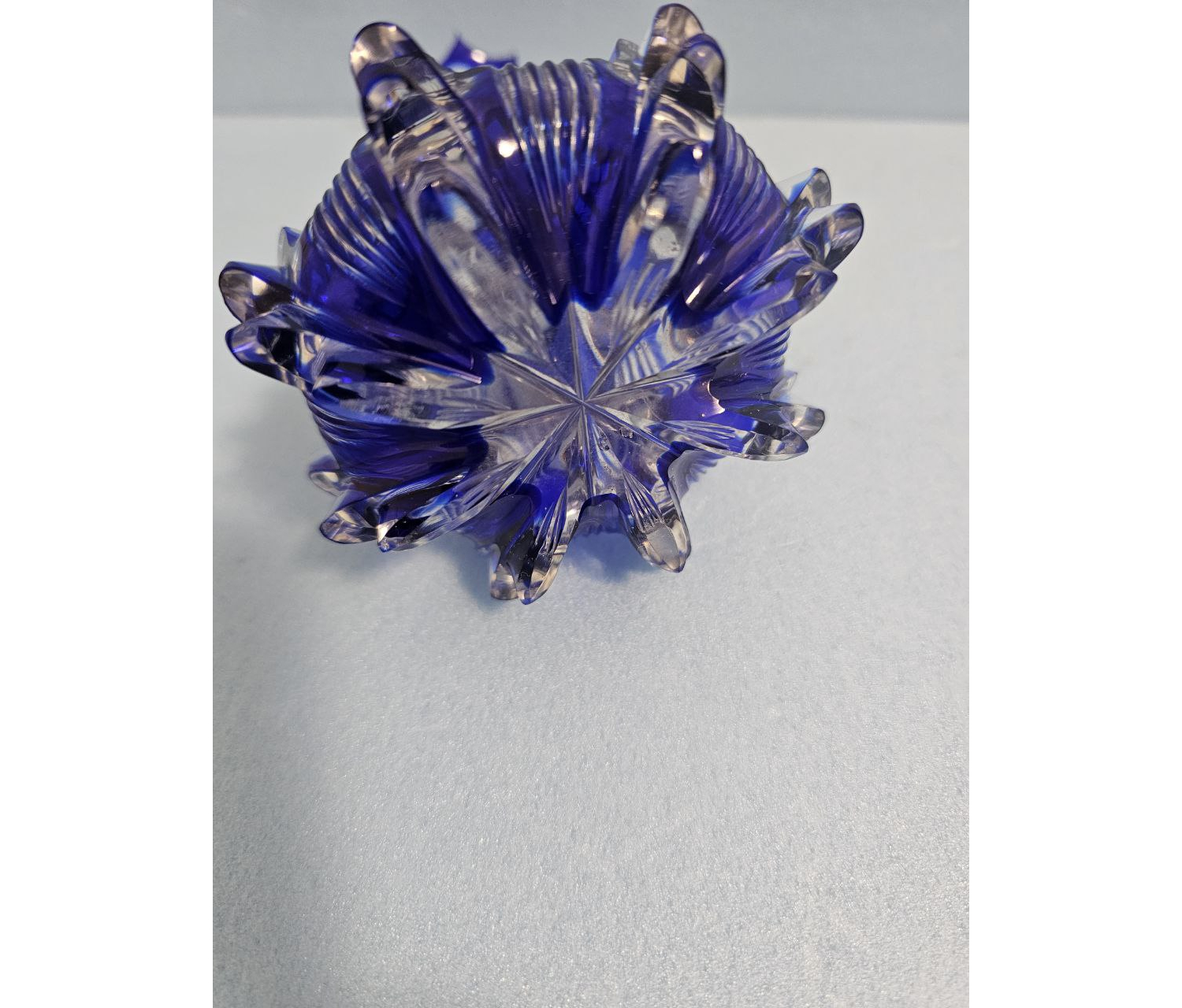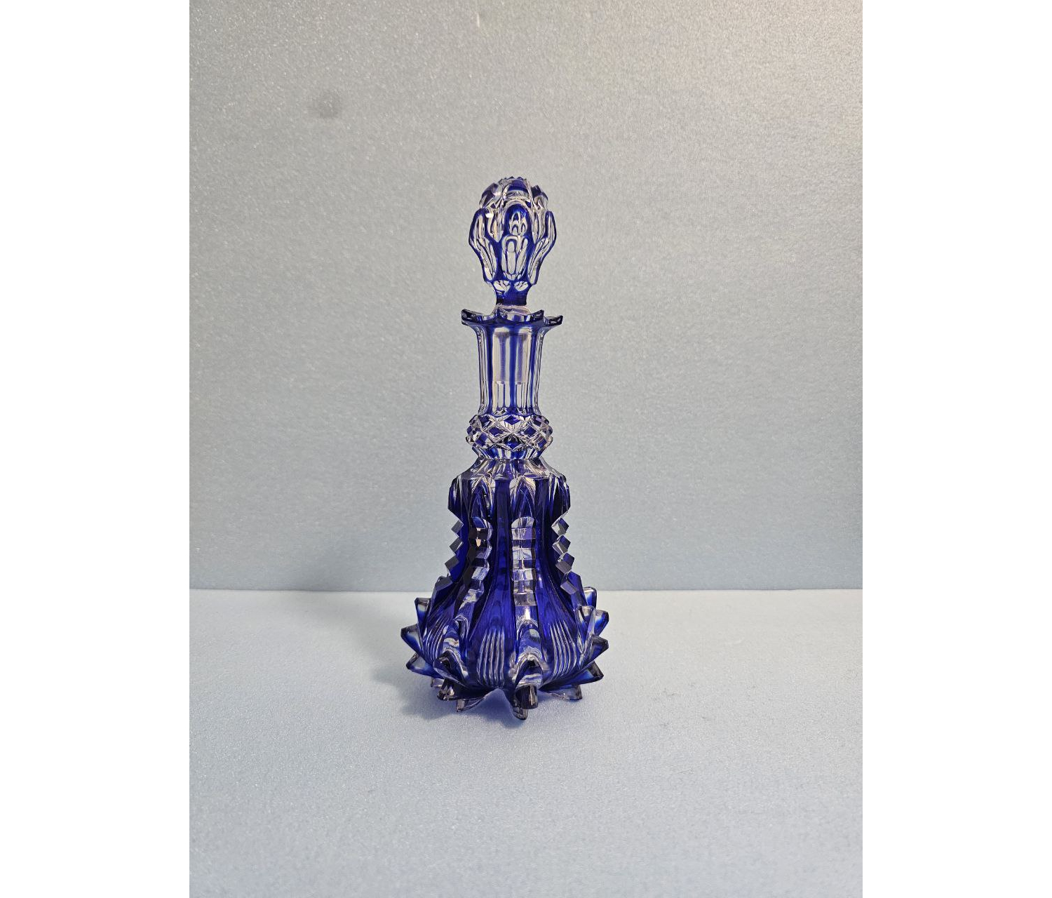 Его красота заключается в сочетании классической простоты и изысканности, присущих лучшим произведениям стекольного искусства прошлых эпох. Прозрачность материала, переходящего от глубокого тёмно-синего оттенка к более светлым тонам, создаёт игру света и тени, делая каждый взгляд на этот предмет особенным событием.