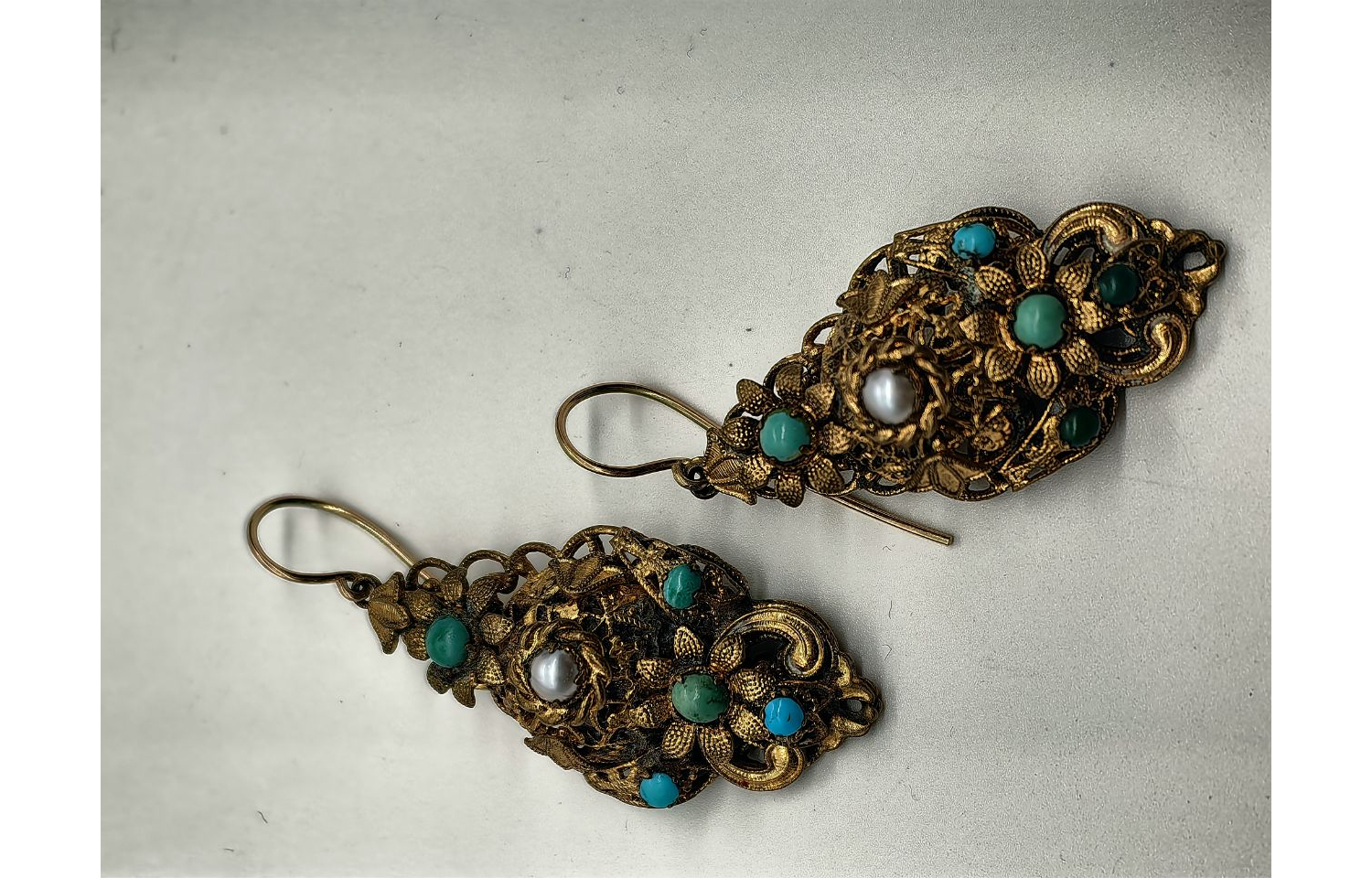 Антикварные серьги (XIX век). Позолота, жемчуг и бирюза