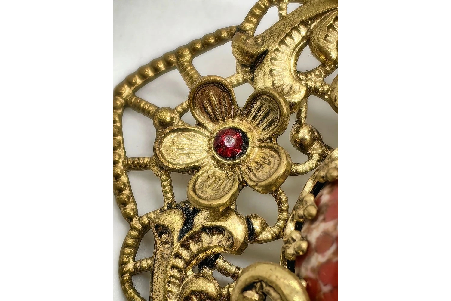 вставки — пекинское стекло (особый тип художественного стекла с высокой прозрачностью и насыщенностью цвета, популярный в бижутерии XX века);