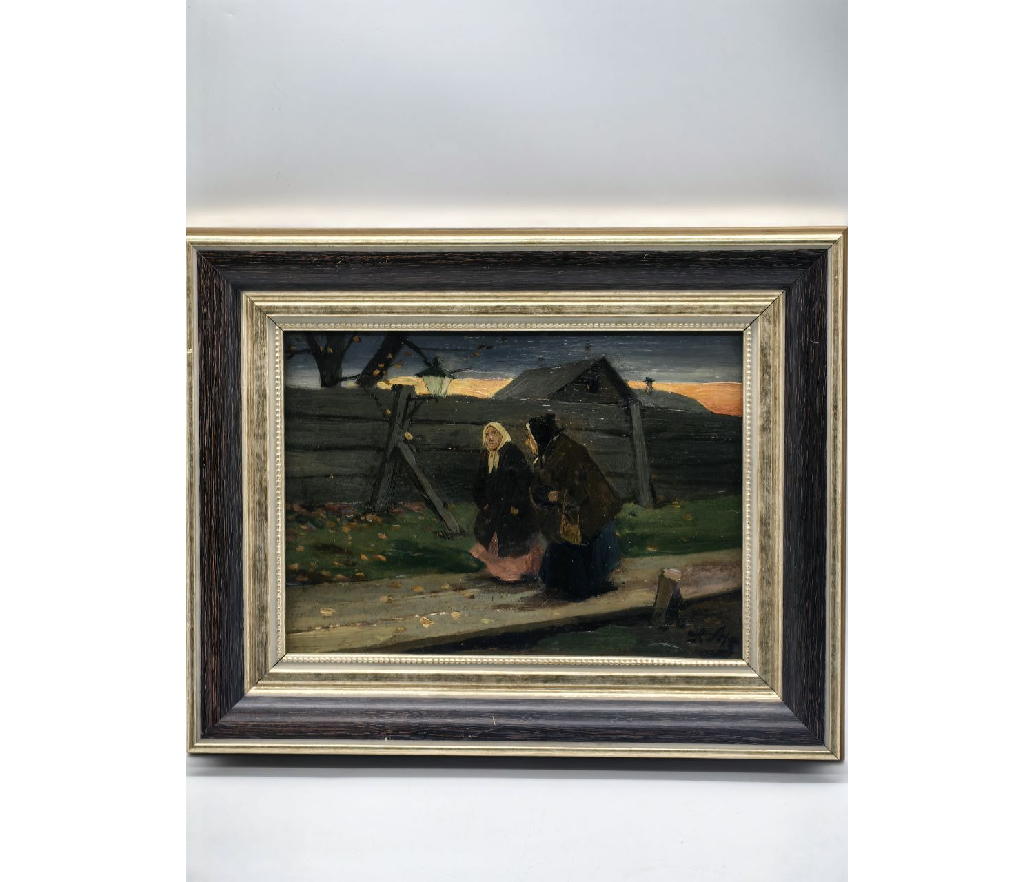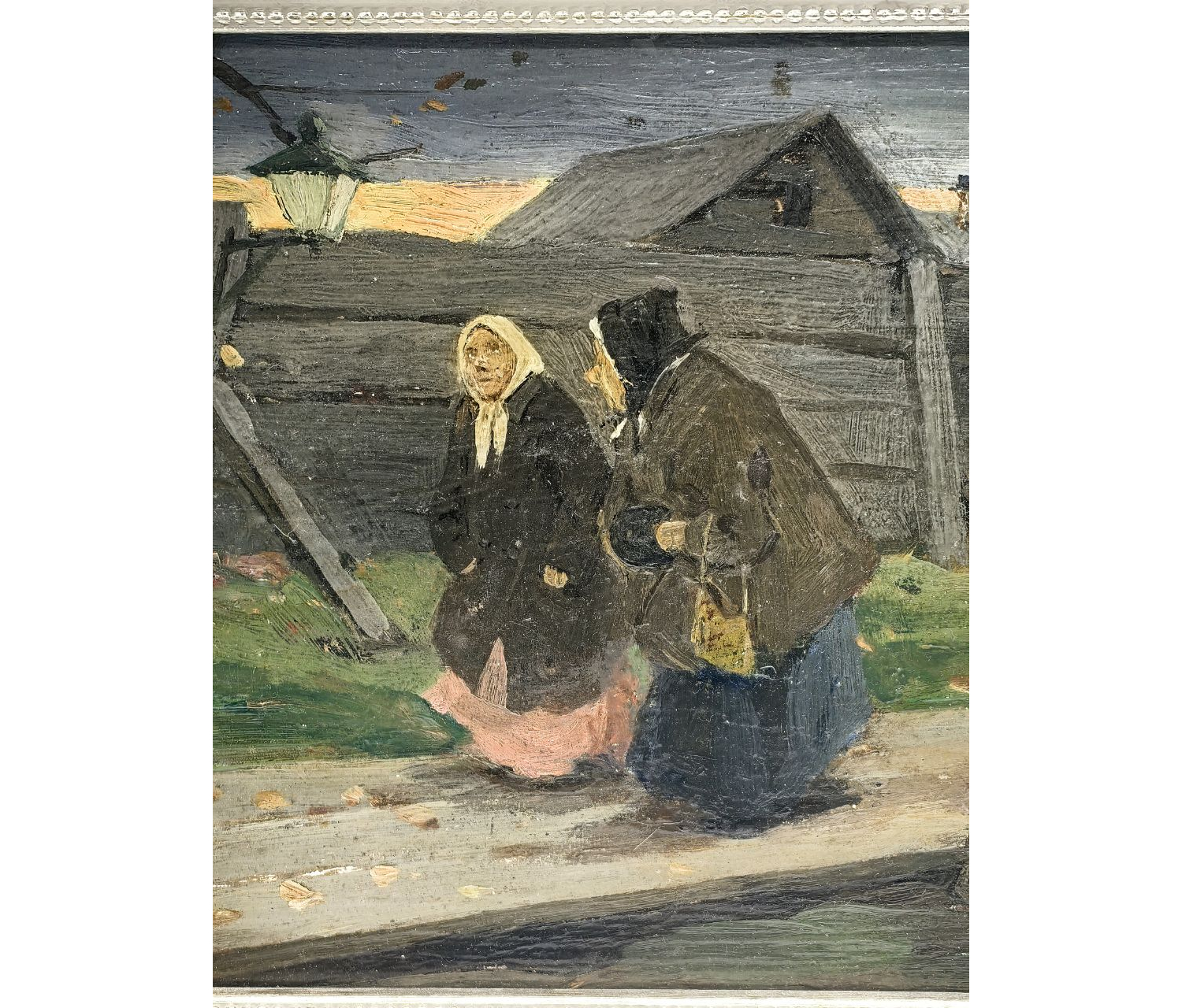 Представляю вашему вниманию камерную работу Алексея Фёдоровича Афанасьева (1850–1920) — картину «Старушки» 1910 года. Это произведение выполнено маслом на картоне, что типично для этюдов и небольших композиций художника. Формат — 18 × 25 см: удобен для размещения в домашней коллекции и позволяет сосредоточиться на тонких психологических нюансах.